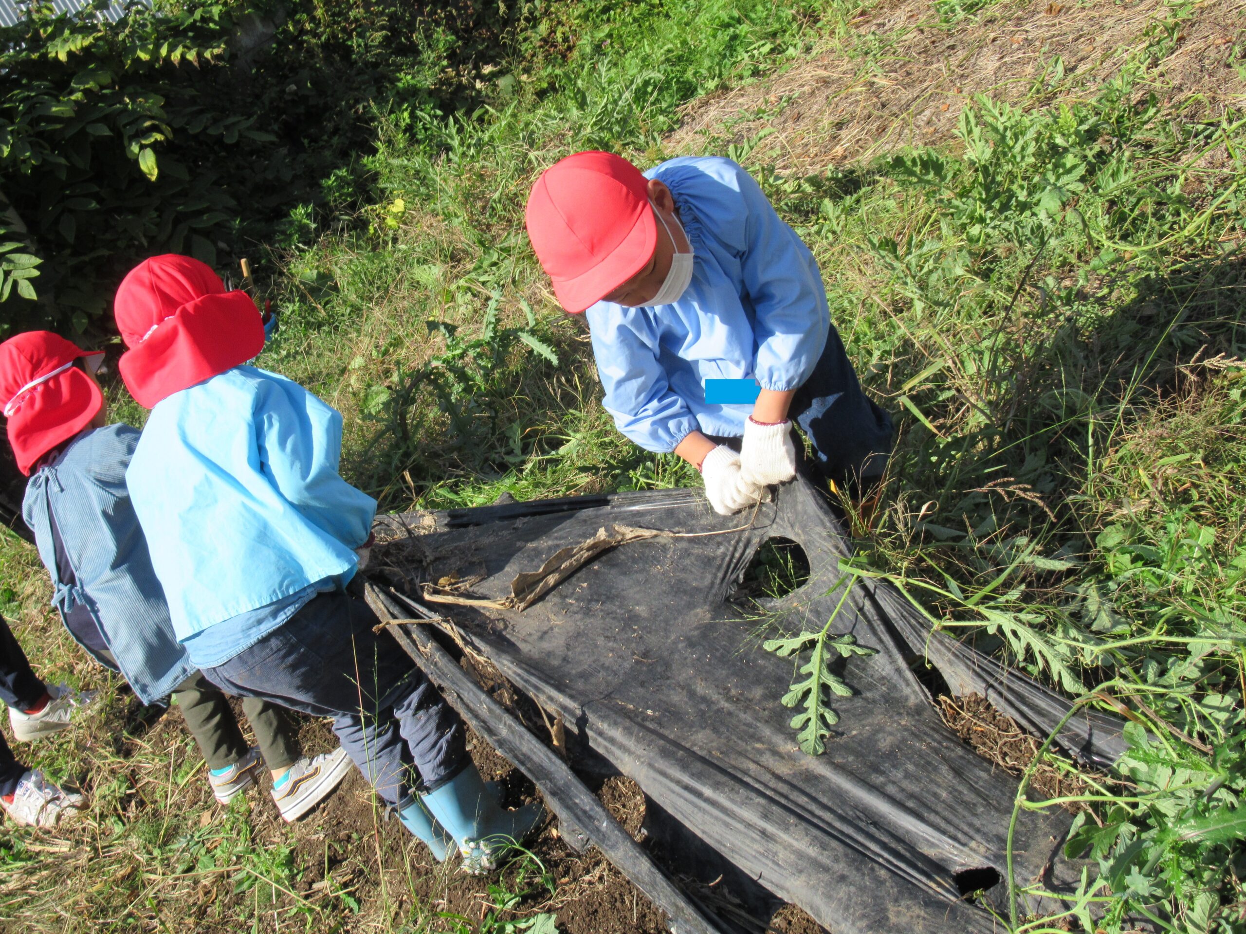 まだまだ伸びていたスイカやかぼちゃの茎を引っ張って取ったり、下に敷いていたワラを集めたりと、大変な作業でしたがみんな楽しみながら頑張っていましたよ。