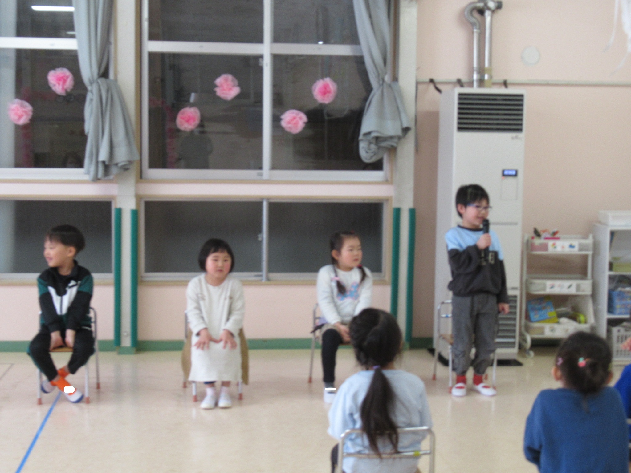 まずは幼稚園で楽しかったこと、はと組さんとの思い出発表です。