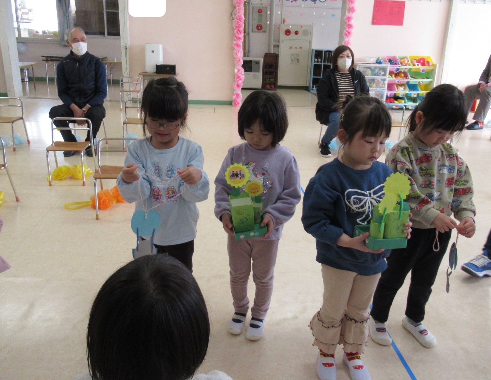 次は「ありがとう💛」 と 「おめでとう💖」の気持ちを込めて、ひまわりの鉛筆たてとトトロのペンダントをプレゼントしました。はと組さんは嬉しそうにニコニコしていましたよ。