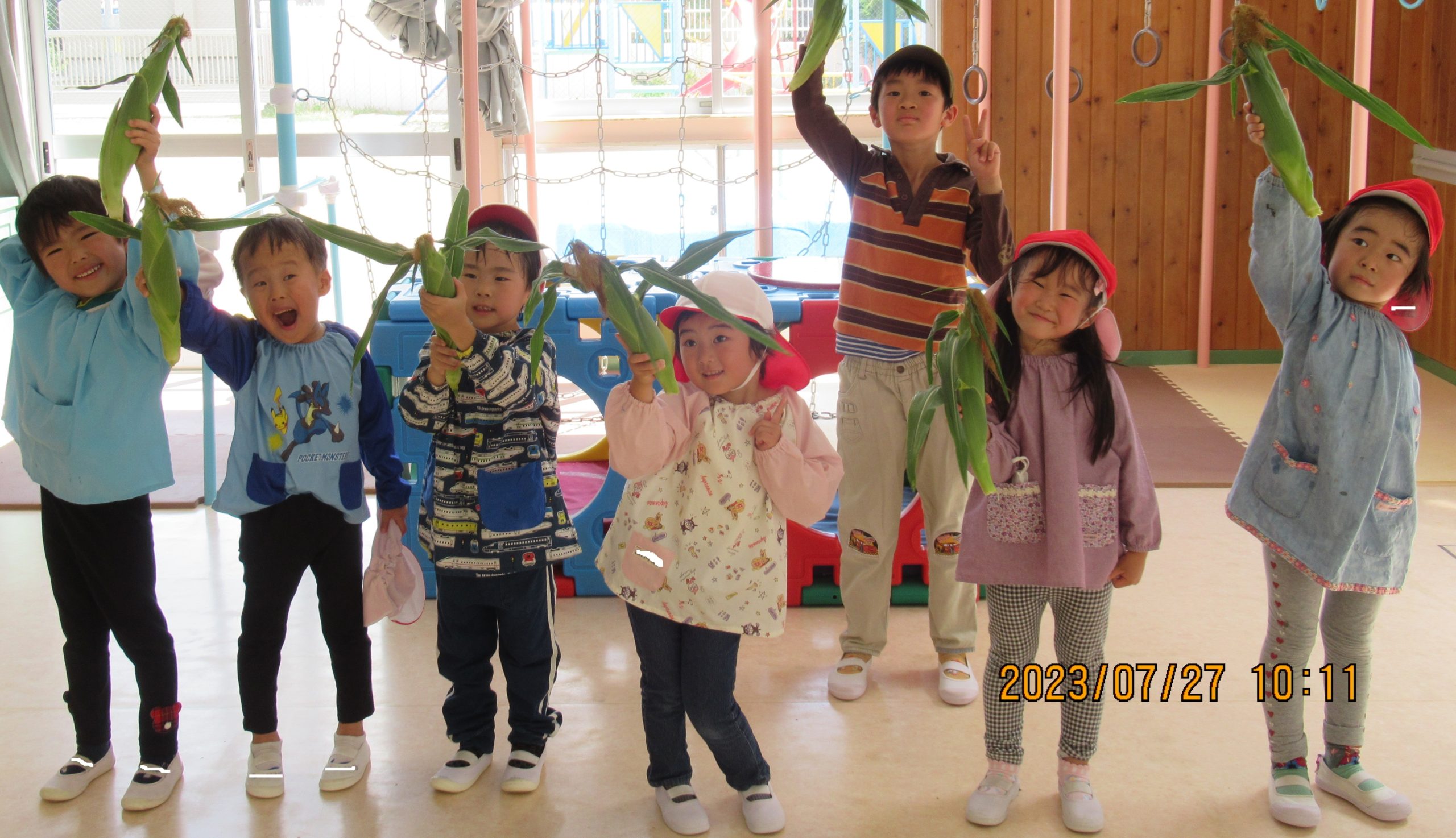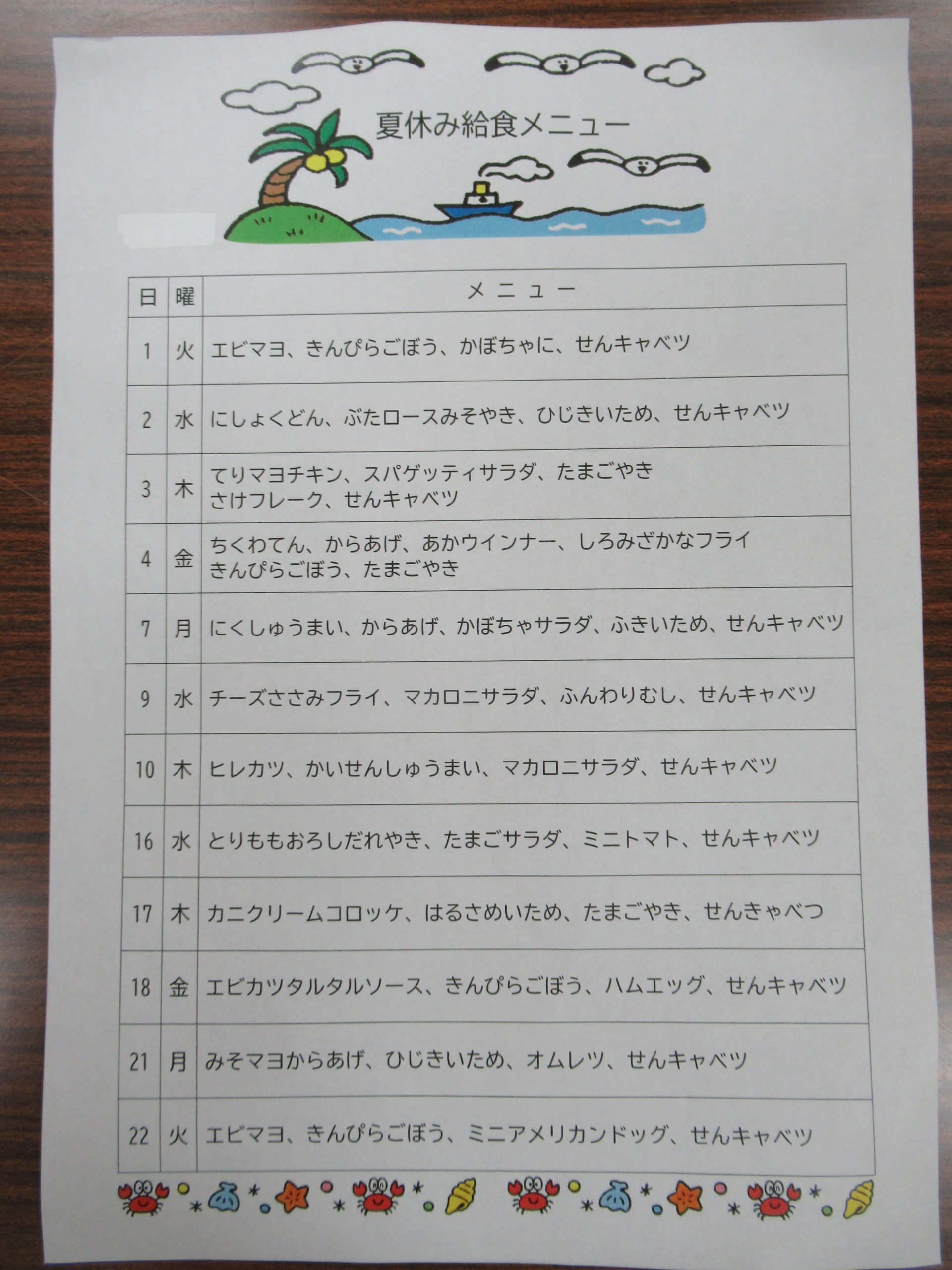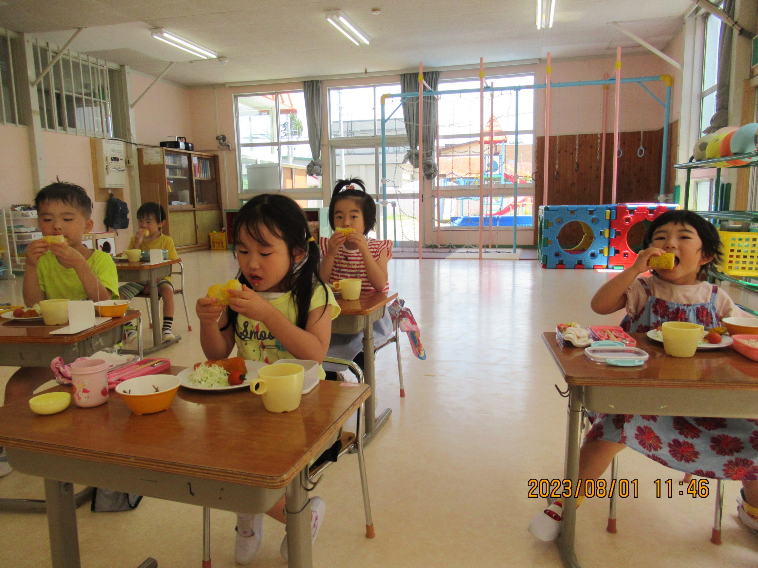 夏休みの給食メニュー(8月) 2023年8月2日お知らせせんせいたち 暑い日が続いていますが、みなさん元気に楽しい夏休みを過ごしていますか? 幼稚園では・・・預りのお友だちが、 砂場に水をためて遊んだり、大きなプールで水遊びを楽しんでいます! ハッピー畑の水やりや収穫も頑張っていますよ。先日トウモロコシを収穫しました。甘くてとっても美味しかったですよ🌽 すいかも大きくなってきているので、2学期に収穫をしてみんなで食べようね🍉 夏休みの給食メニューです!(8月)