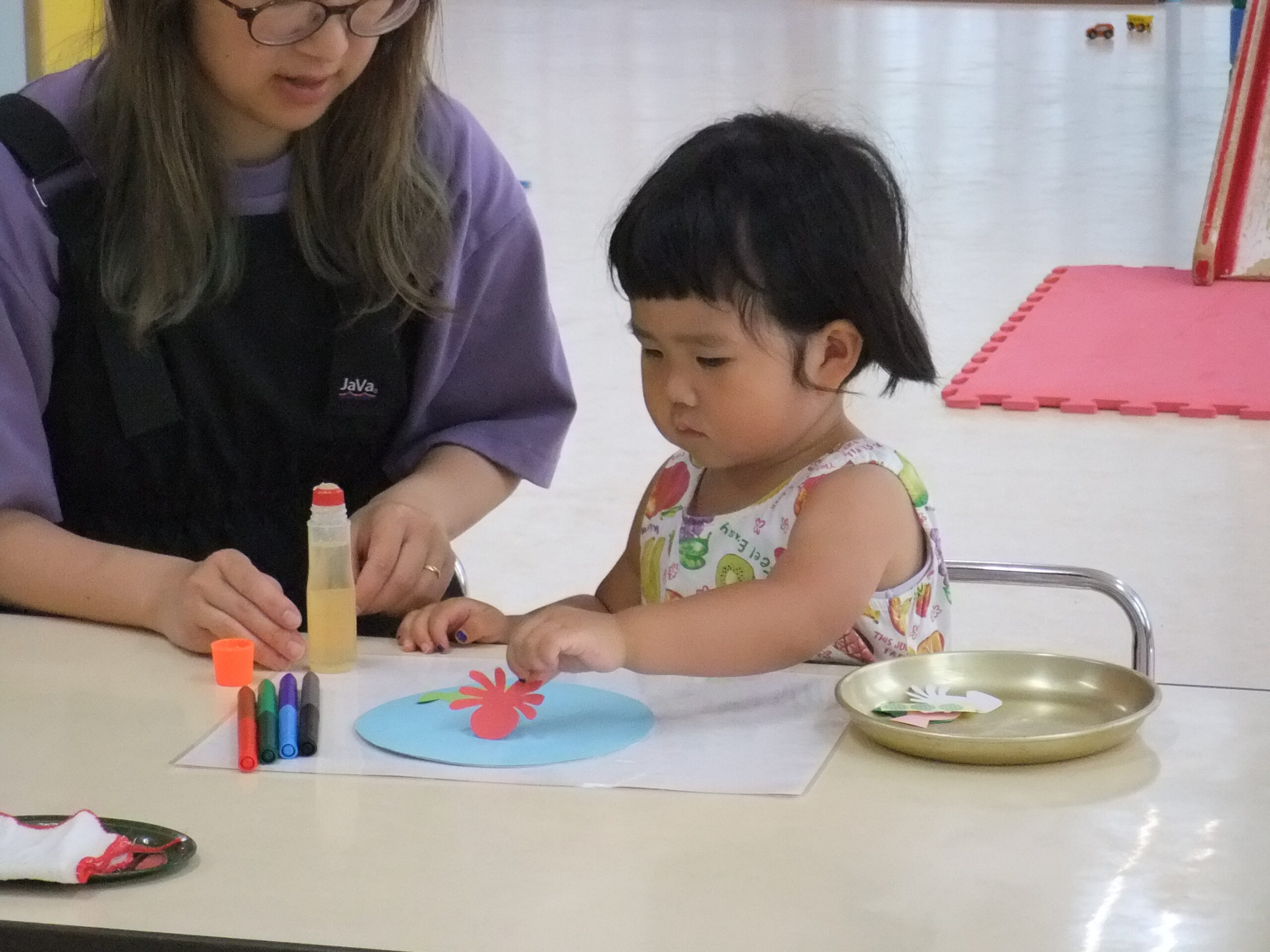 7月20日(土)は幼稚園の夏祭りです。プチひまわりのお友だちも一緒に夏祭りに参加してみませんか?今日作ったうちわがアイスの引換券になるので、忘れずに持って来てね。
