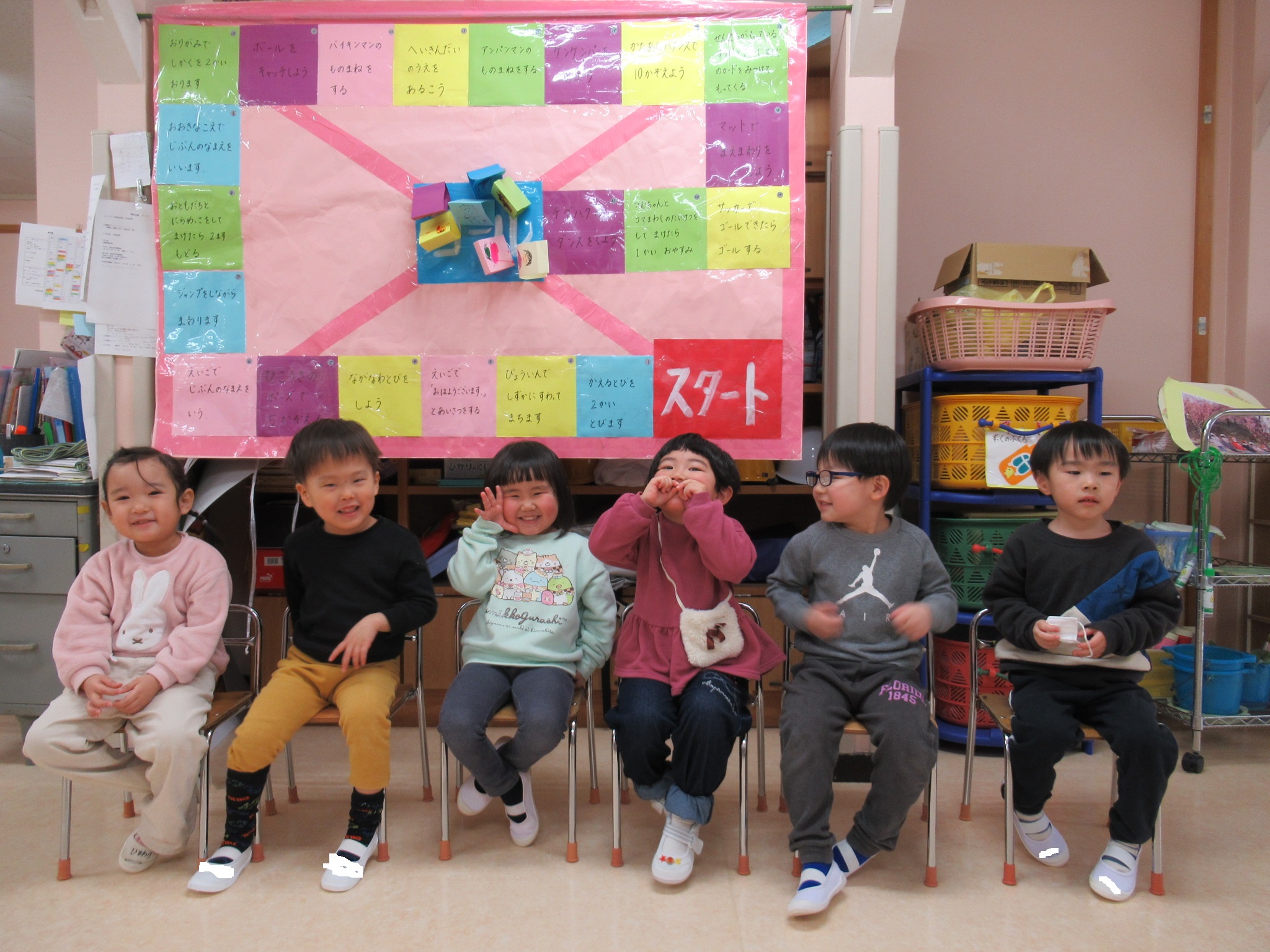 参観日では、子ども達が自分のカラーを決め一年間で出来るようになったことや今できることをみんなで話し合って決めて作った「すごろく遊び」でした。そのひゴールがかなわなかったので、後日全員でさいころを転がして、みんなでゴールする事ができました。