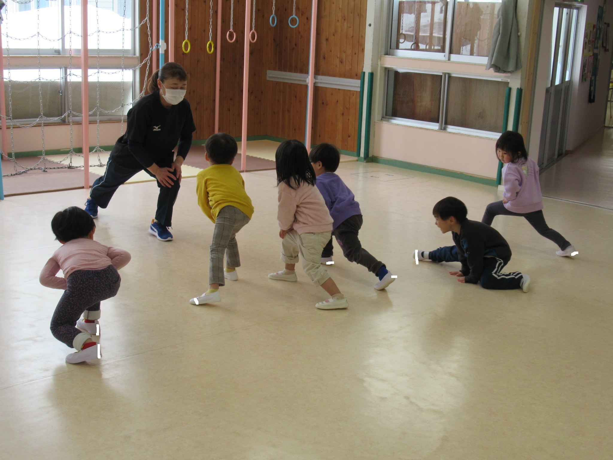 今年度最後の奈良先生との体操遊びは、新しいお友だちも一緒に楽しめる内容で体を動かして遊びました。