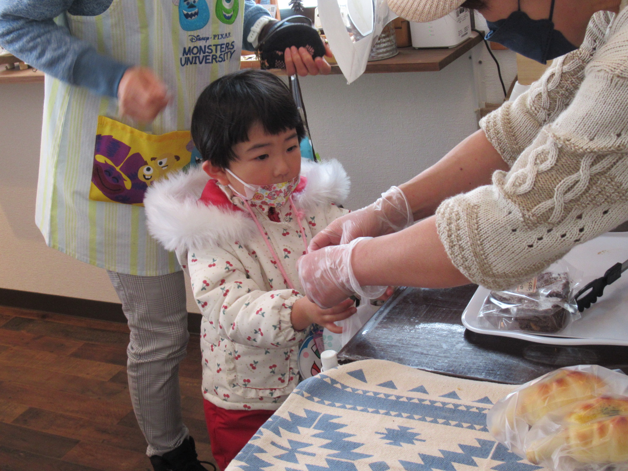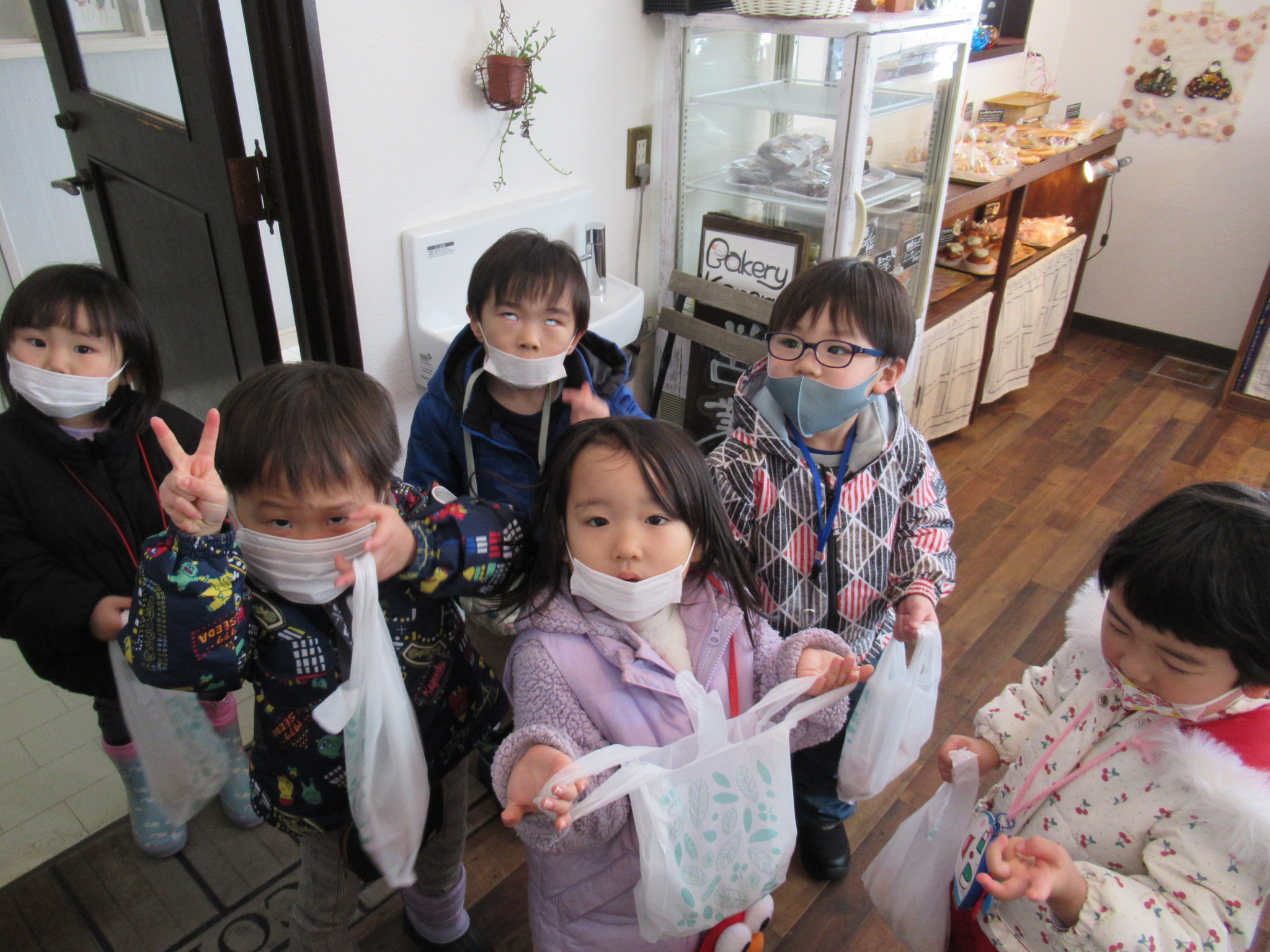 うさぎ組さんと一緒に「ベーカリーkoneru」さんへお買い物体験に行ってきました。カレーパン、チョココロネ、ザクチョコ、メロンパン、ウインナーパンを購入しご満悦で園に戻ってきました。ひよこさんが選んだパンは、キャラクターものがなく大人が選ぶような?パンが多かったようです。