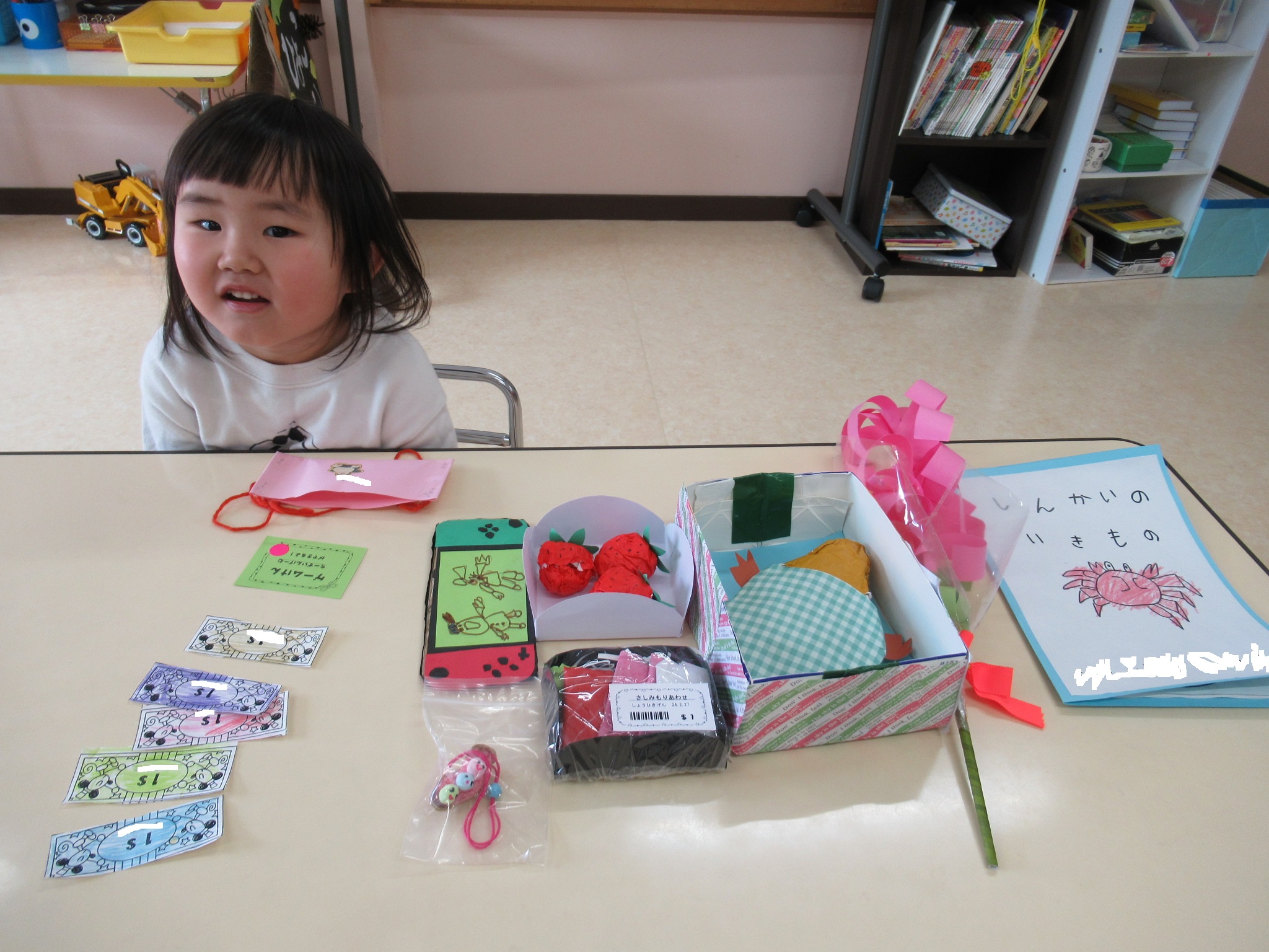 子ども達は、自分で作ったお財布に1ドル紙幣を5枚入れワクワク、ドキドキ、お買い物を楽しみました。