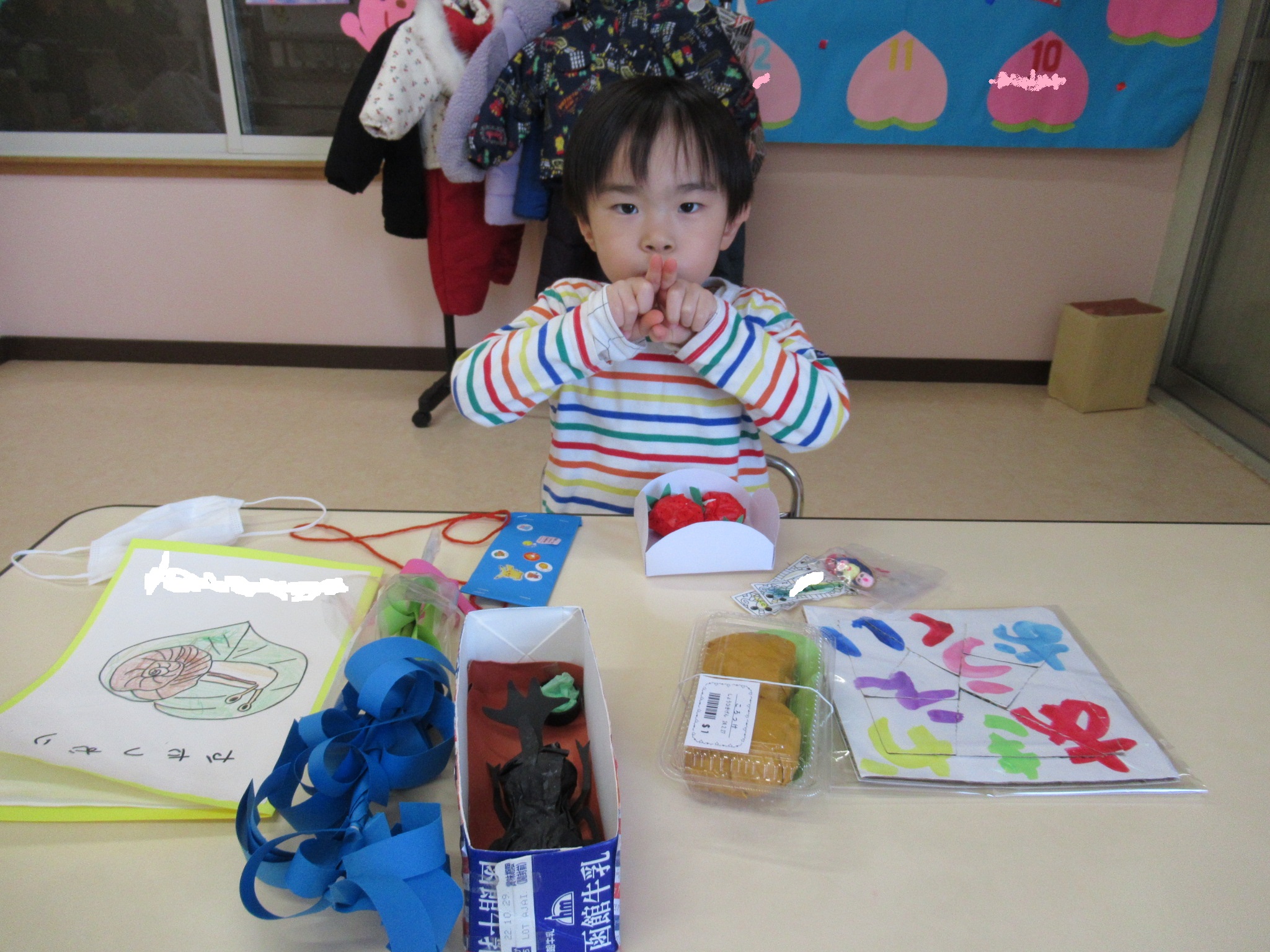 当日ご参観がかなわなかったお家の方もいらっしゃったので、お部屋に展示していた子ども達の作品をこの場をお借りして紹介いたします。