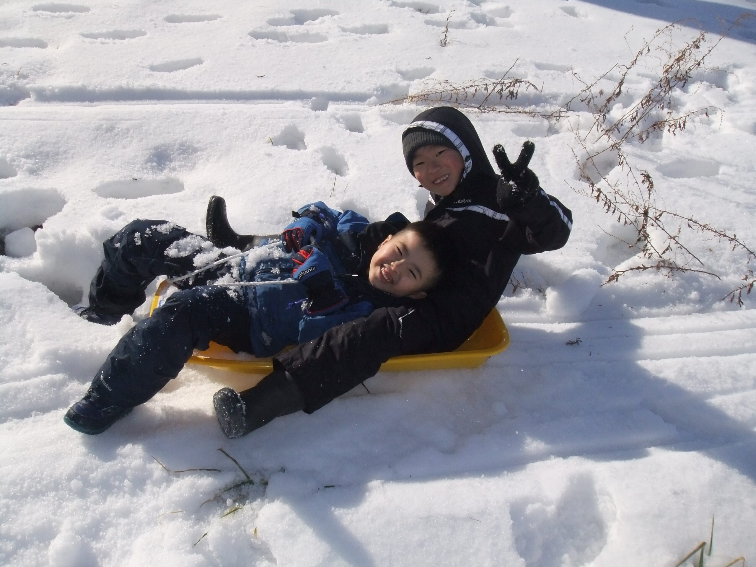 川側はもう雪が溶け草が見えていましたが、神社側の方は雪が残っていて、みんなでソリ遊びを楽しむことができました。