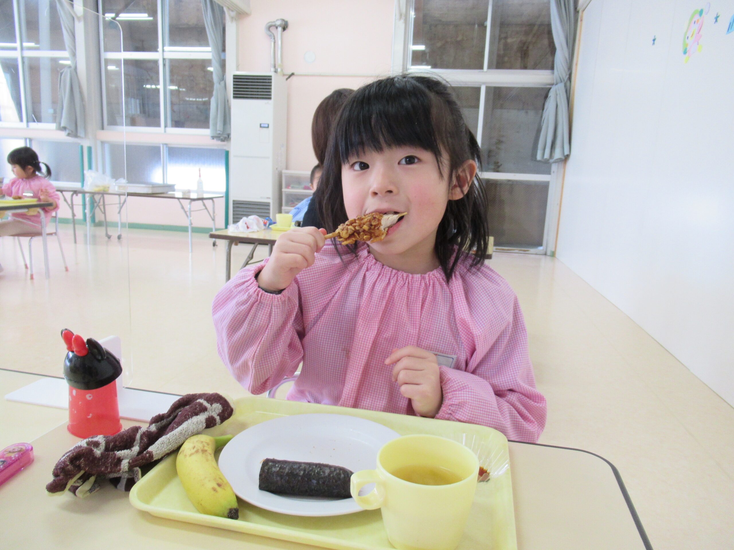 給食は、鶏の金棒スティックに恵方巻と、子ども達が楽しみにしていたメニューでした。