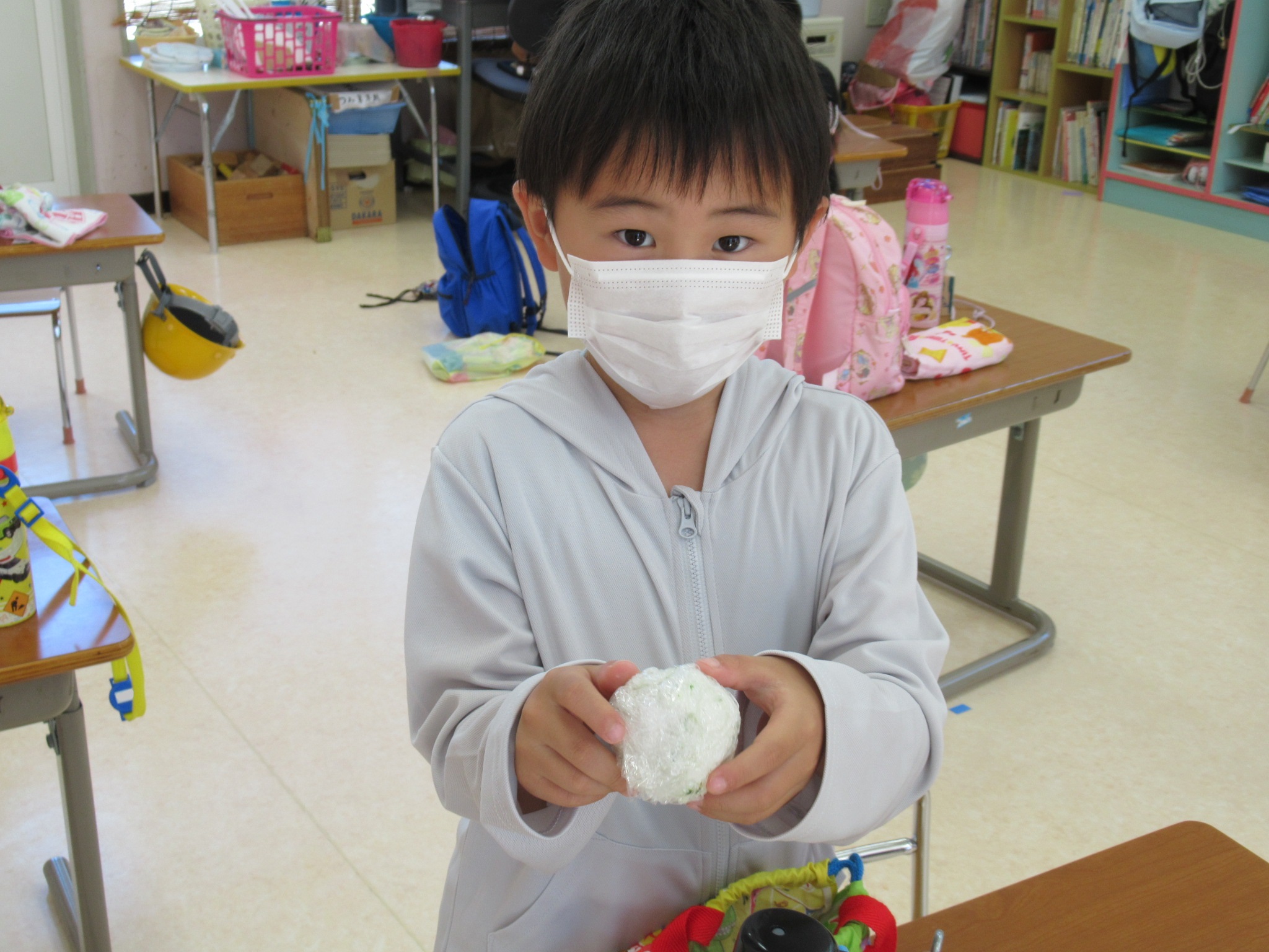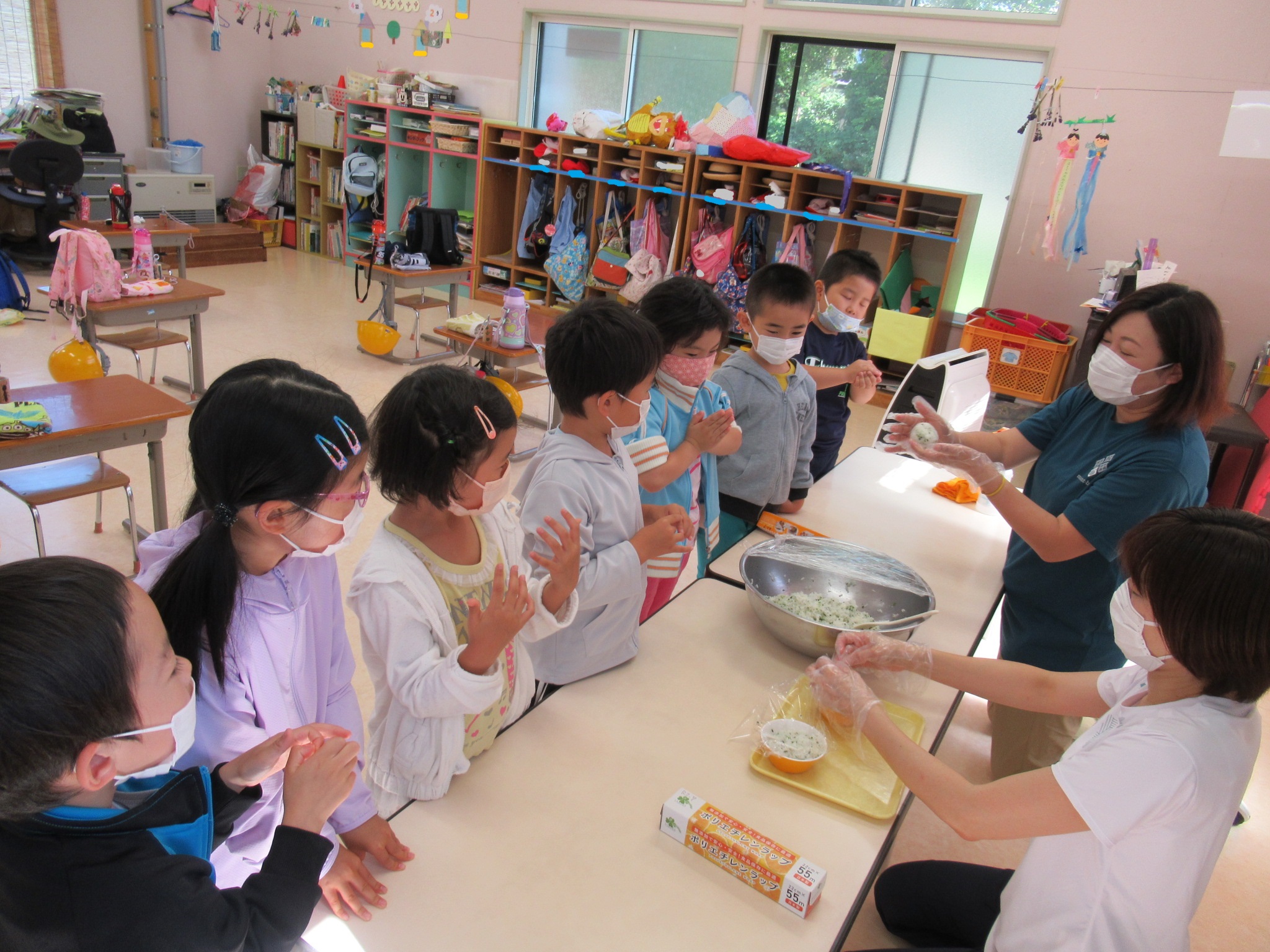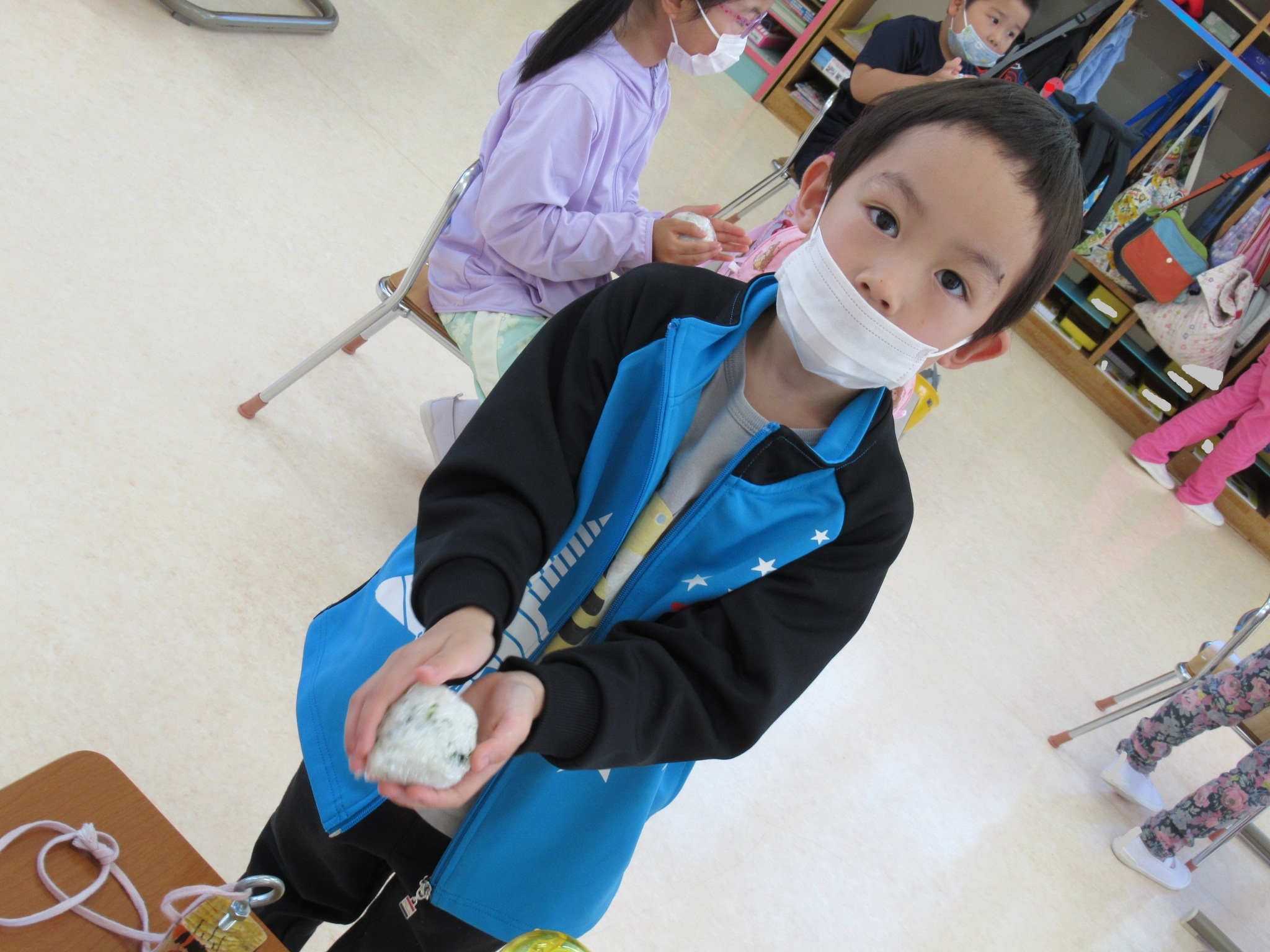 その後、お昼に食べる自分のおにぎり作りをしました。