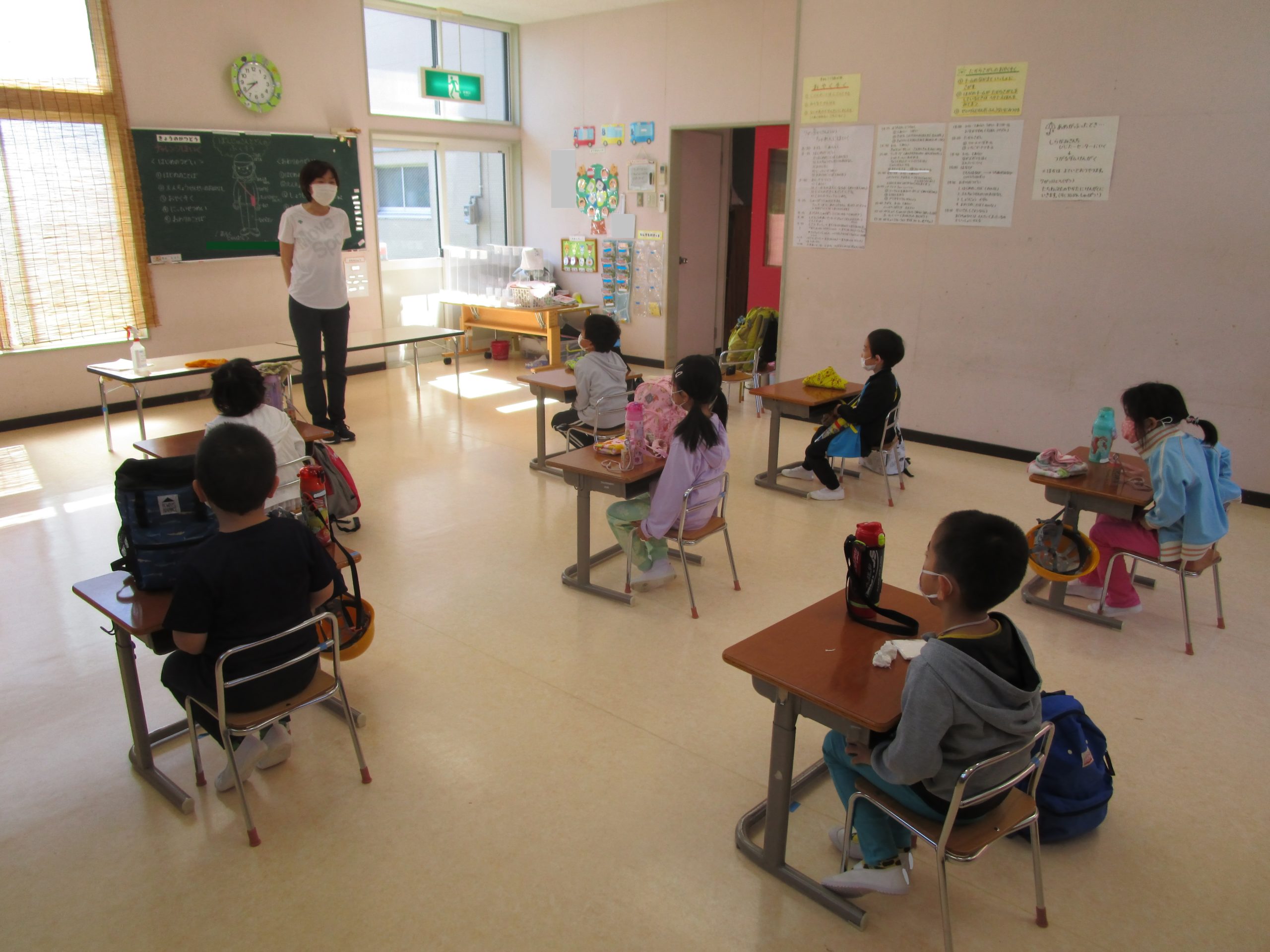 お部屋ではじめの集いを行い、一日の日程やお約束についてお話を聞いて