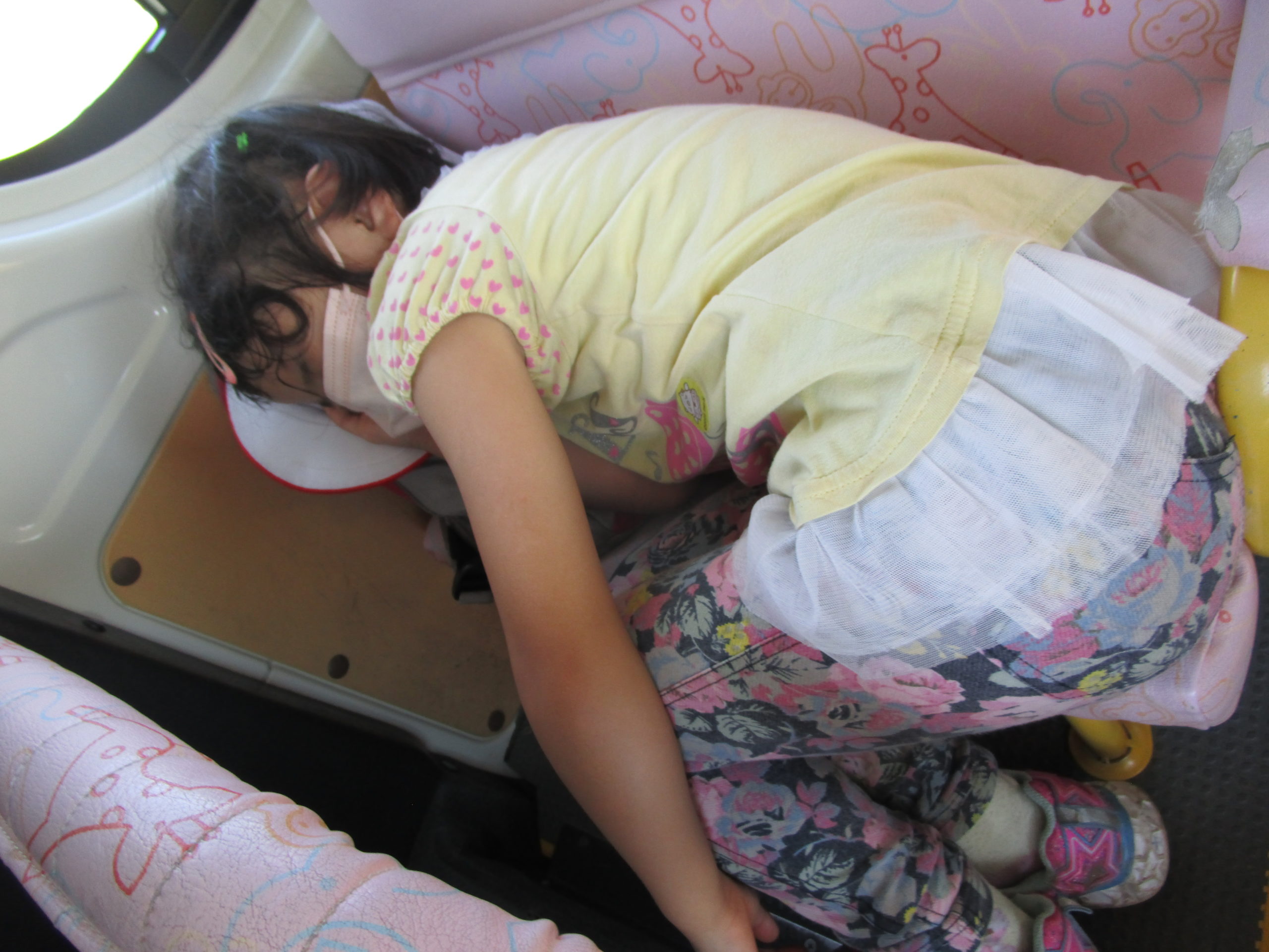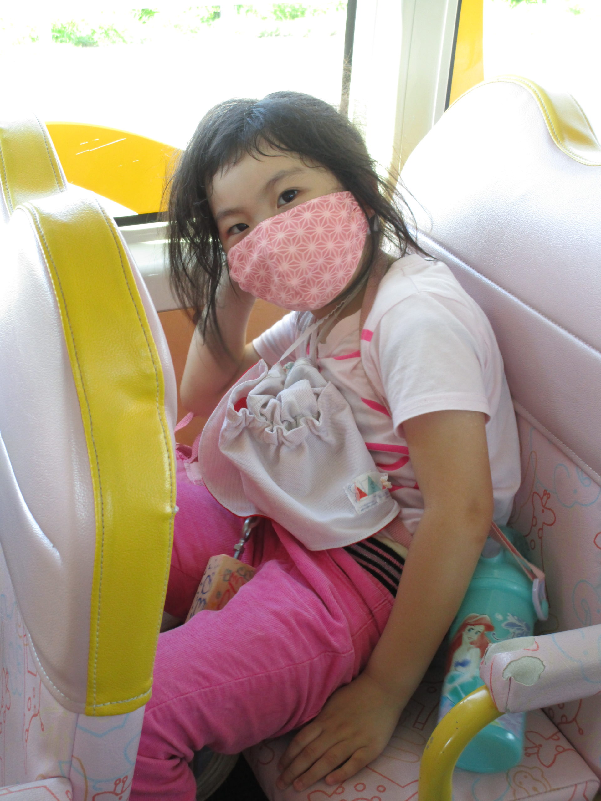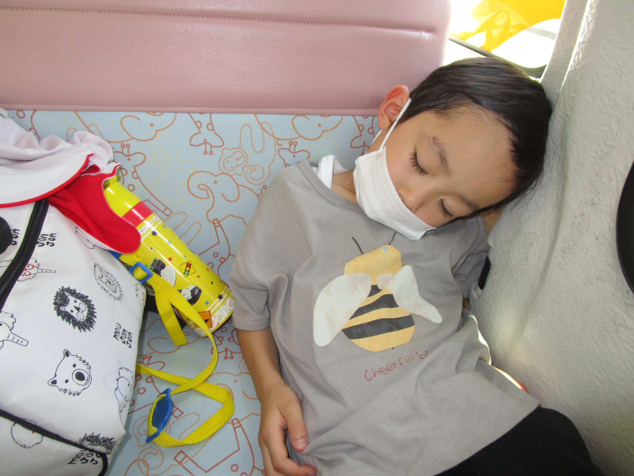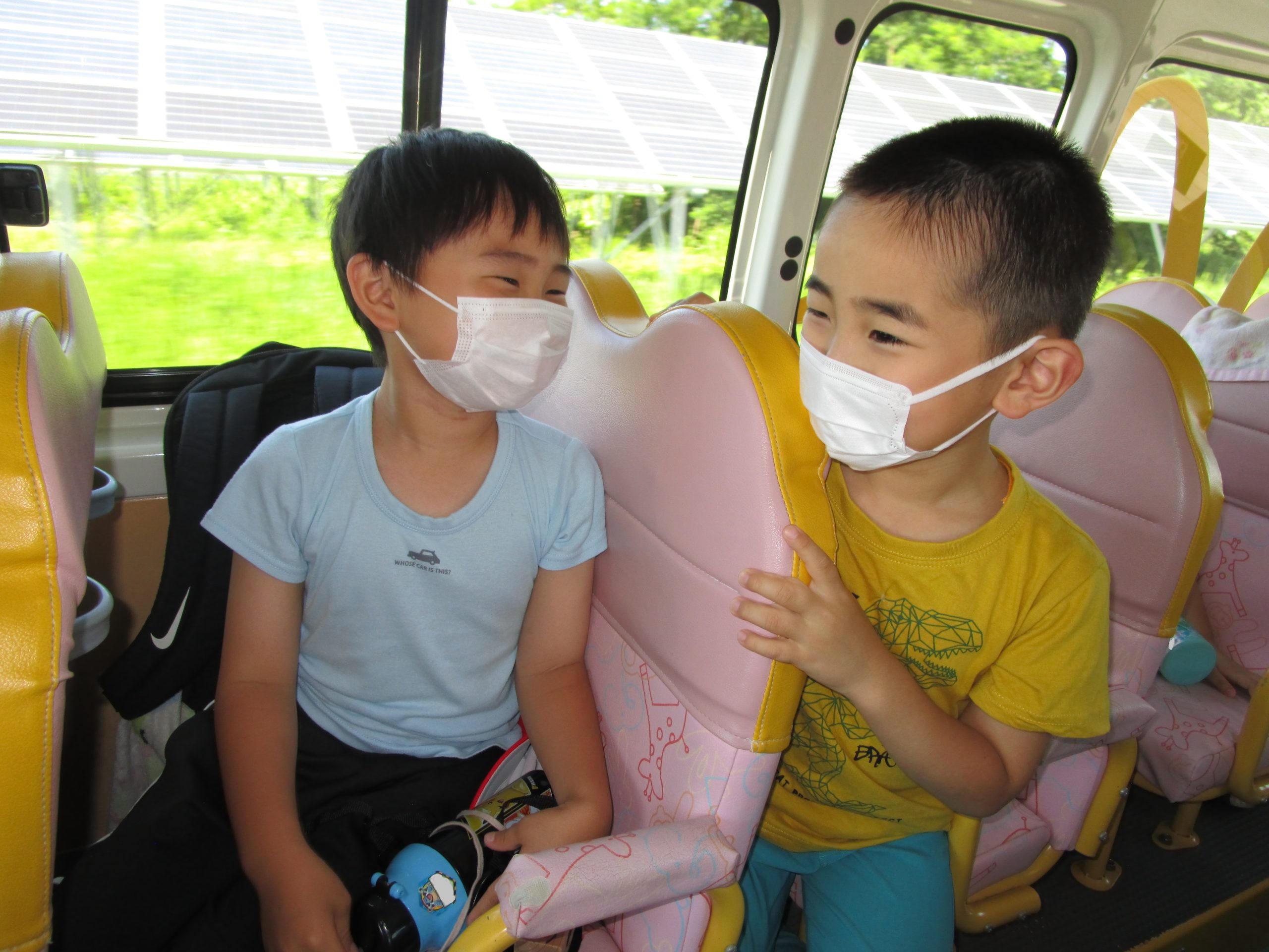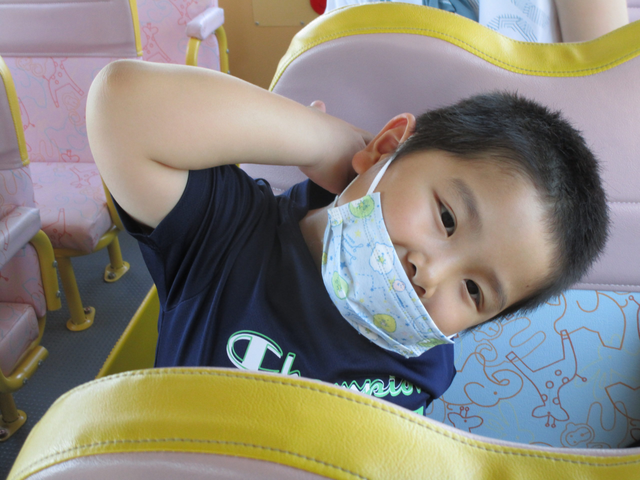 帰りのバスの中では疲れて眠る子、元気に友だちとお話をする子達。
