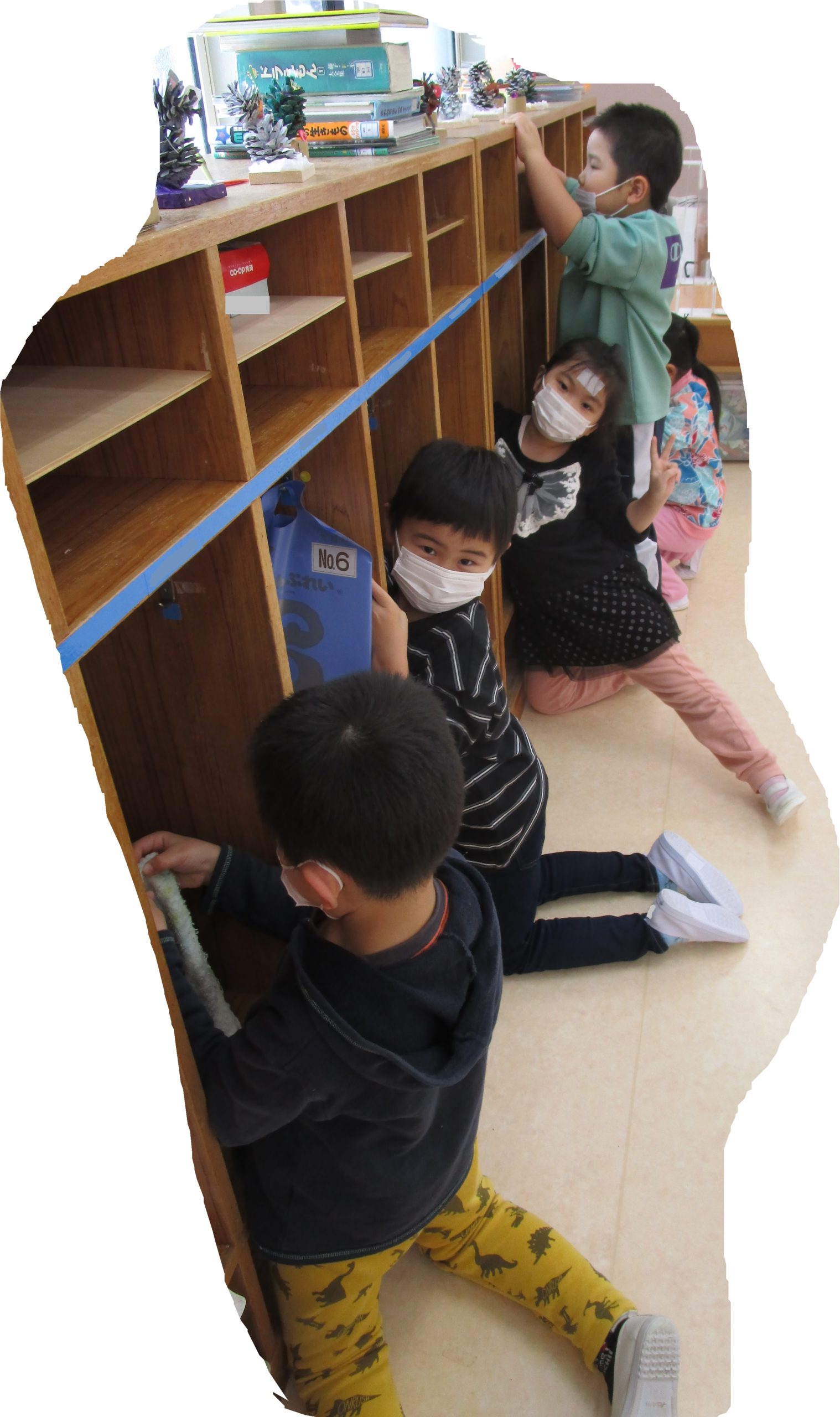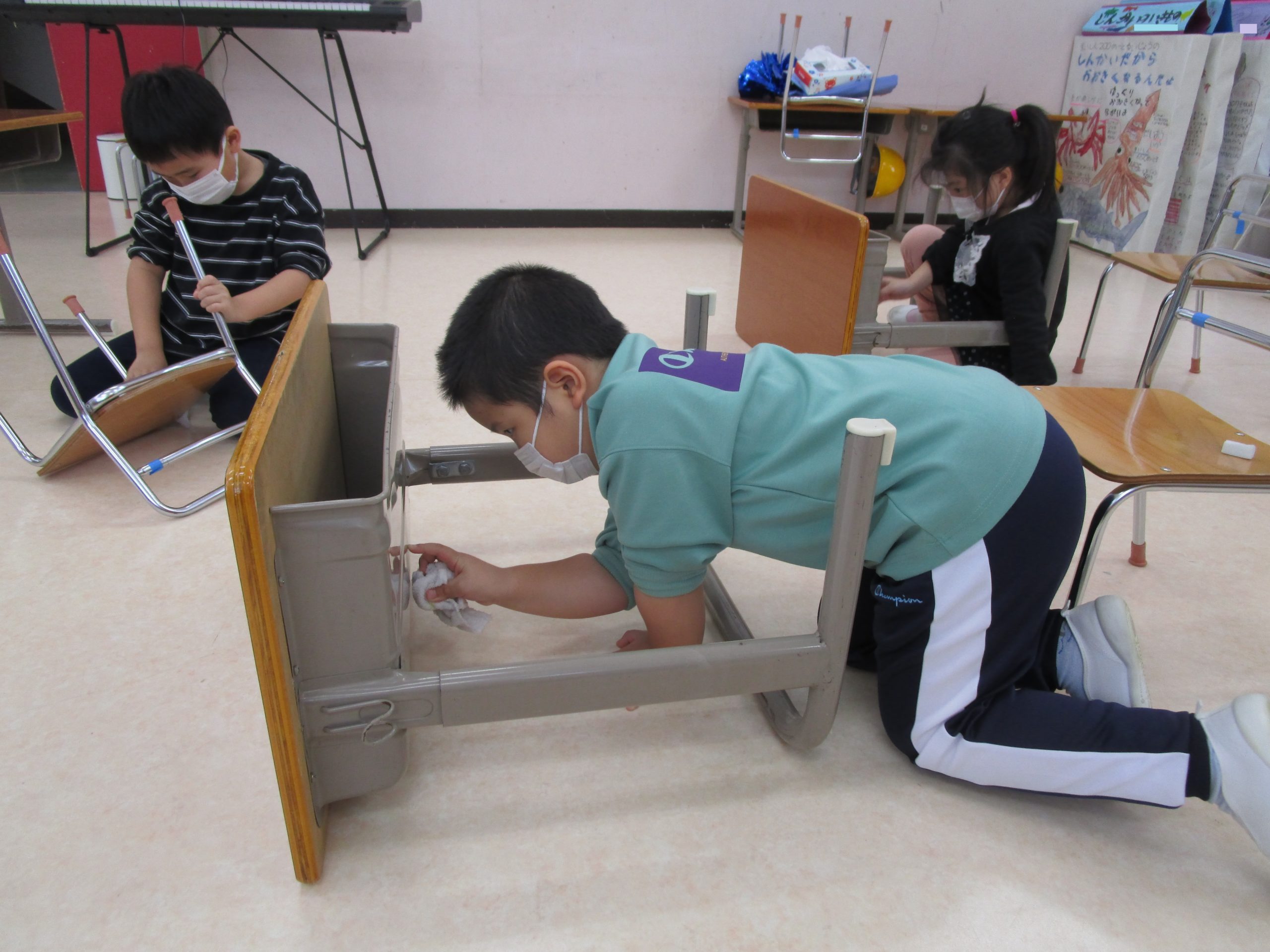 ロッカーから自分の荷物をすべて出して、丁寧に雑巾で拭いていた子ども達です。