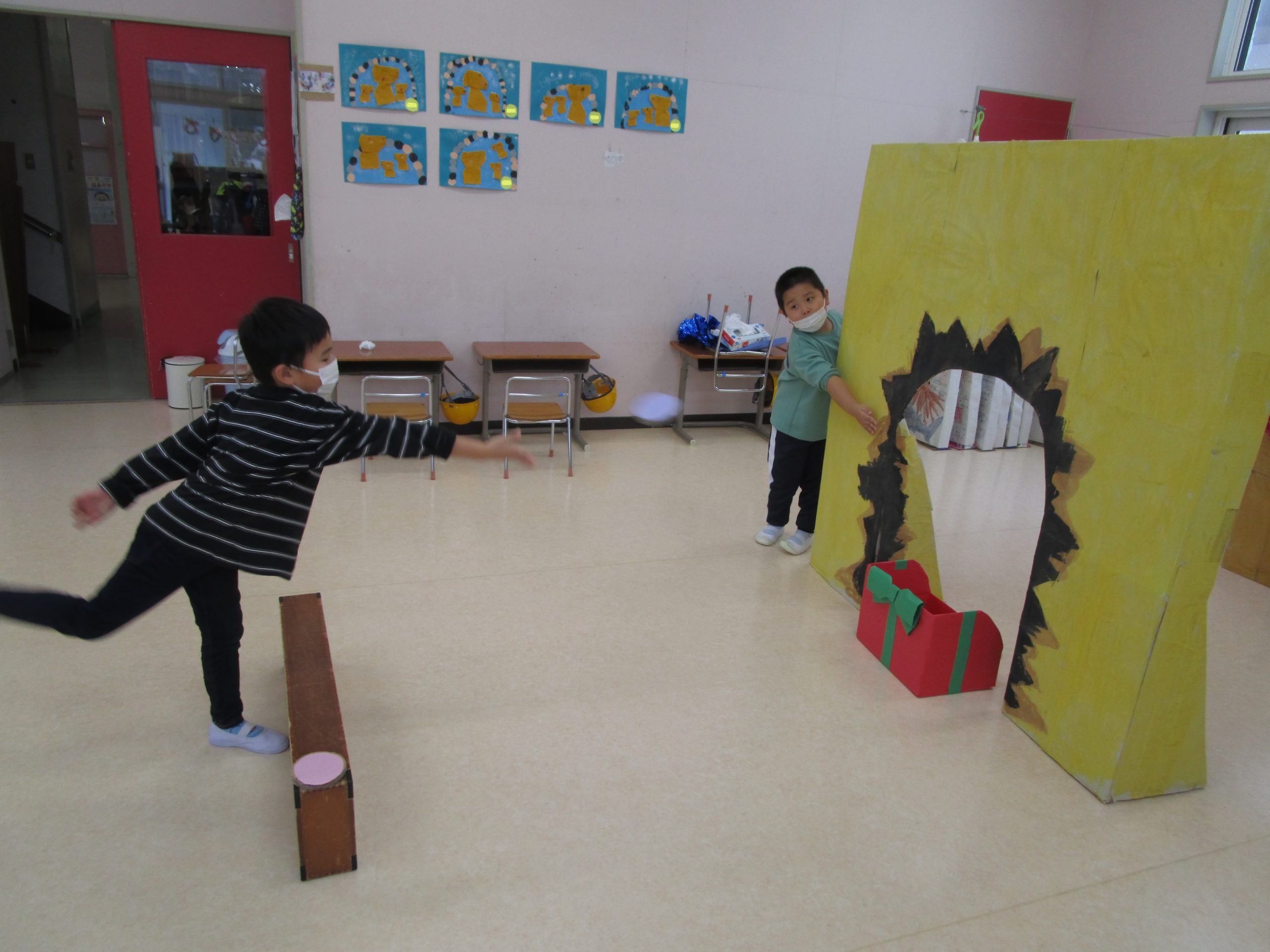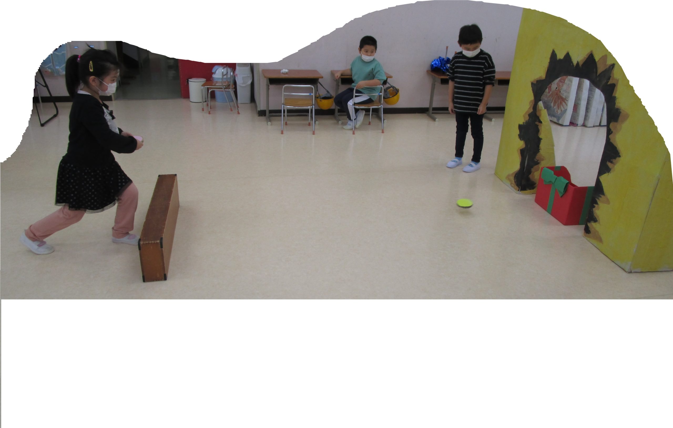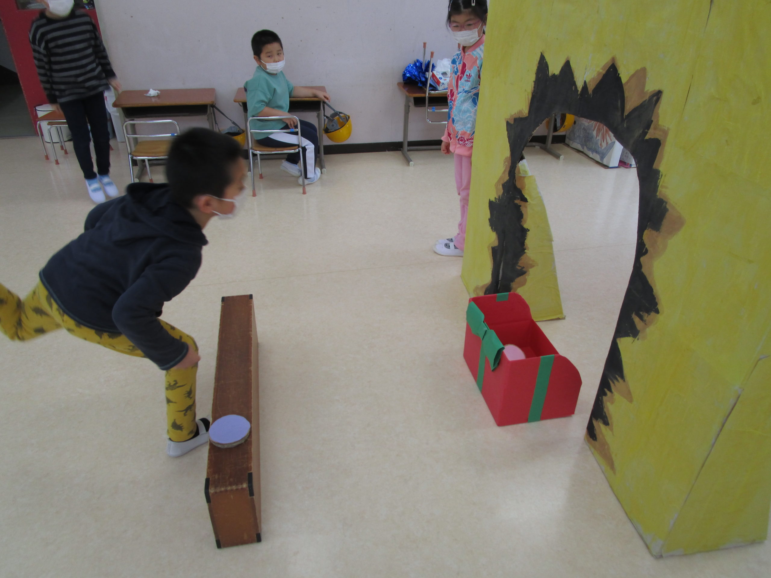 発表会の劇に使う箱や壁などを使って1個でもプレゼントの箱にフリスビーが入ったらプレゼントをゲットできるというゲームです。