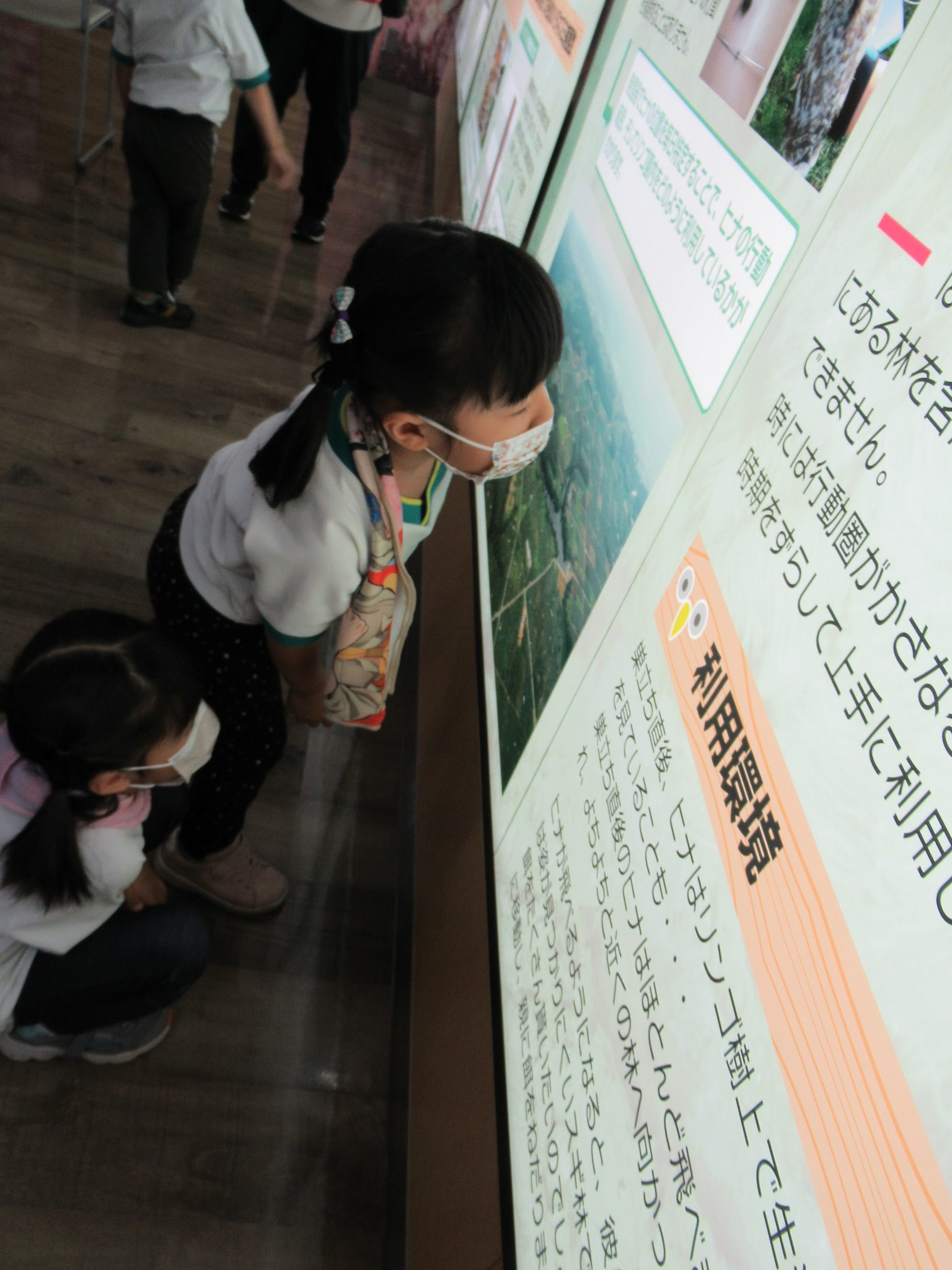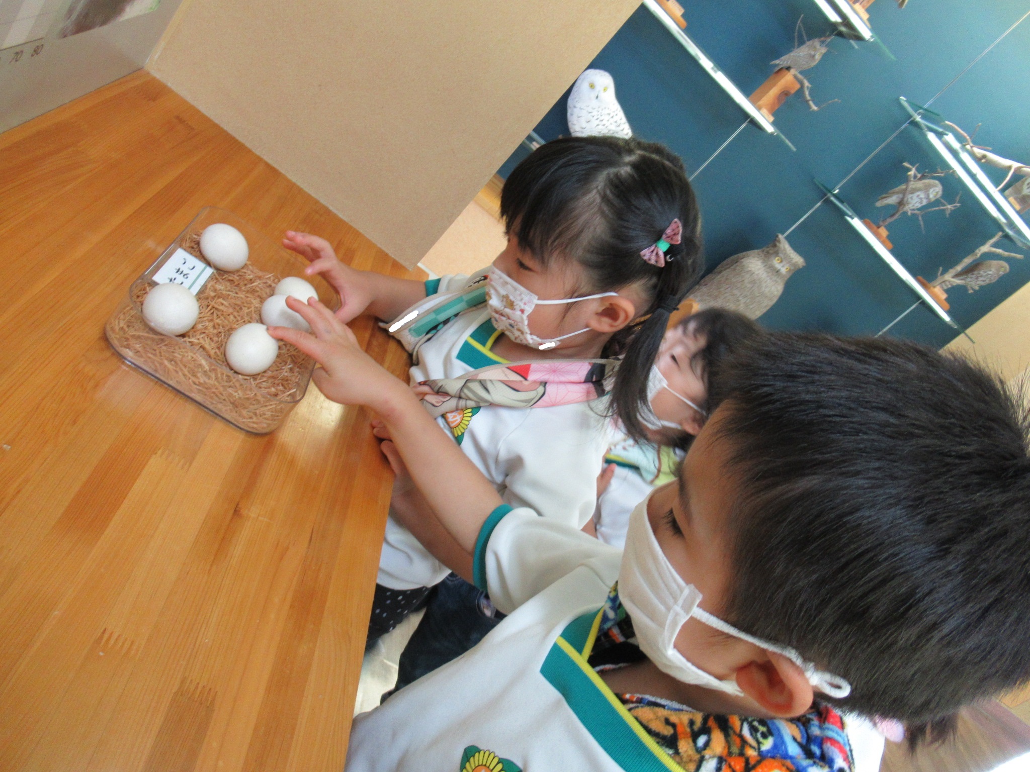 展示の中には、フクロウの卵や羽もあり、みんなじっくりと観察していました。