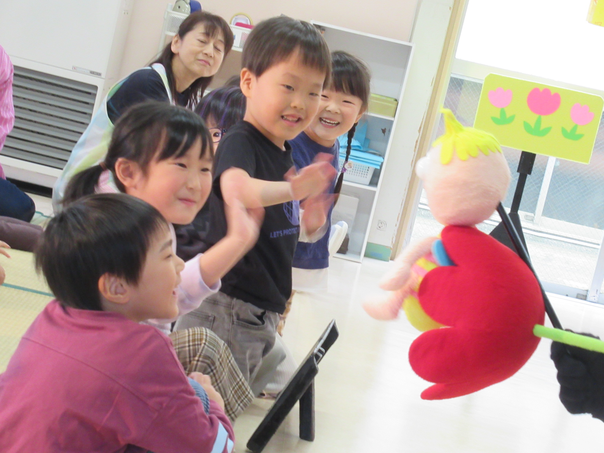 図書館に入る前に、外のベンチに座っておやつ休憩をしました。