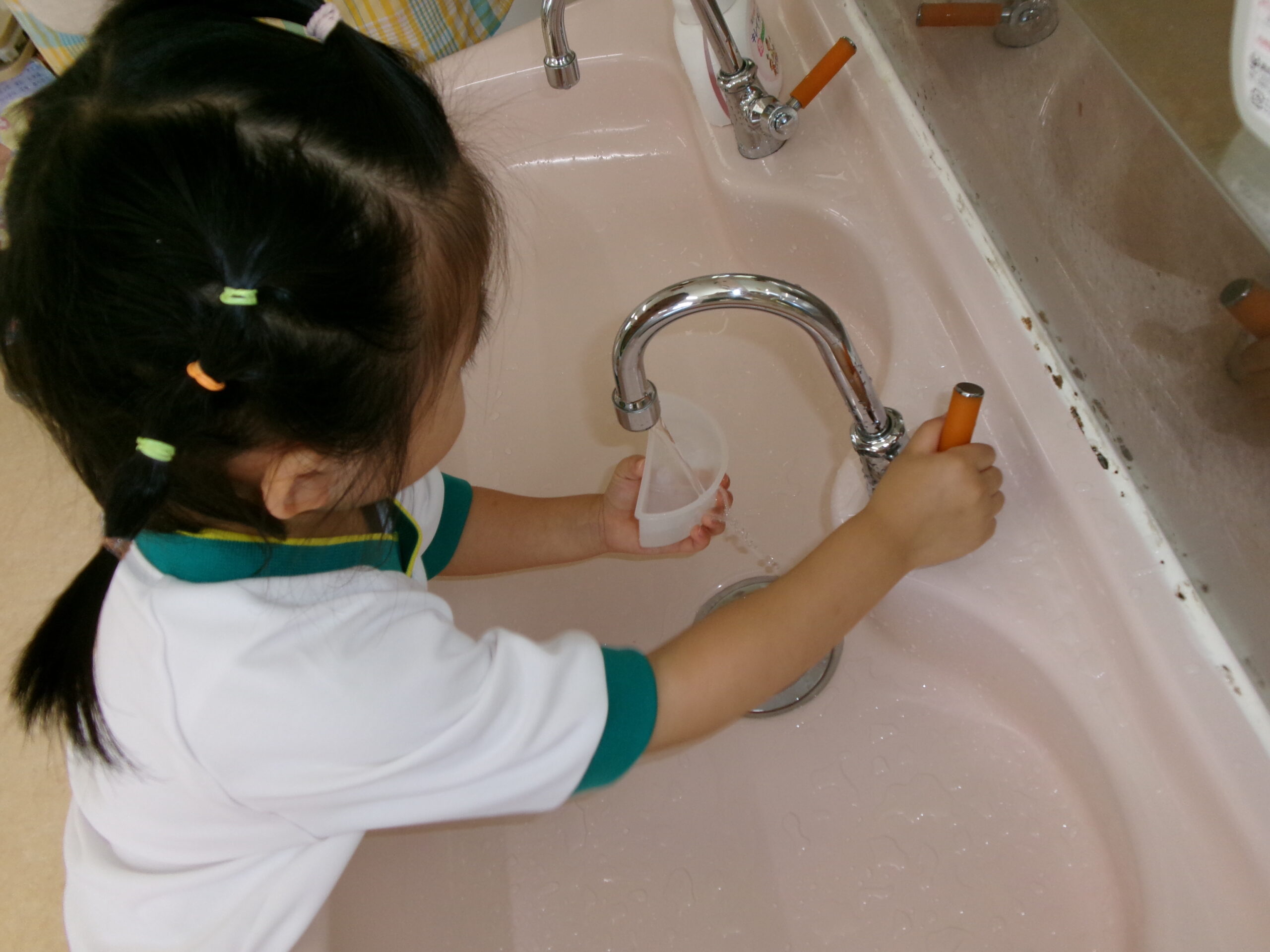 お楽しみ会の準備で、前日に一人ずつ容器に水を入れて氷作りをしました。