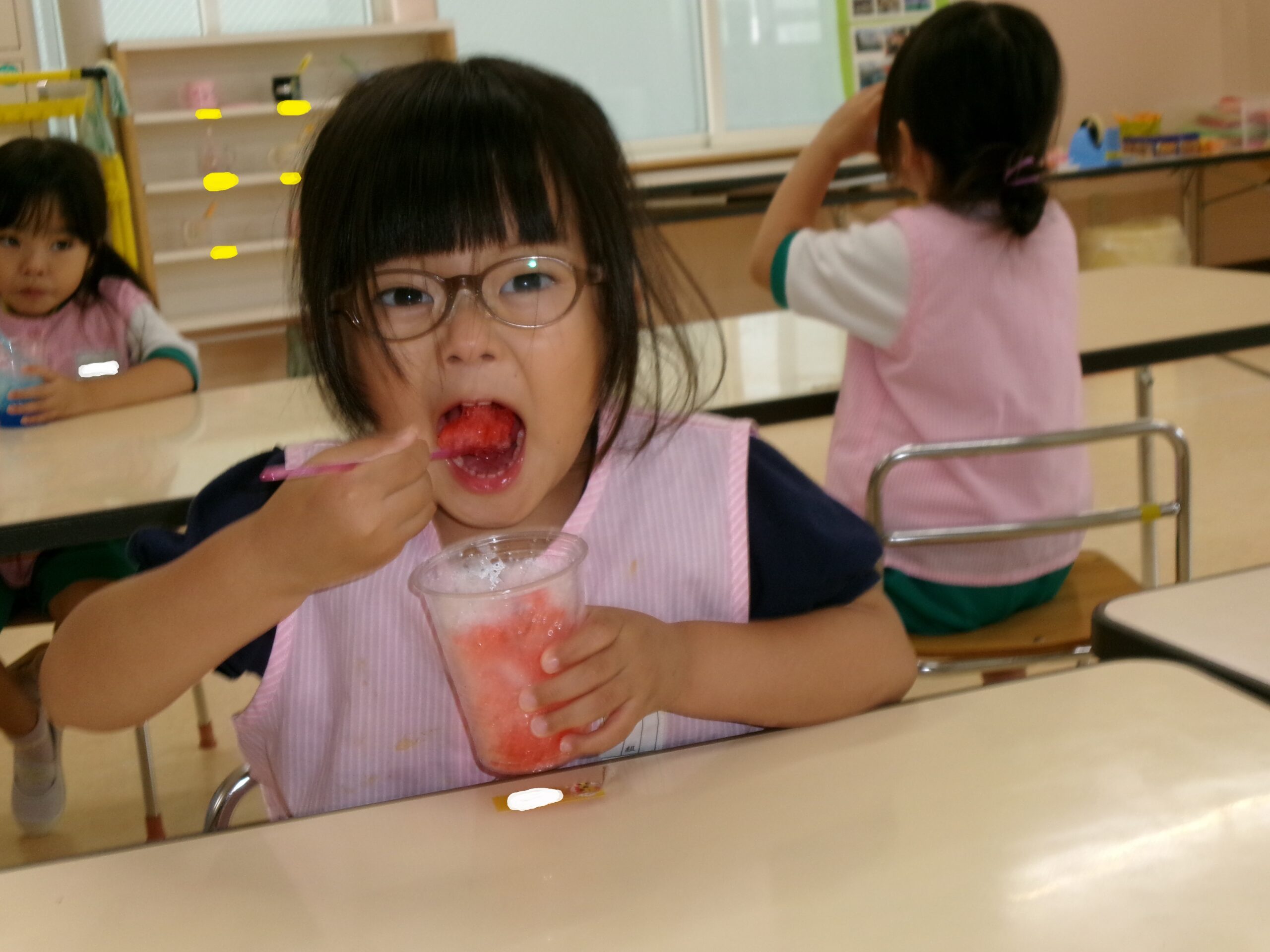 給食を食べた後は、前日に作っておいた氷を使って「かき氷」を食べました。