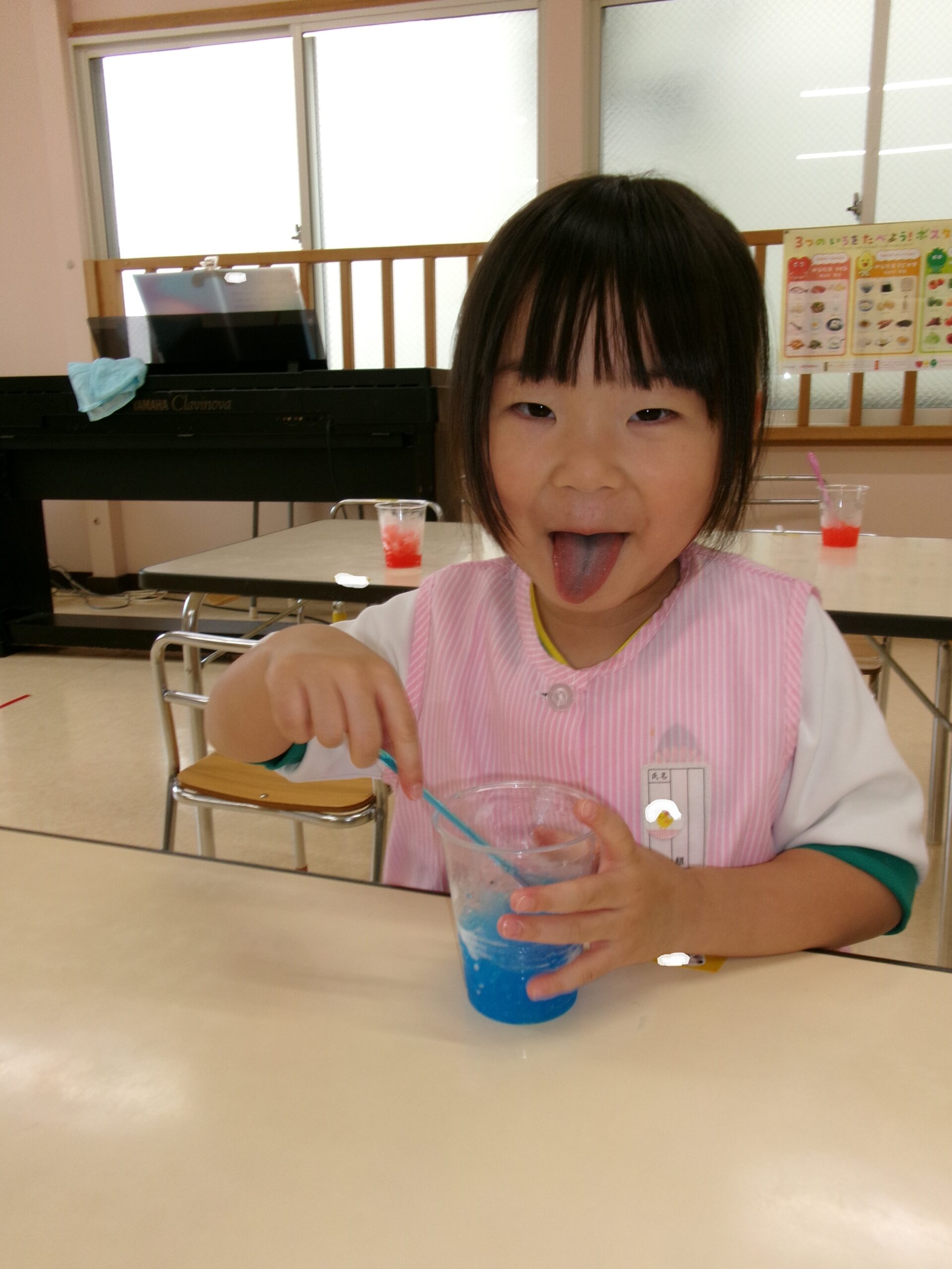 かき氷を食べた後は、舌にシロップの色がついていました。