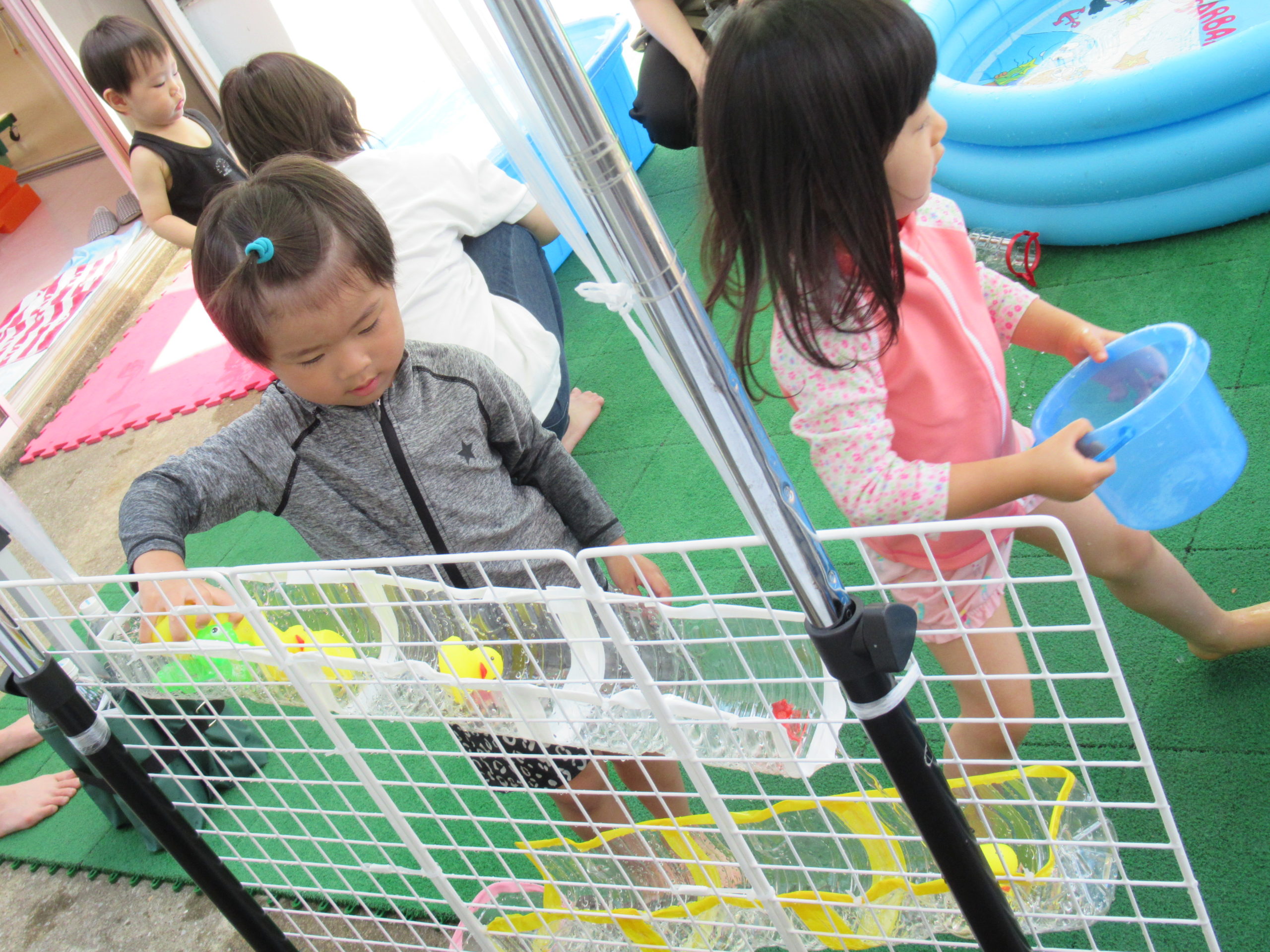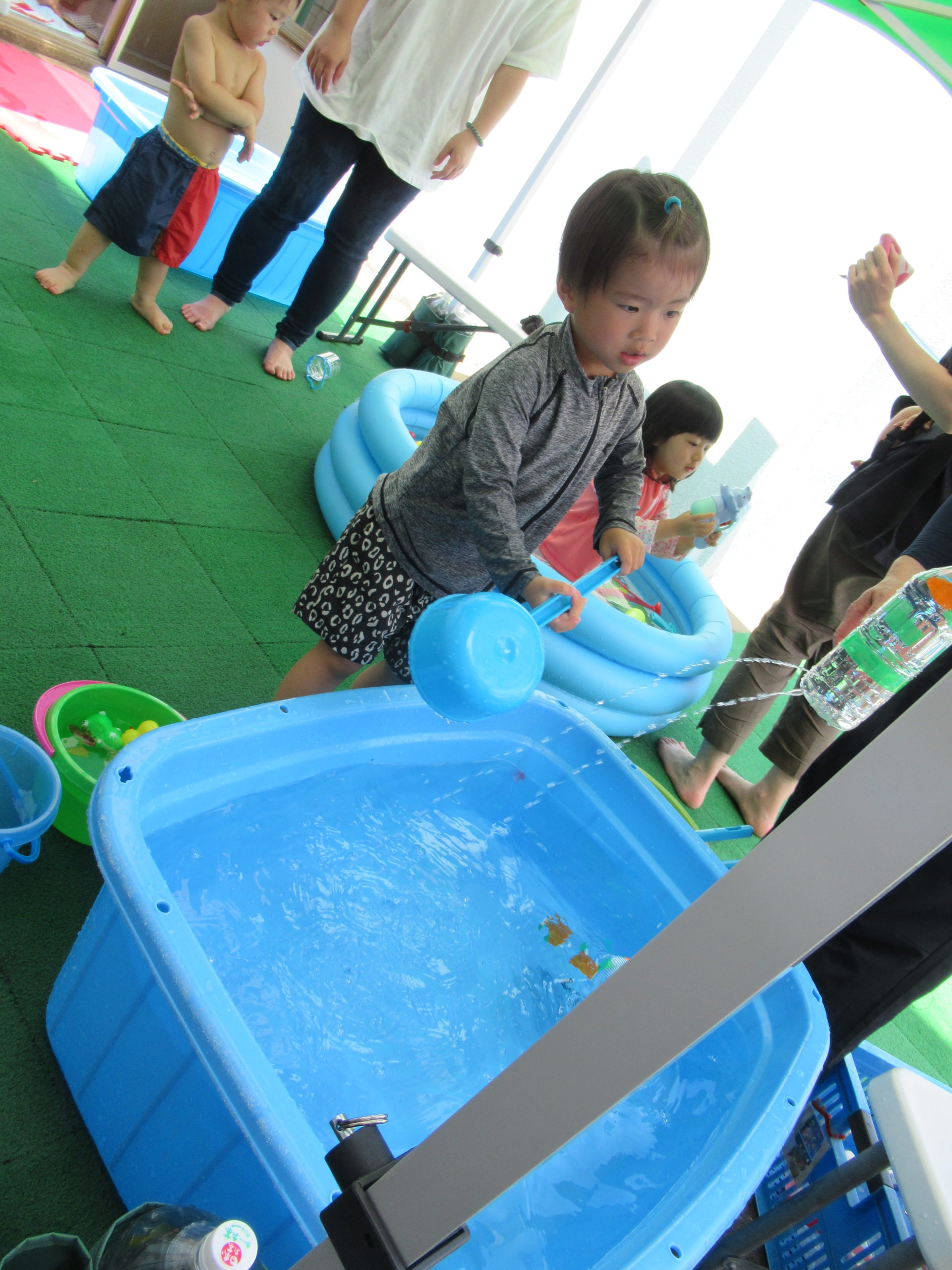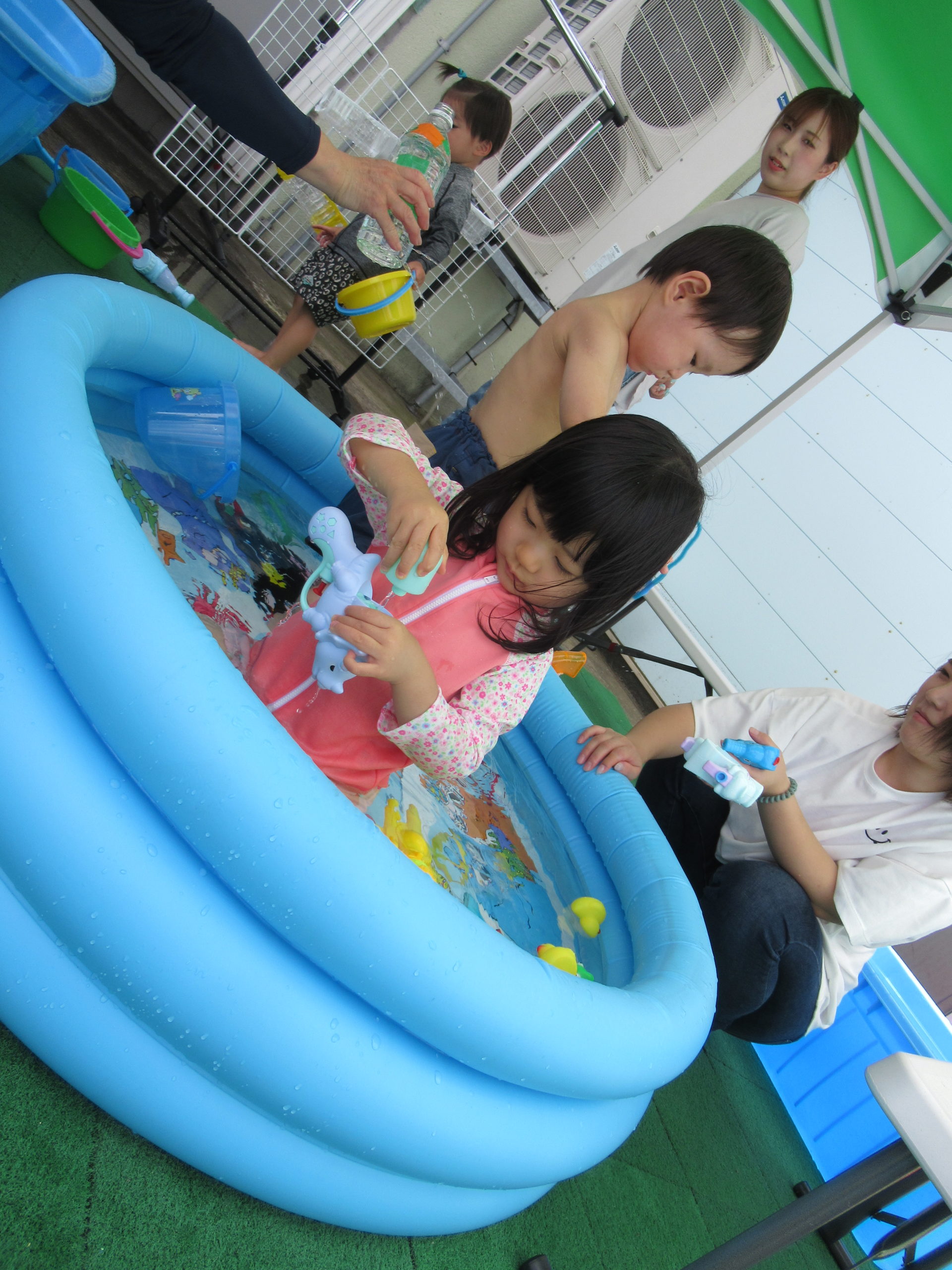 初めてプールで遊ぶというお友だちもいて少しドキドキしている様子でしたが、遊び始めると水の冷たさが心地よくて、楽しくて・・・大盛り上がり✨