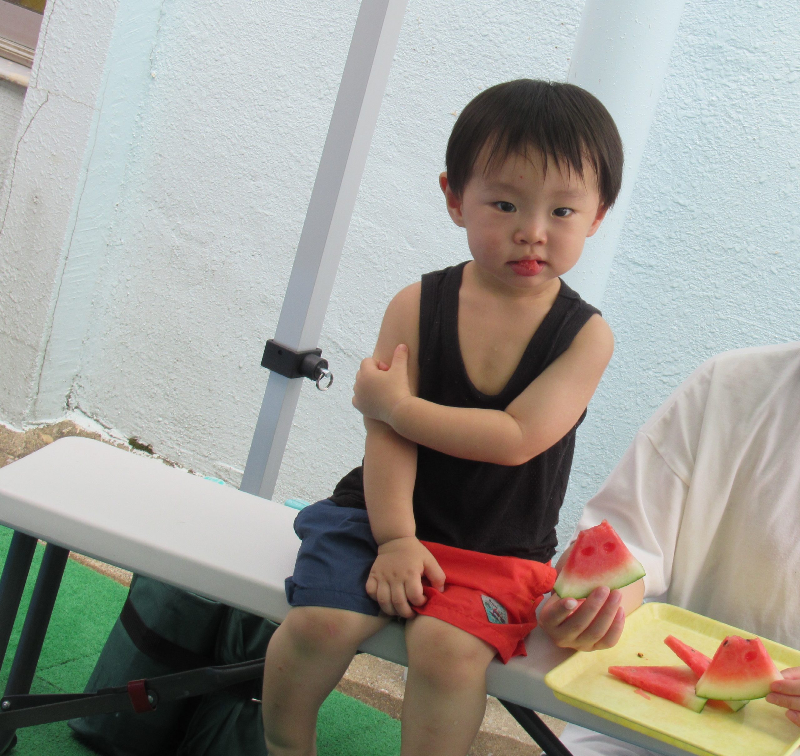 途中でで少し休憩!幼稚園のハッピー畑で収穫したスイカ🍉を食べて水分補給をしました。甘くておいしかったね。