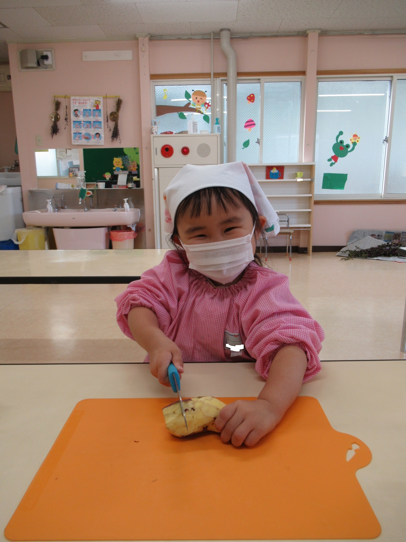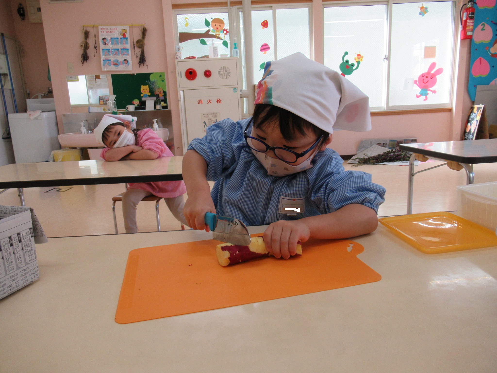 じゃが芋で一度経験した包丁でしたが、さつま芋は固くて包丁を握る手が痛くなったりしましたが、前回よりも安心して経験させることができました。