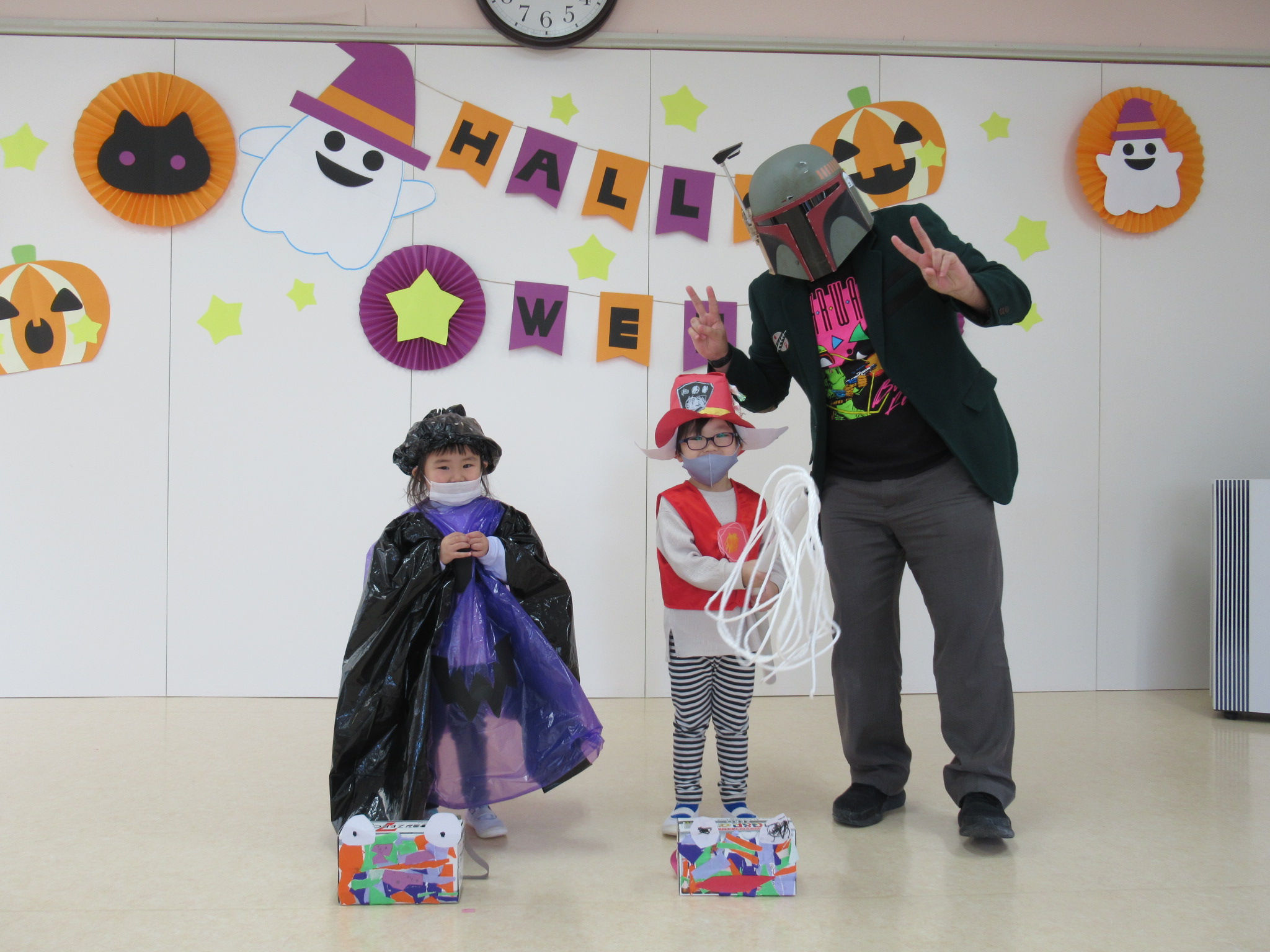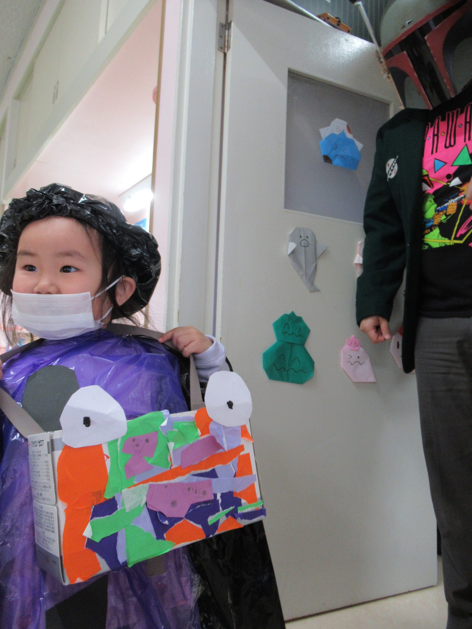 マイケル先生の所へ行き「トリックオアトリート」のご挨拶でお菓子を受け取り「ハッピーハロウィン!」と言ってホールへ帰ってくるという英語にもふれてみました。