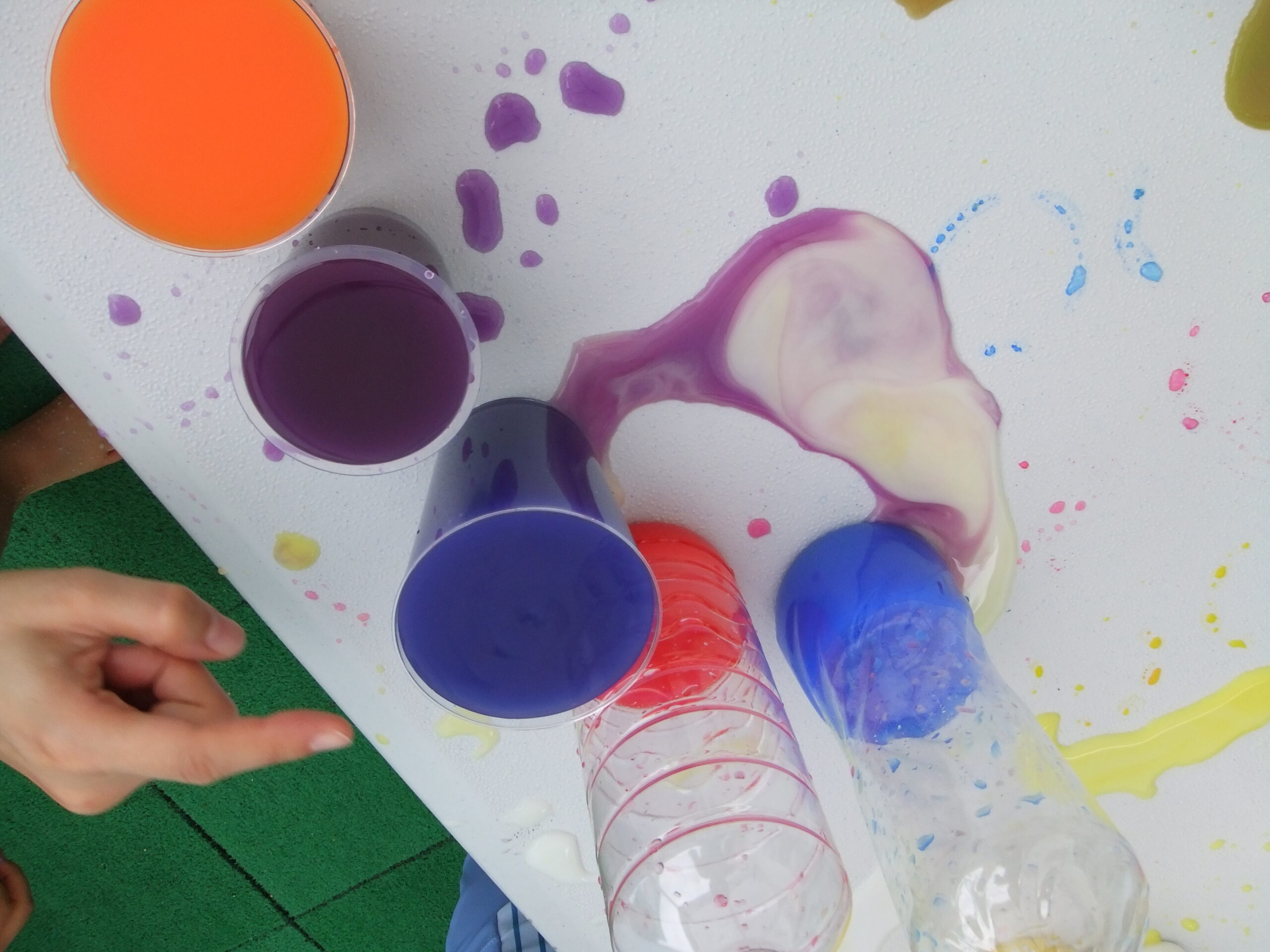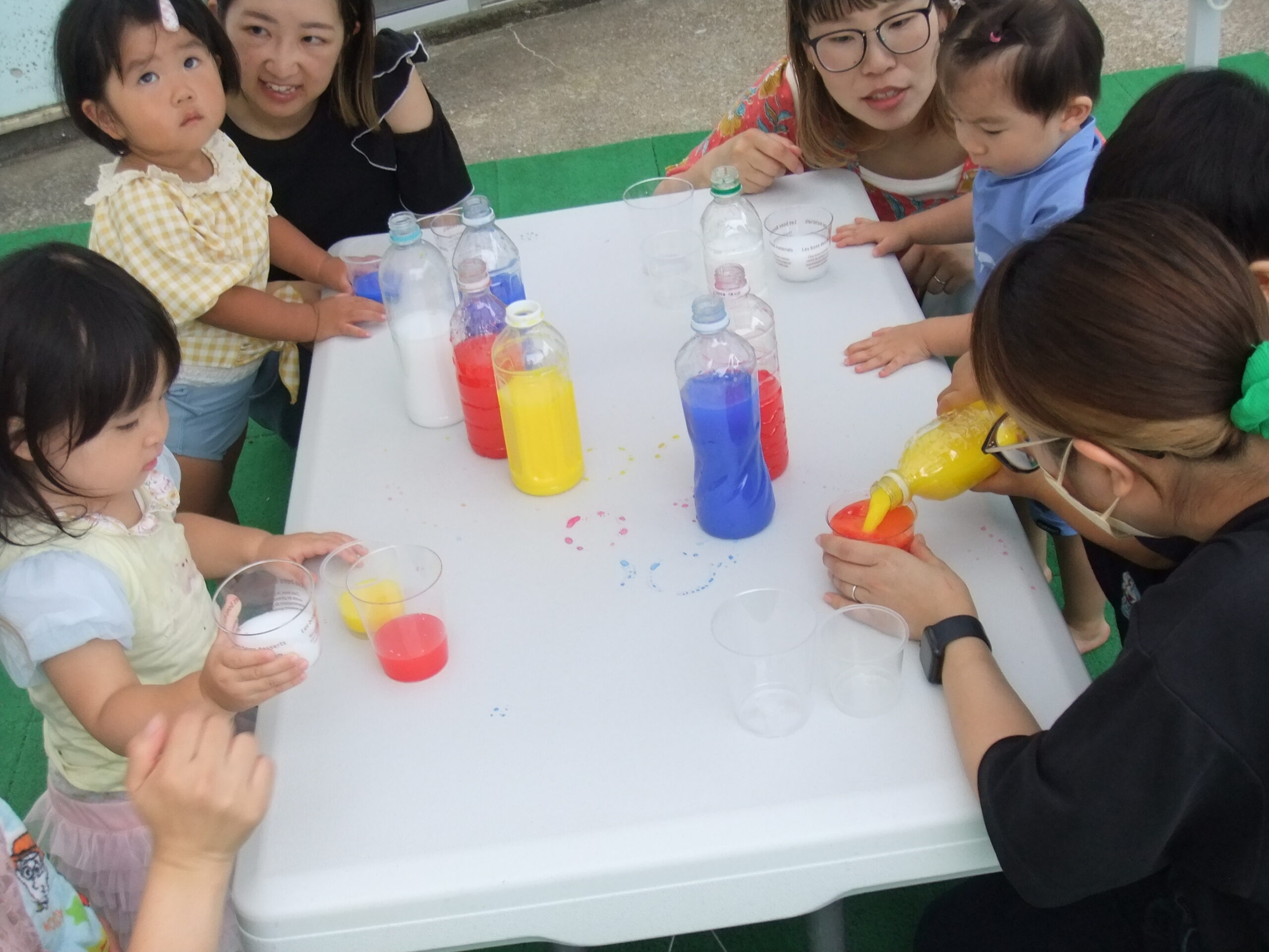 フィンガーペインティングの後は、お外で色水遊びをしました。