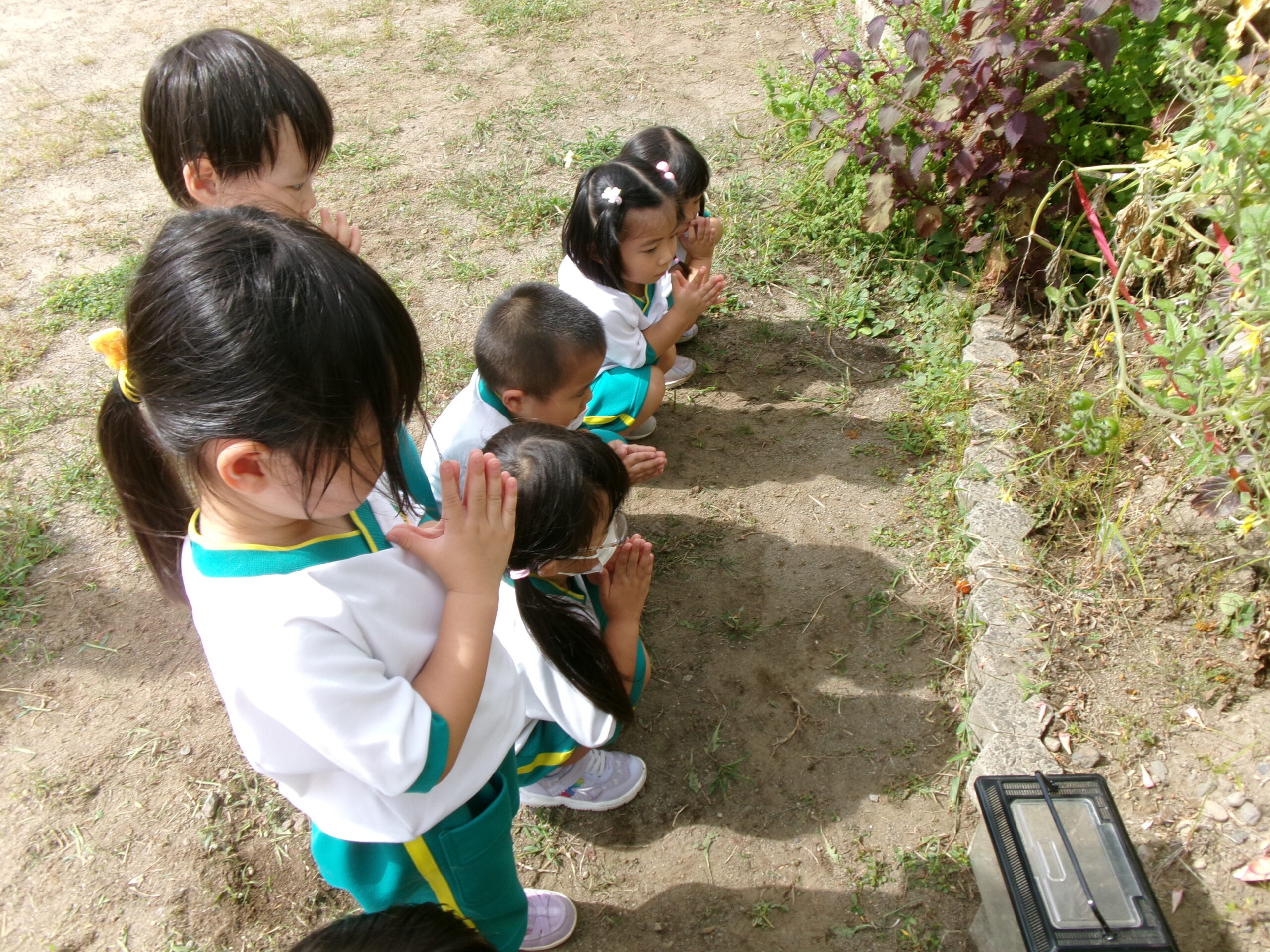 ひよこ組さんみんなで考えて、トンボのお墓を作ること、捕まえた虫はその日のうちに返すことを決めました。