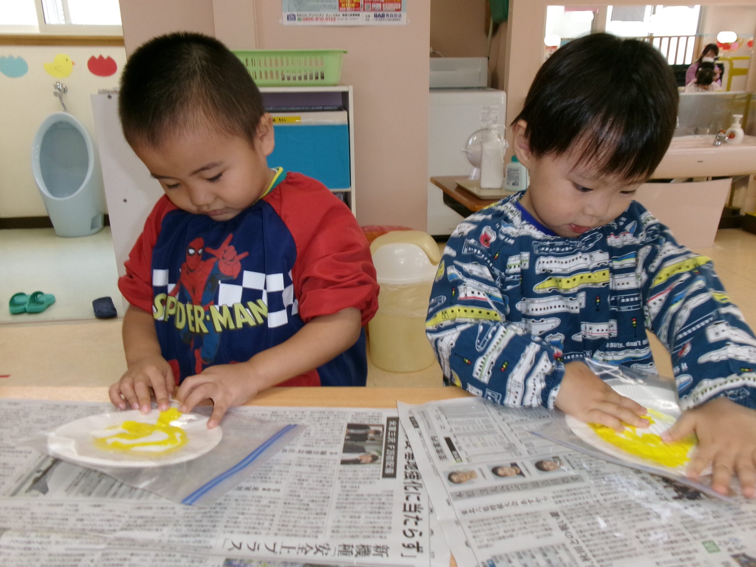 袋の中に絵の具と紙皿を入れて伸ばしてみました。