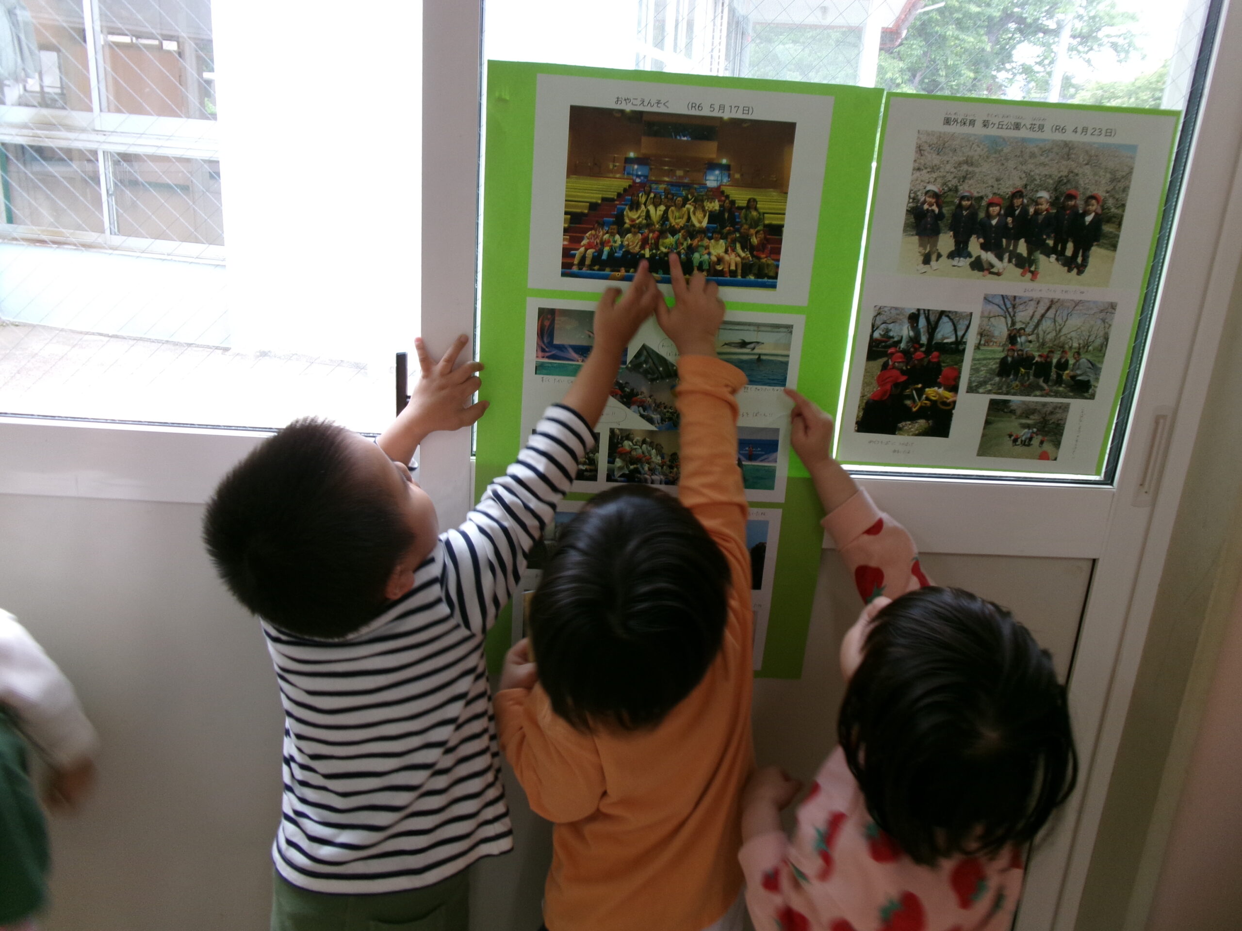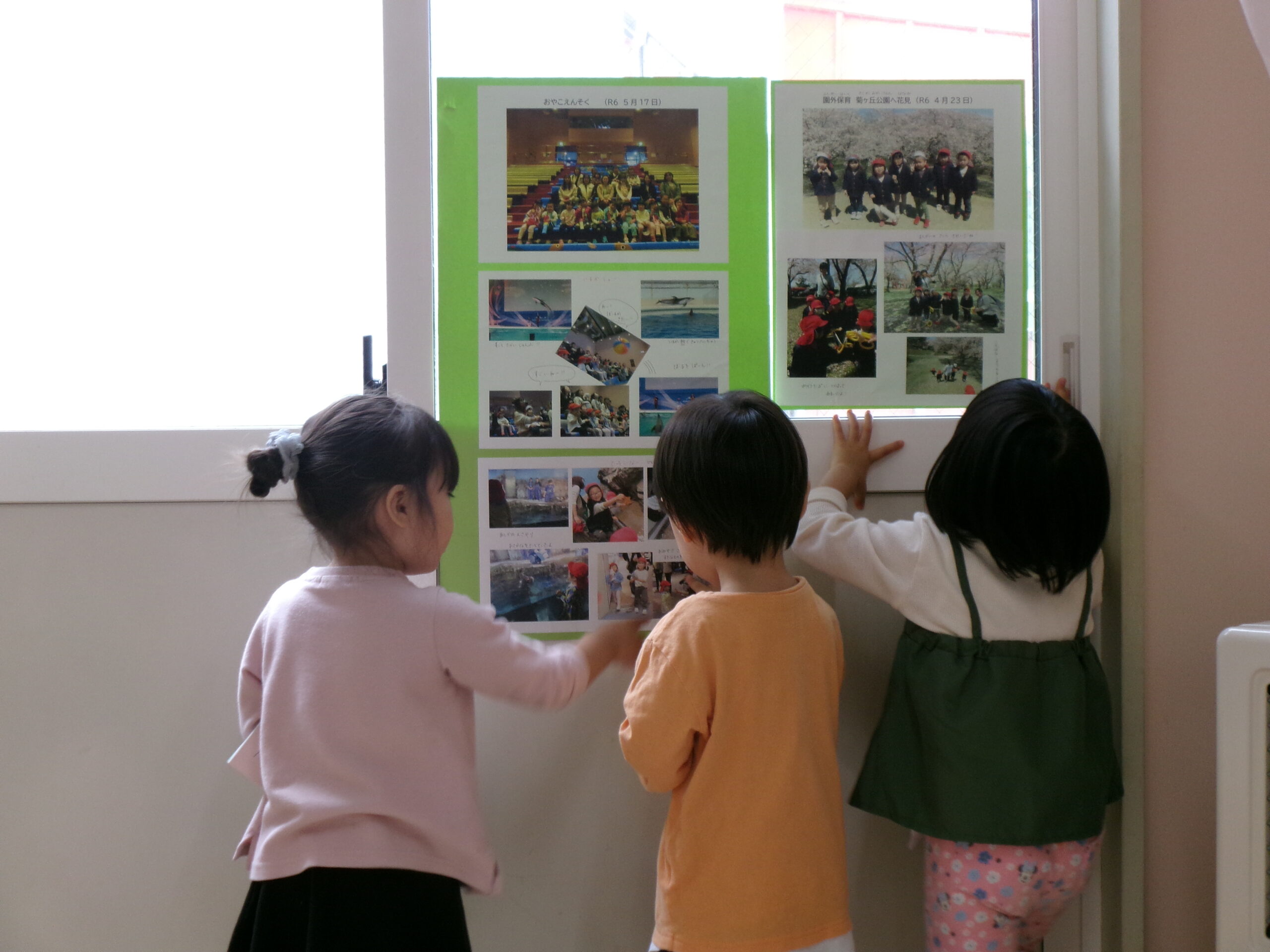 遠足の写真をプリントしてクラス内に貼ると、興味を持って見ているひよこさん。