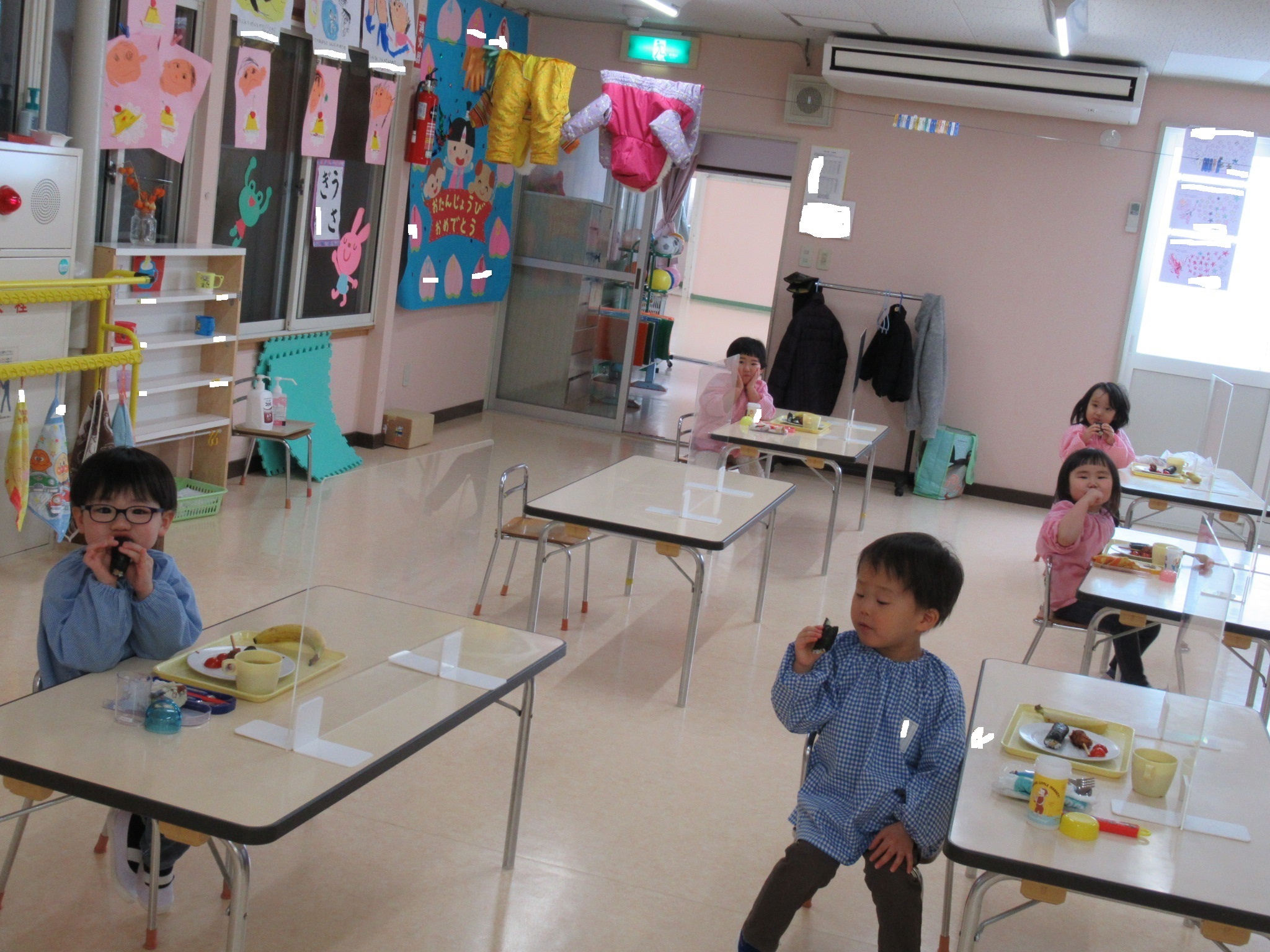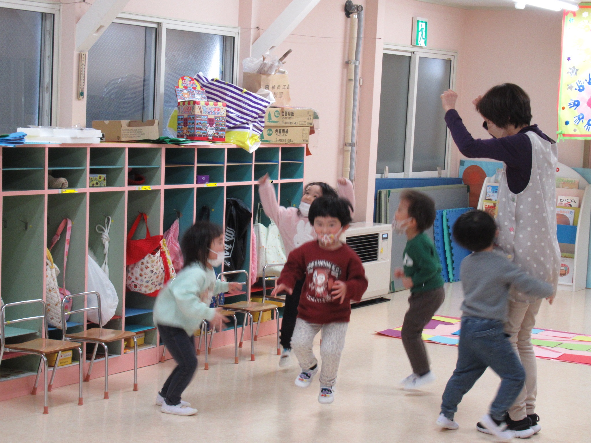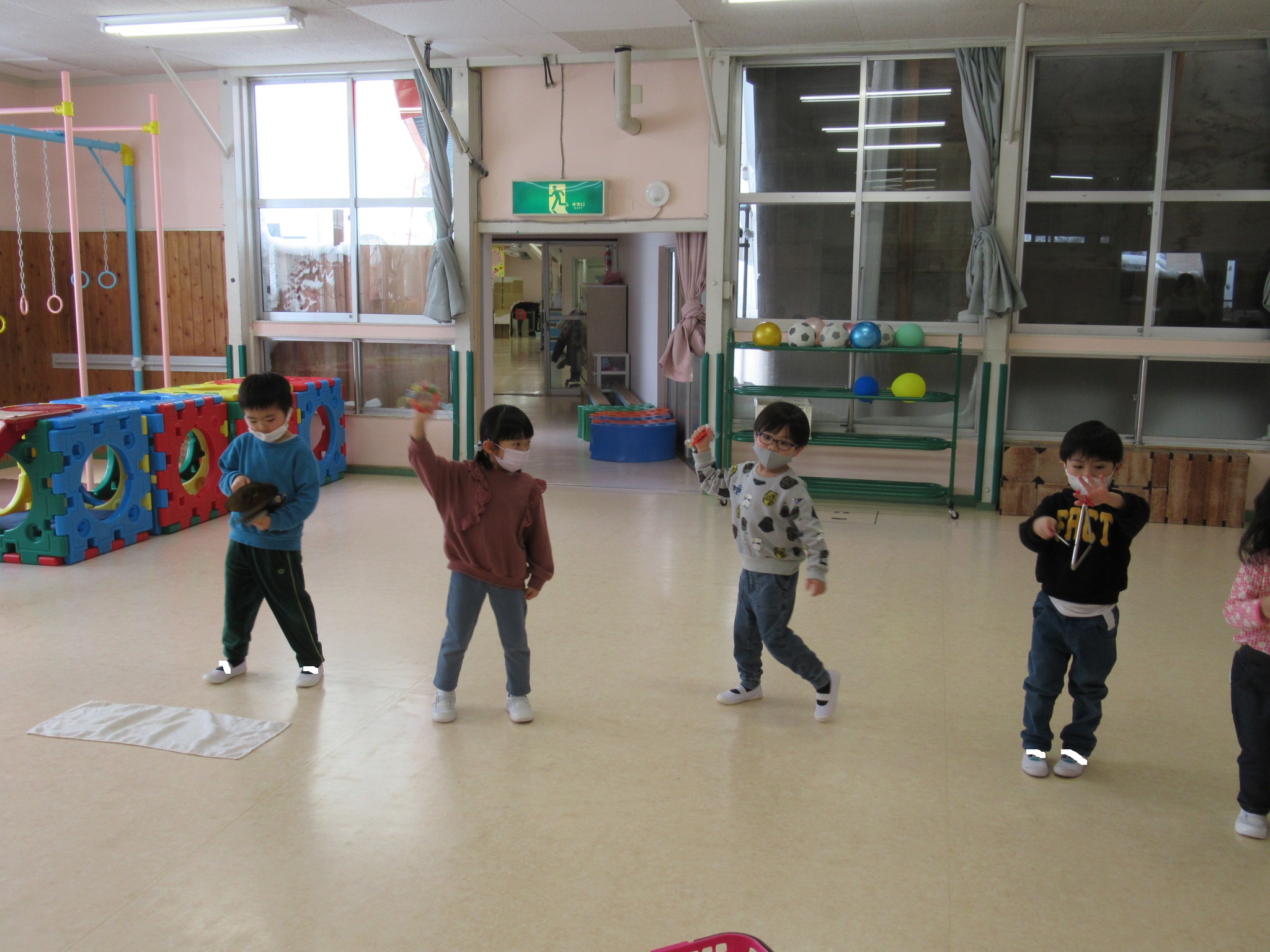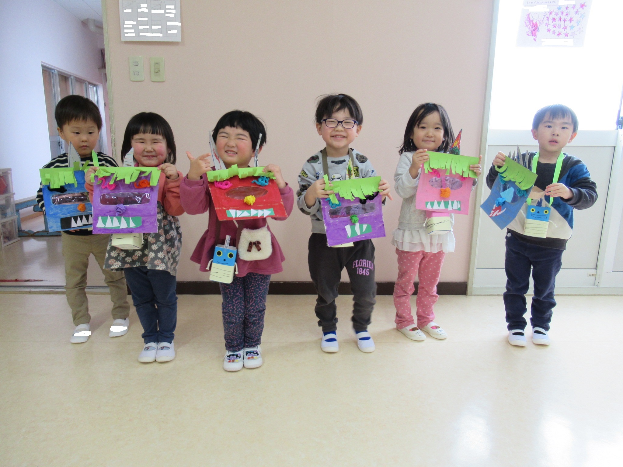 2月、牛乳パックで作った豆入れと、ティッシュの空き箱で作った鬼のお面をつけて豆まきをしました。