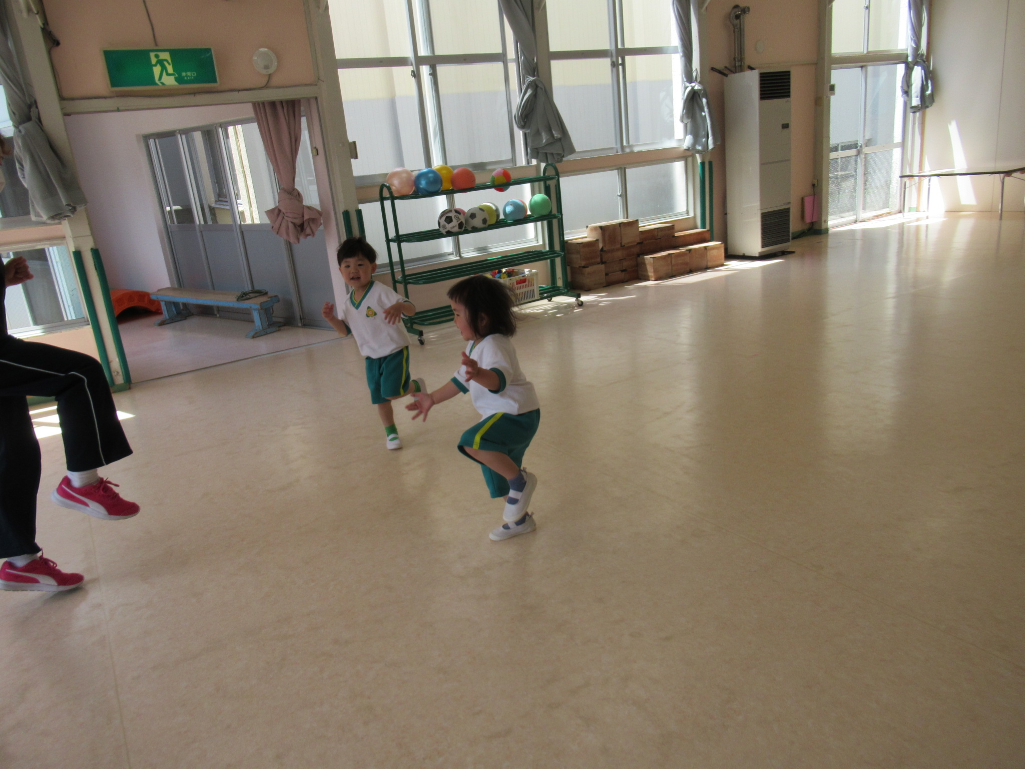 表現は、年中組と一緒に笑顔いっぱいで取り組んでいます。こちらは年中組さんに「負けないぞー!」と刺激を受けながら年少組なりに頑張っています。曲の途中に「ケンケンパー」もあるので、体操教室でも練習をしてみました。