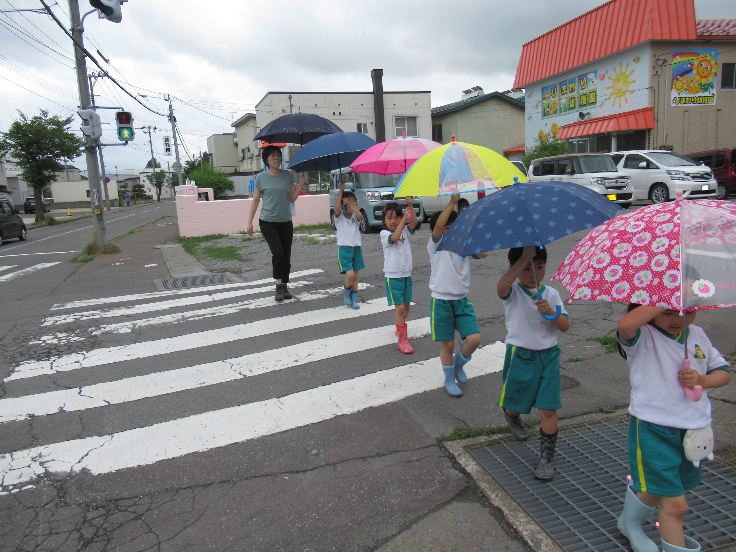 事前に紙芝居などで、傘の安全な使い方・歩き方を指導していたので、みんな上手に歩くことができていました。