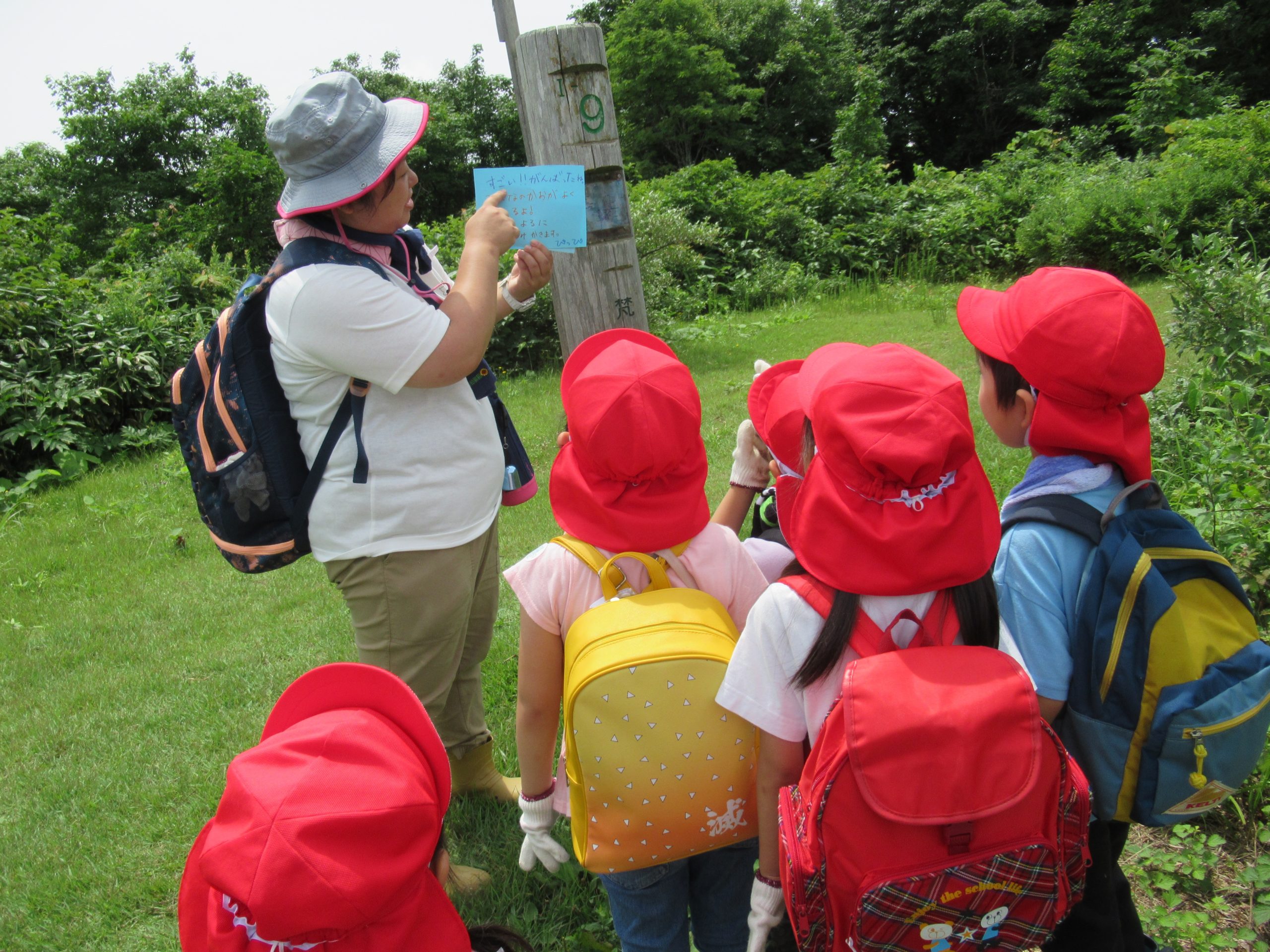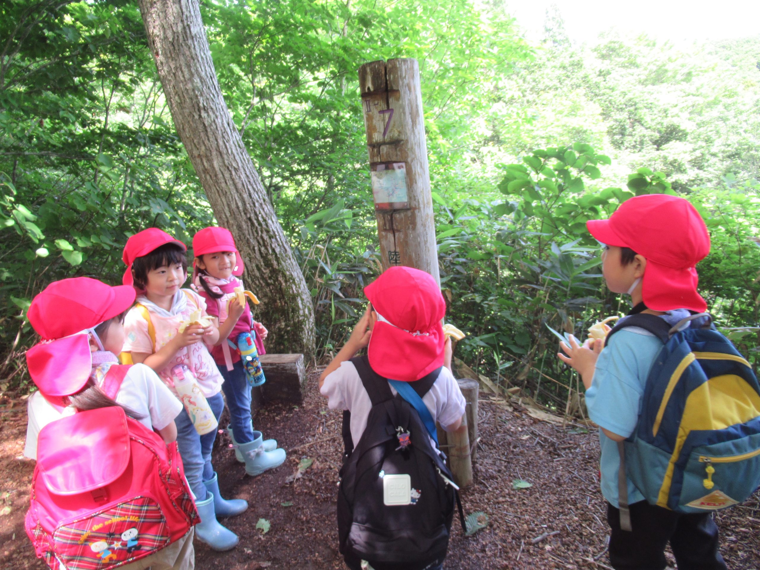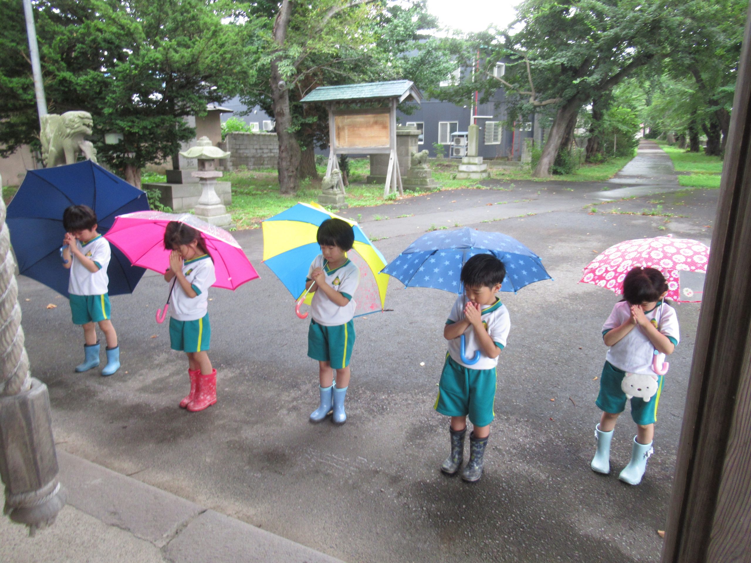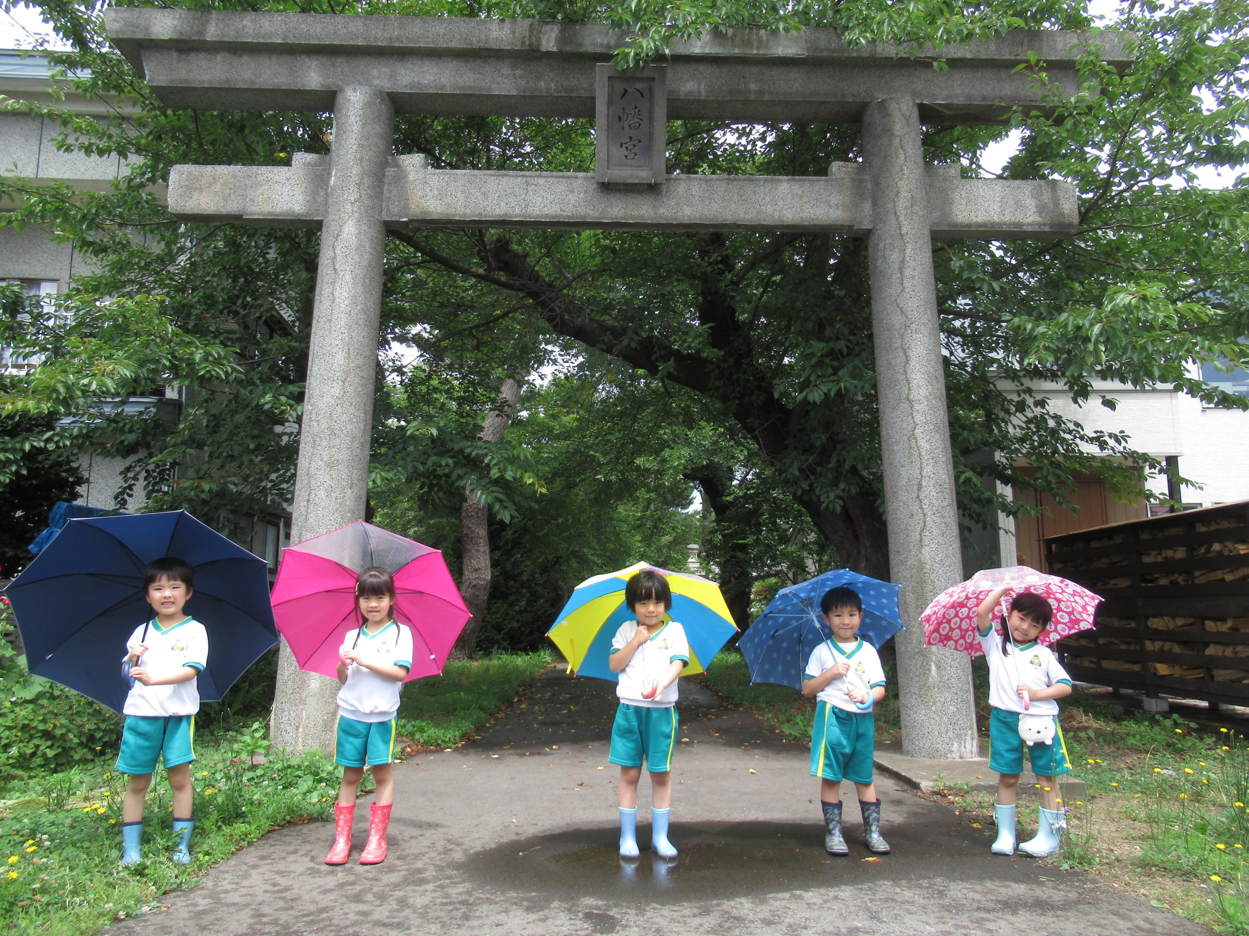 横断歩道を渡り、牧水公園でクモの巣についた水滴を見て、畑の様子を観察し、神社ではチャレンジ保育の安全と晴れますようにとお願いしました。