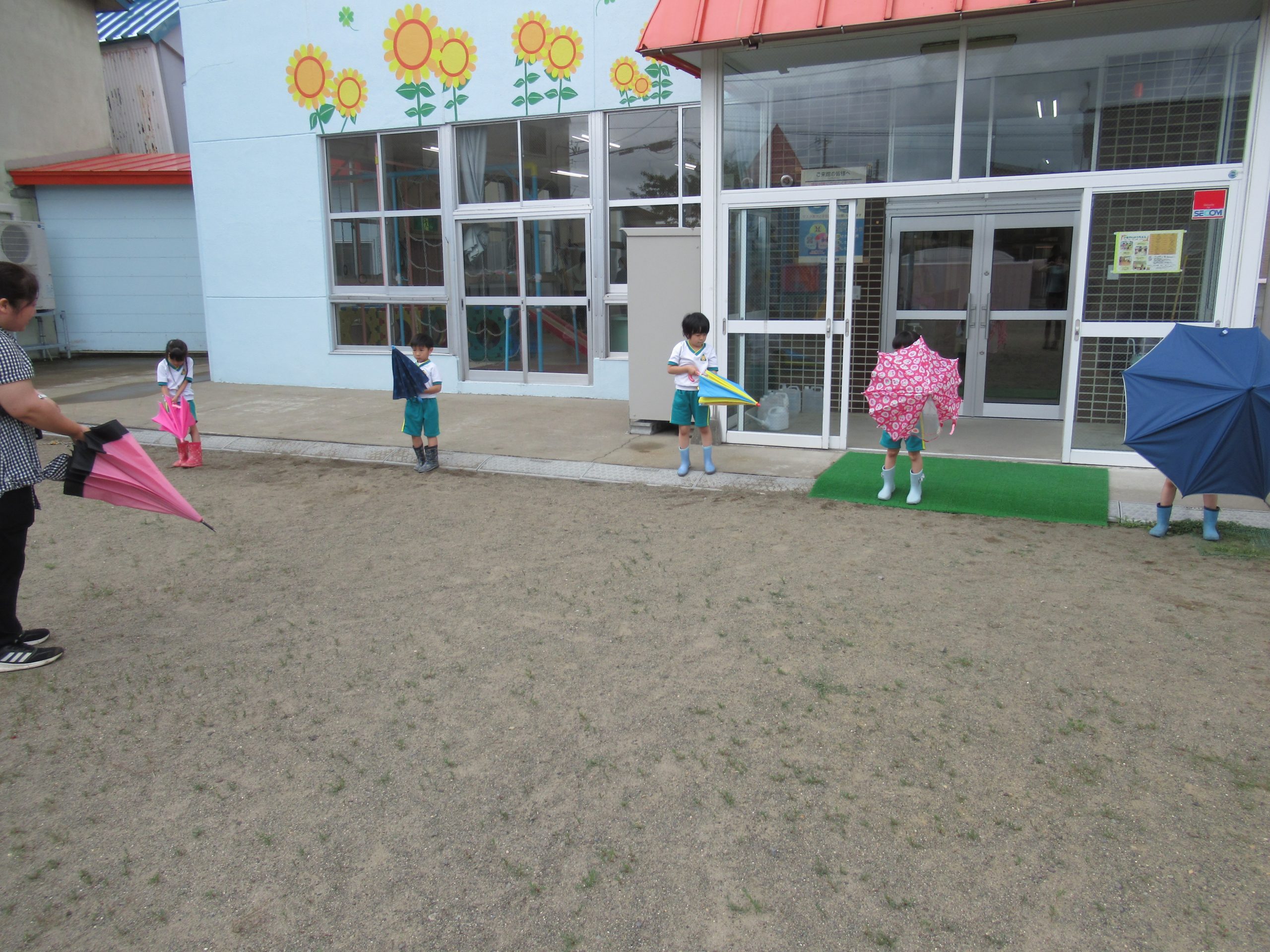 雨のにおいを感じたり、傘にあたる雨の音を聞いたり、傘から雨の水滴が見えることを発見したりと、普段の散歩とは違う五感を使ったお散歩になりました。