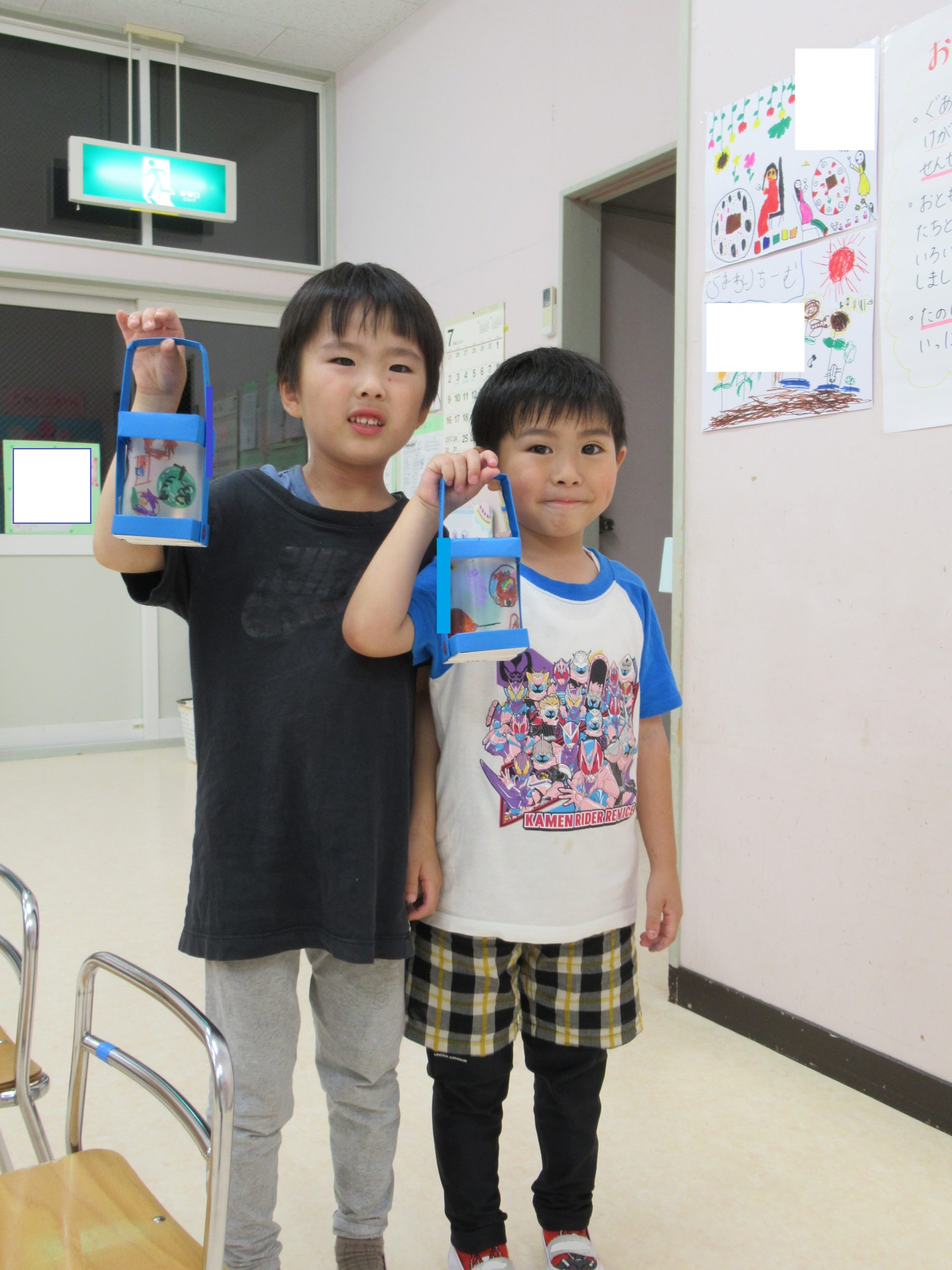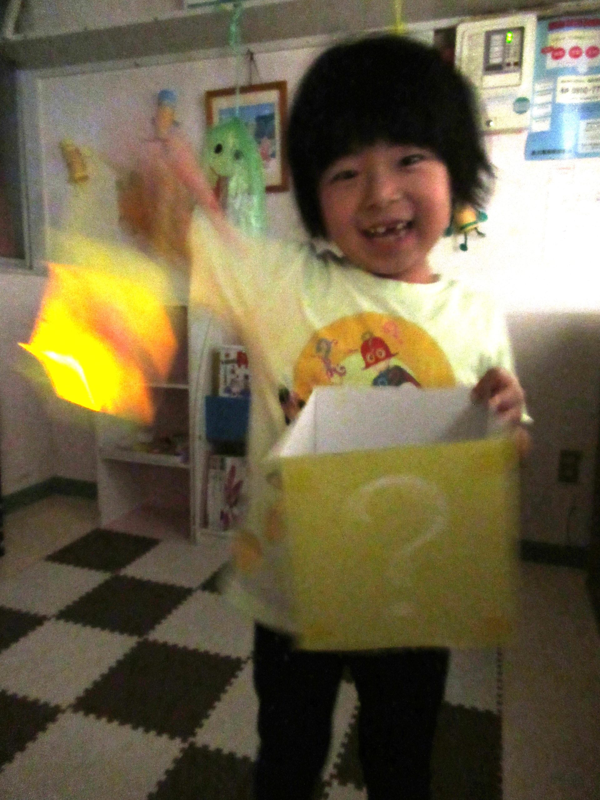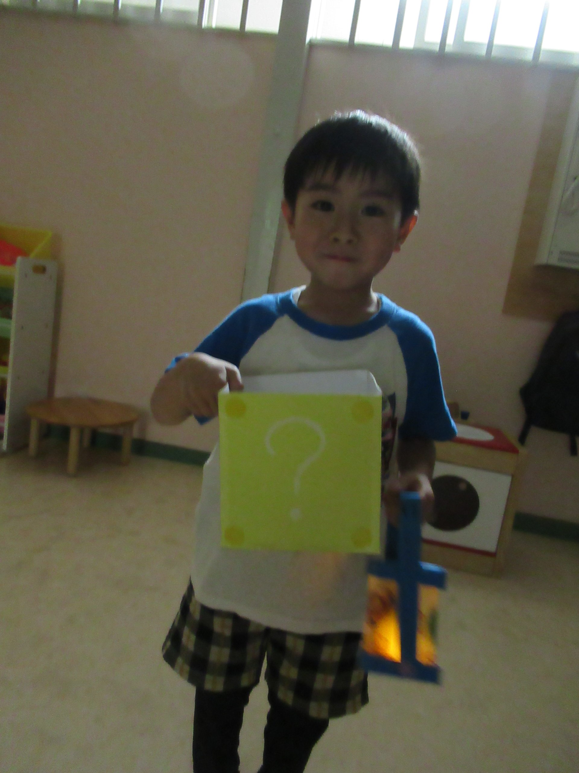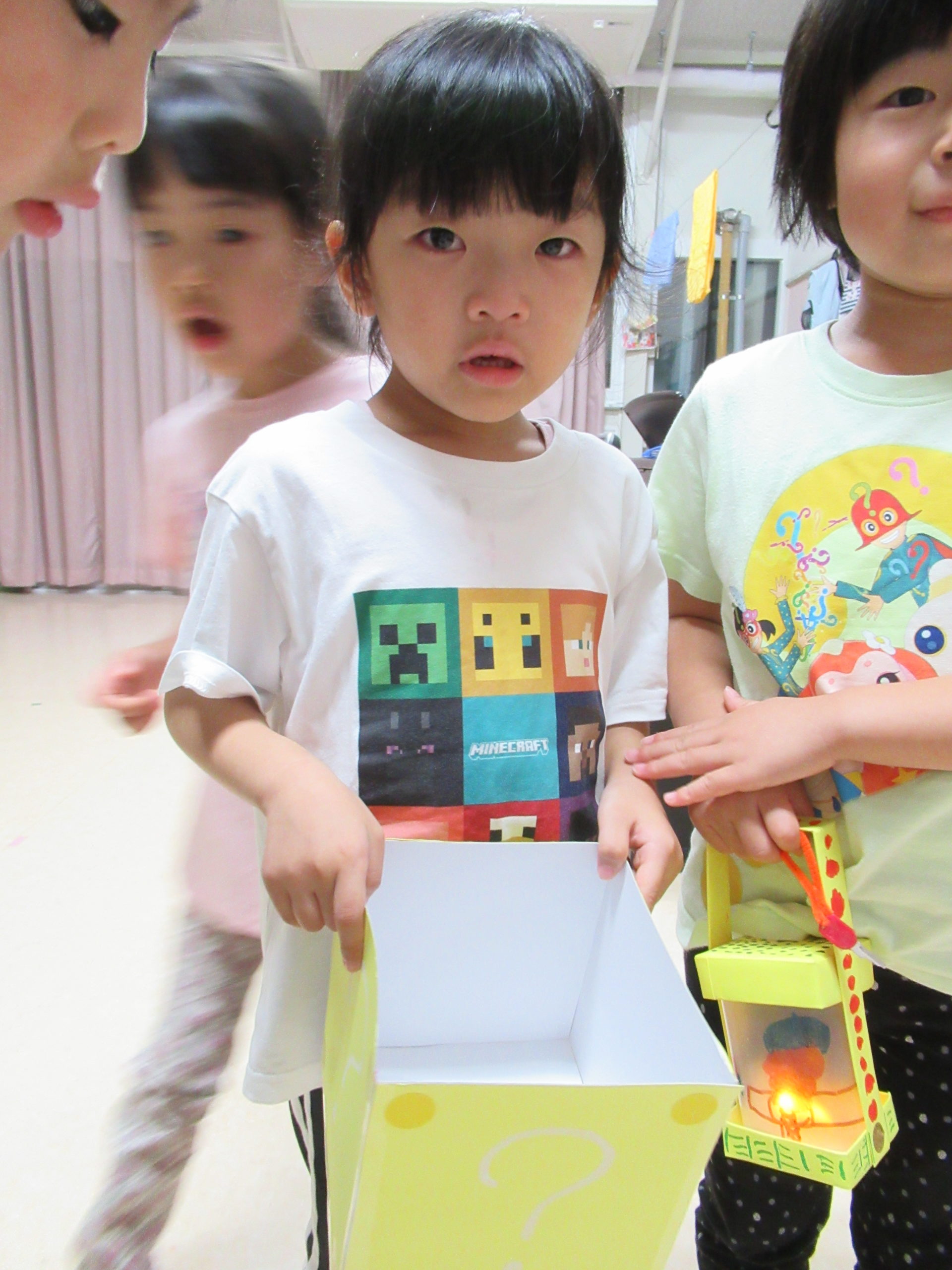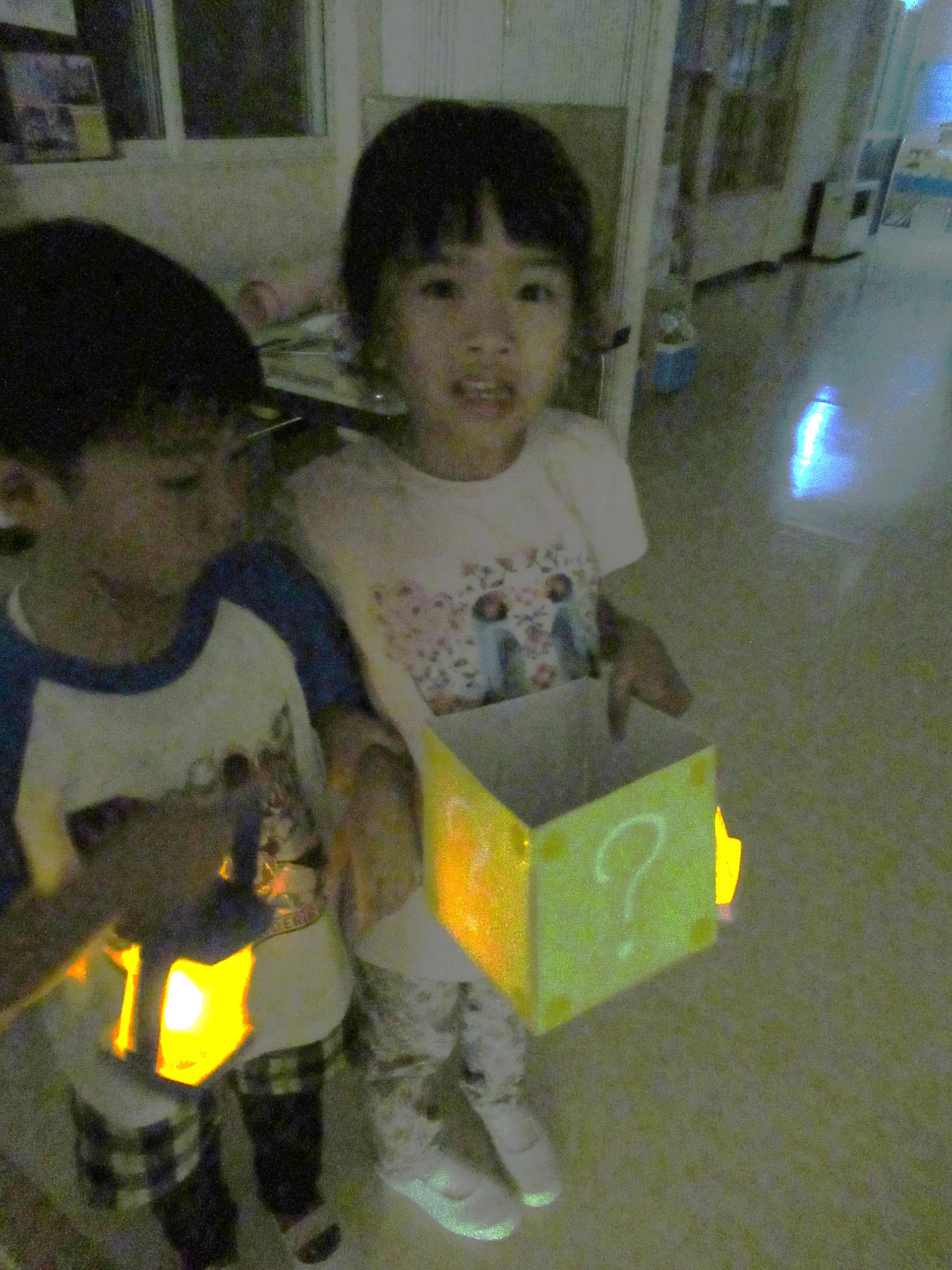 ランタンを持って、少し薄暗くなった幼稚園を探検です。