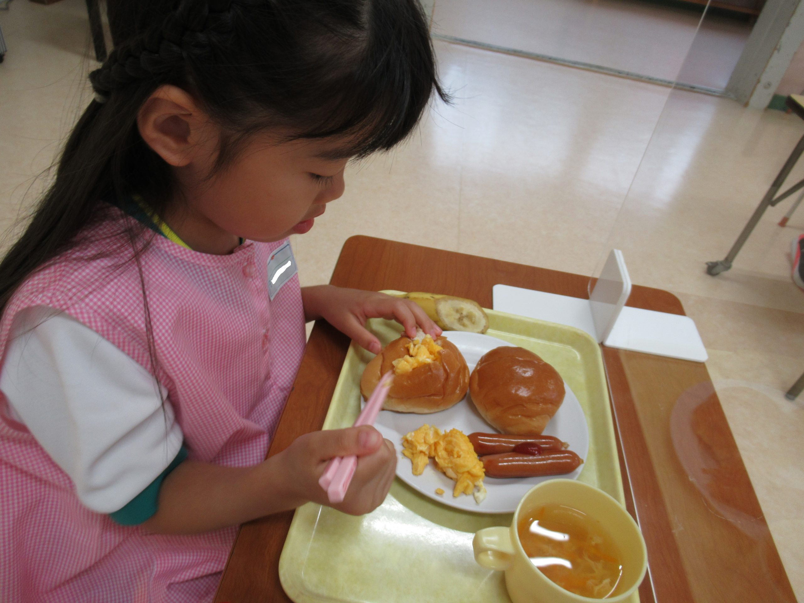 パンに、スクランブルエッグやウインナ―をお好みで挟んで食べました。