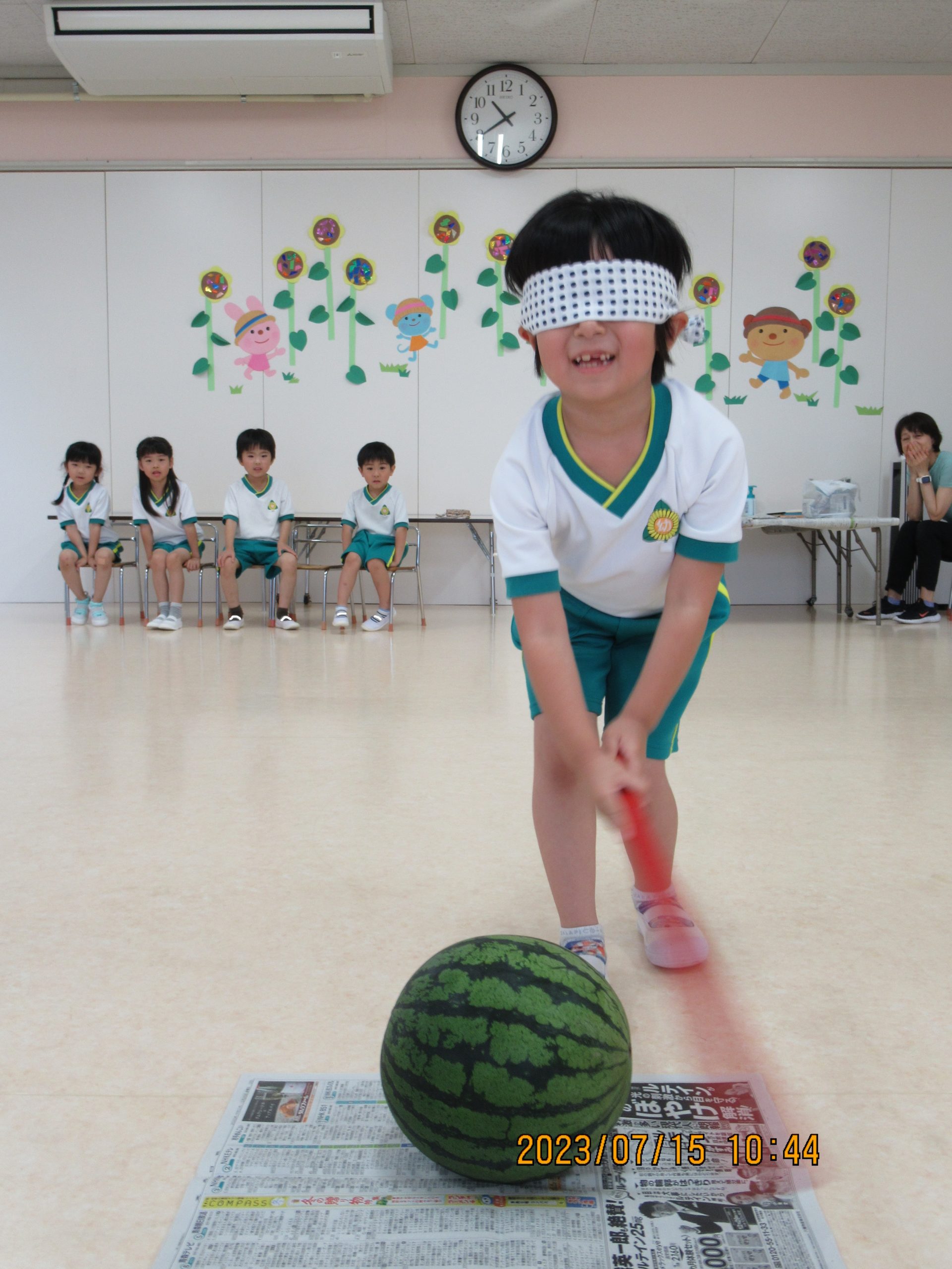 目隠しをして、周りの子は「右!左!」と応援しながら楽しみました。