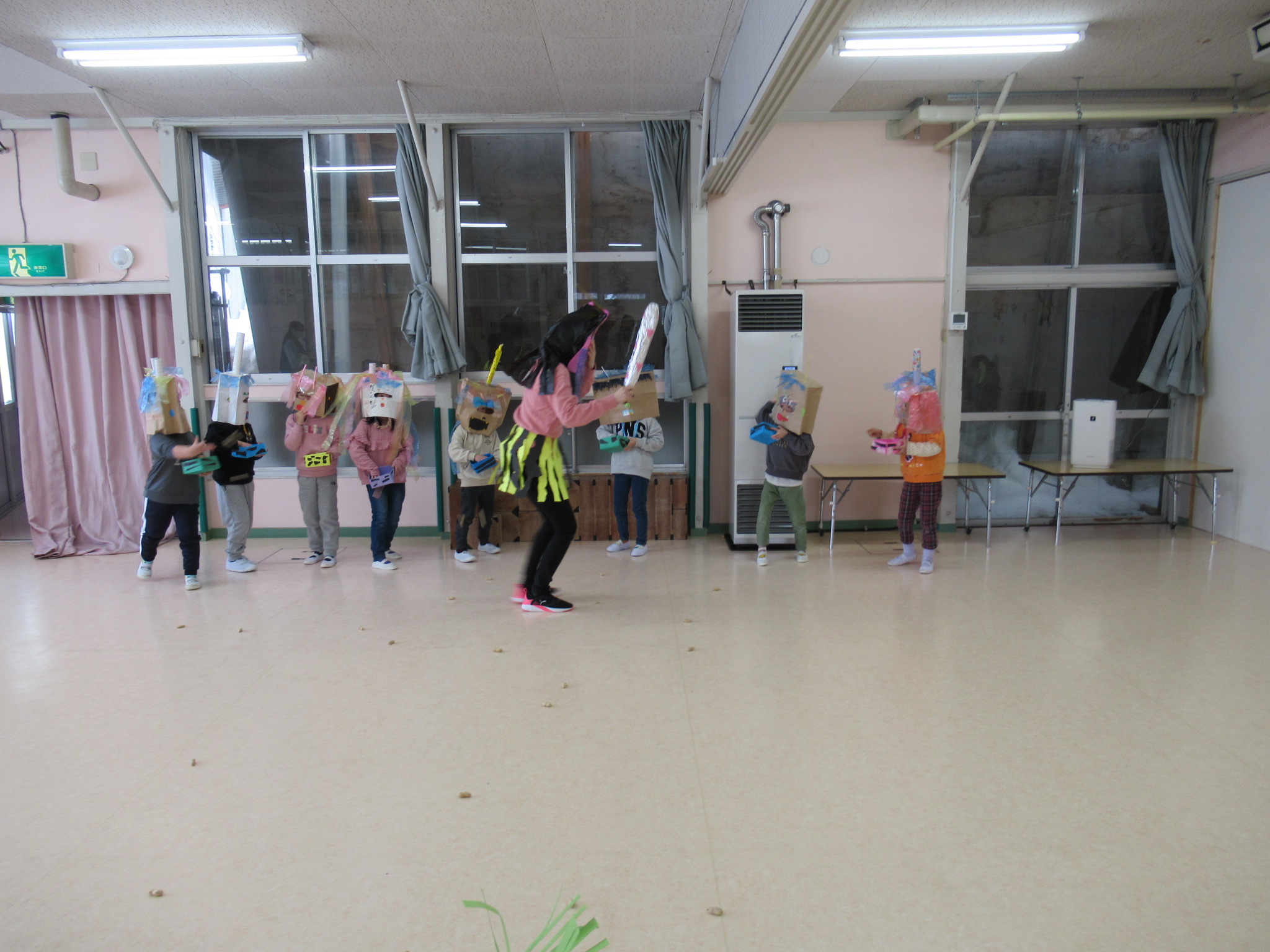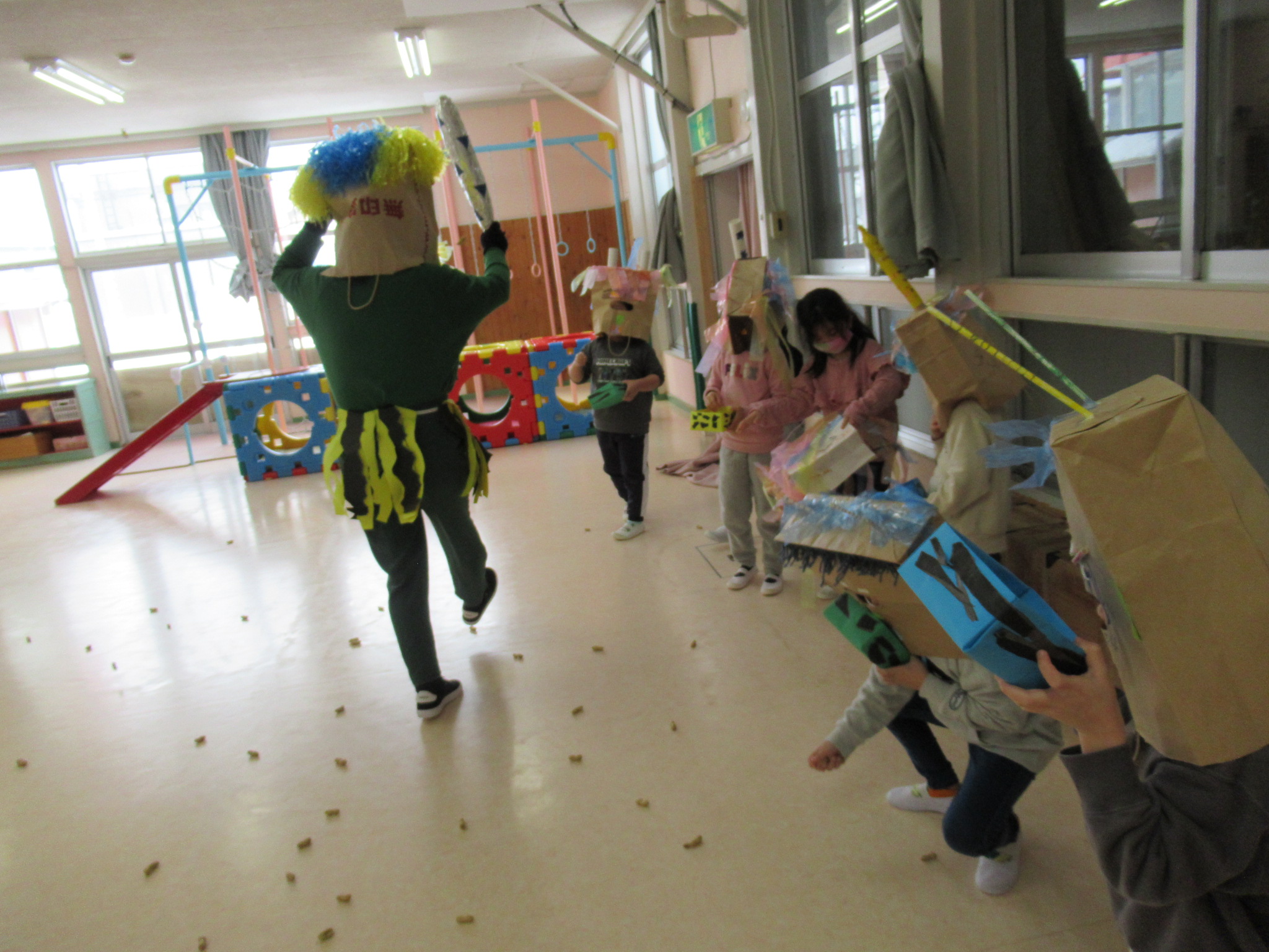 豆まき会では、自分の立ち位置から鬼に豆をまきましたが、