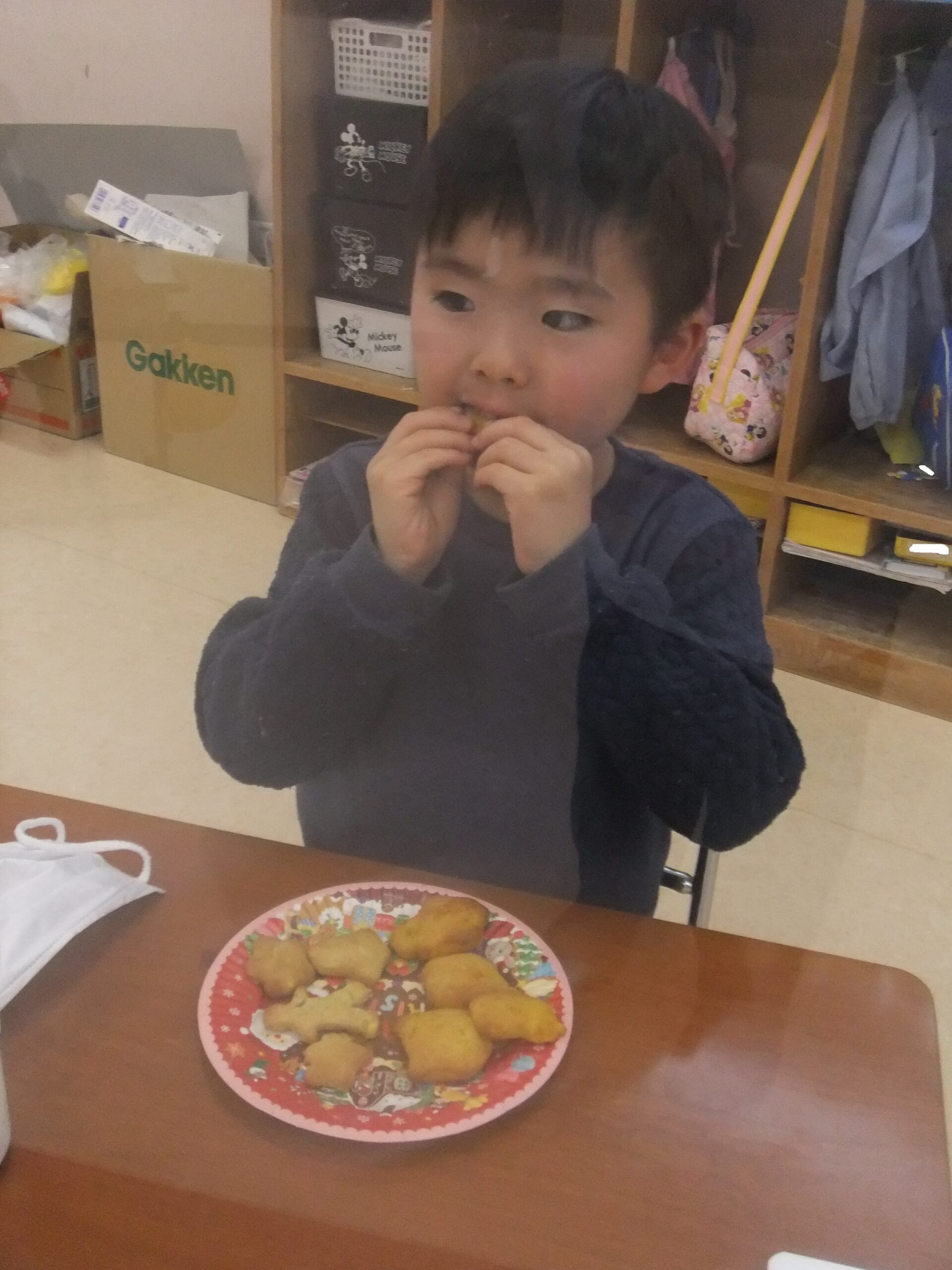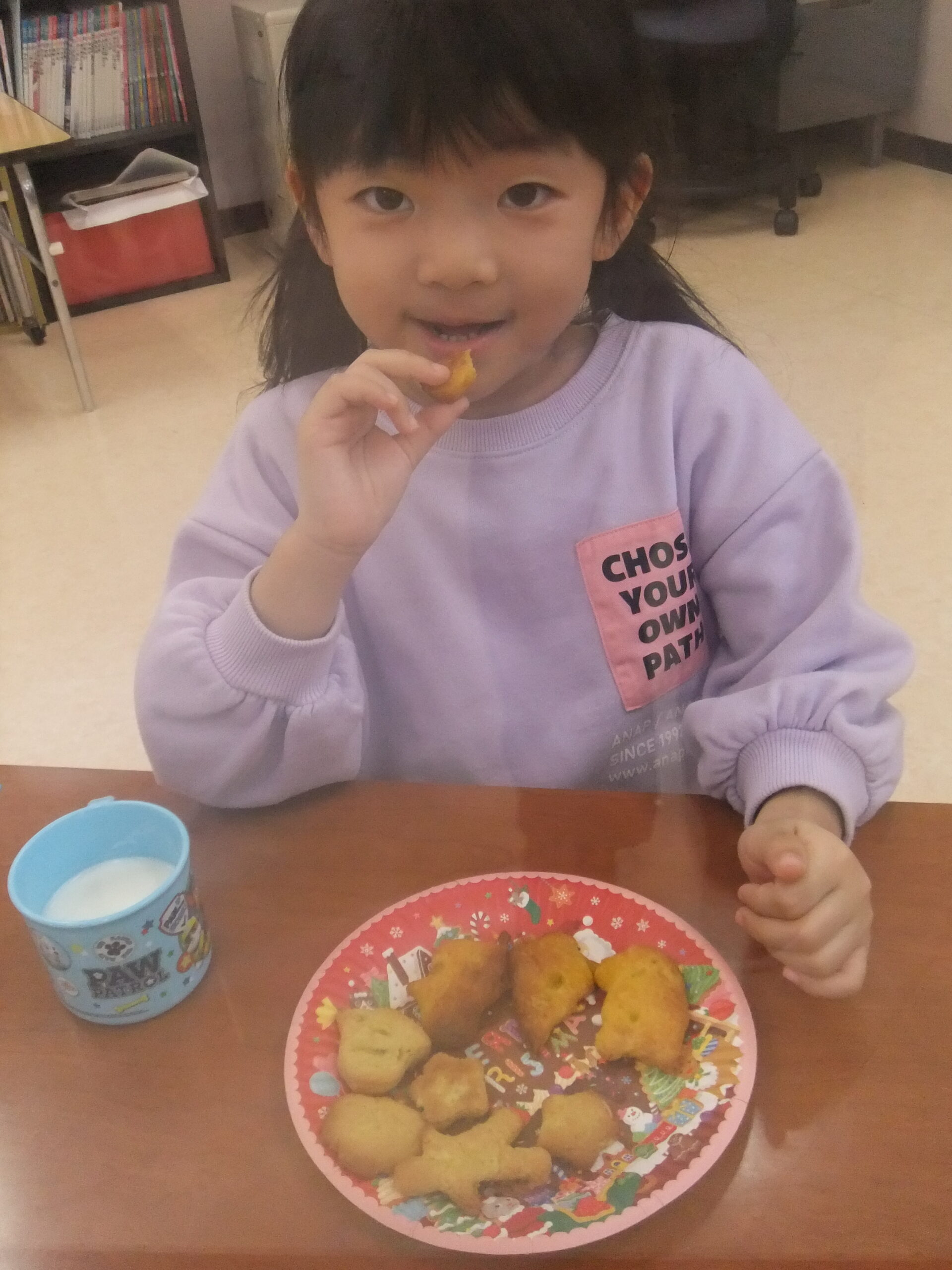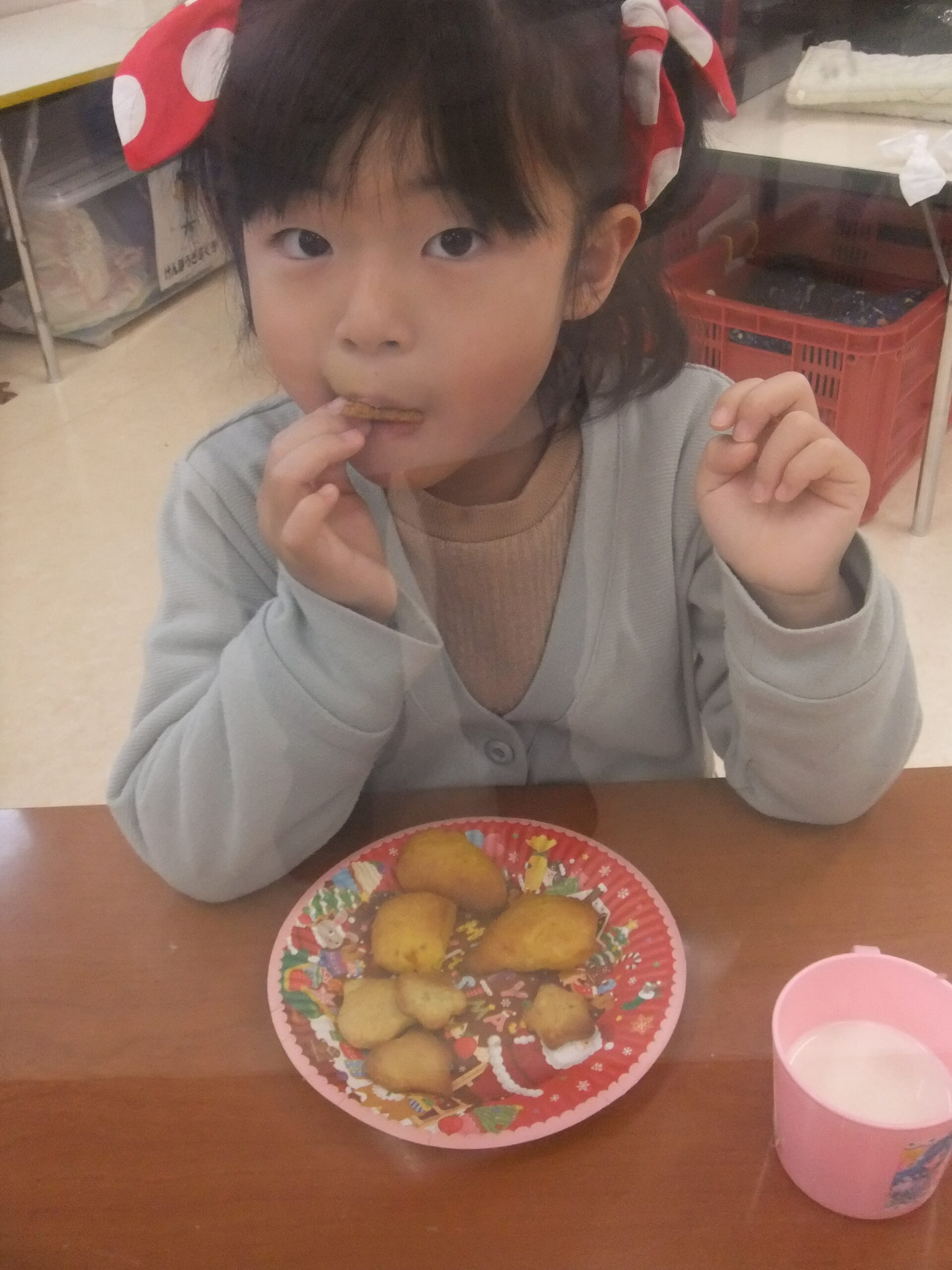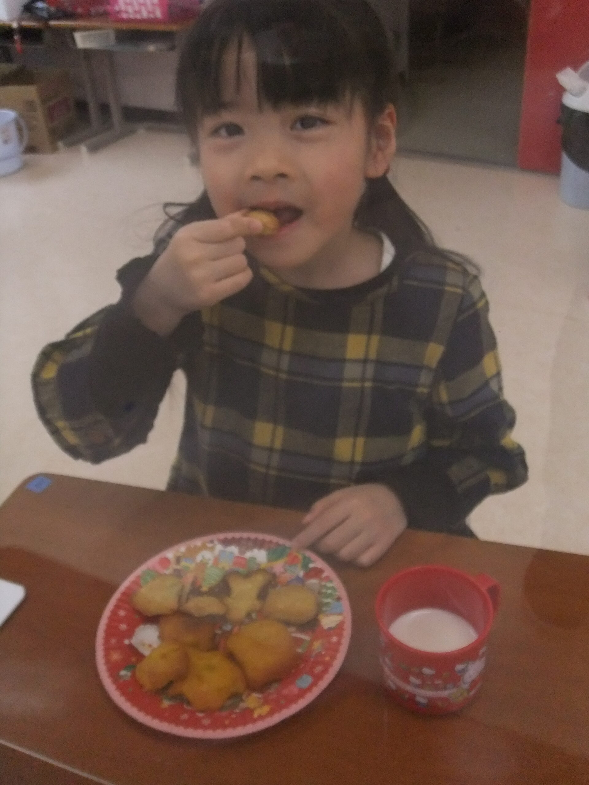 できあがったクッキーをホットミルクと一緒に食べました。