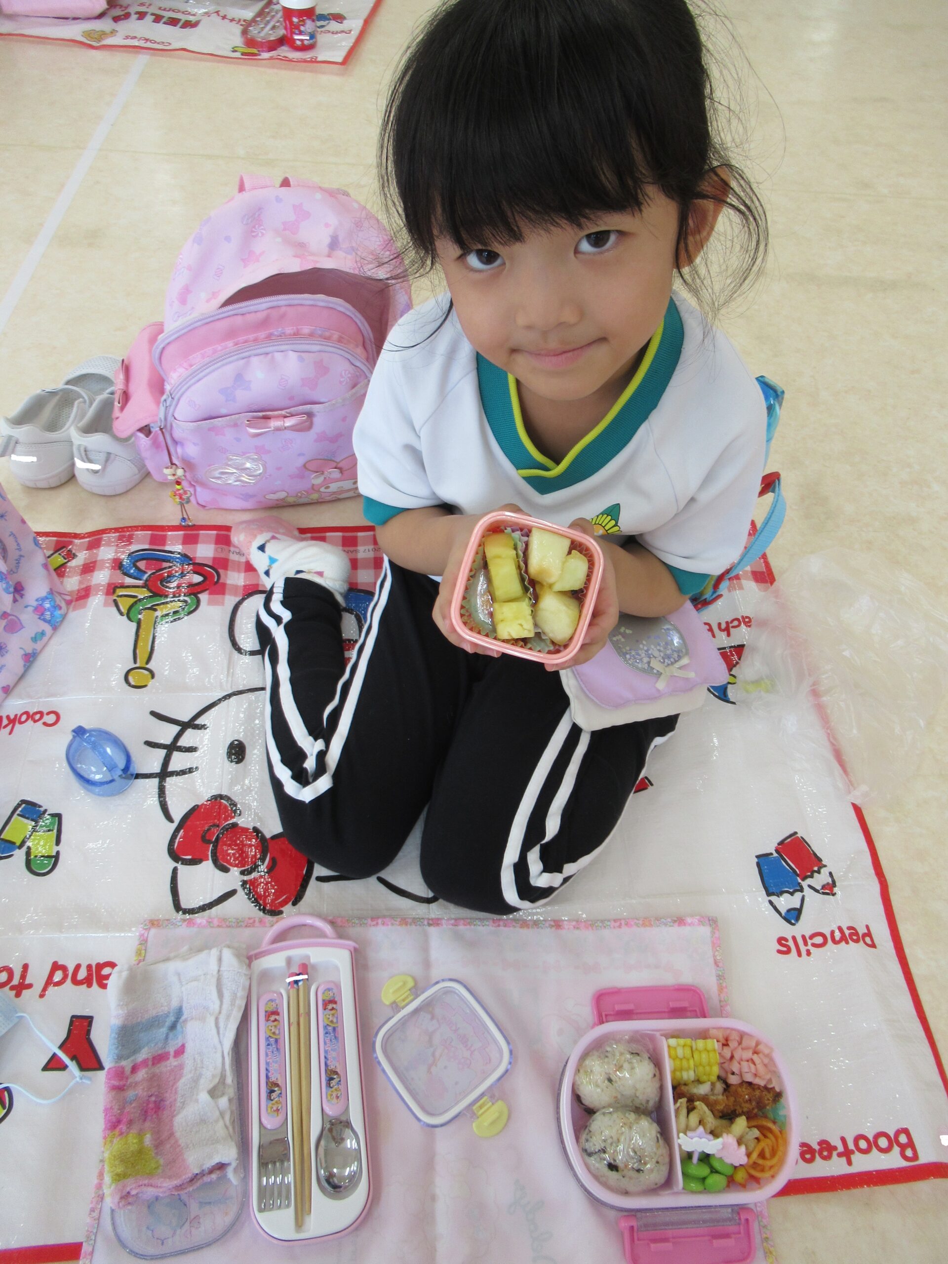 お昼には、ホールに敷物を敷いてお弁当を食べました。