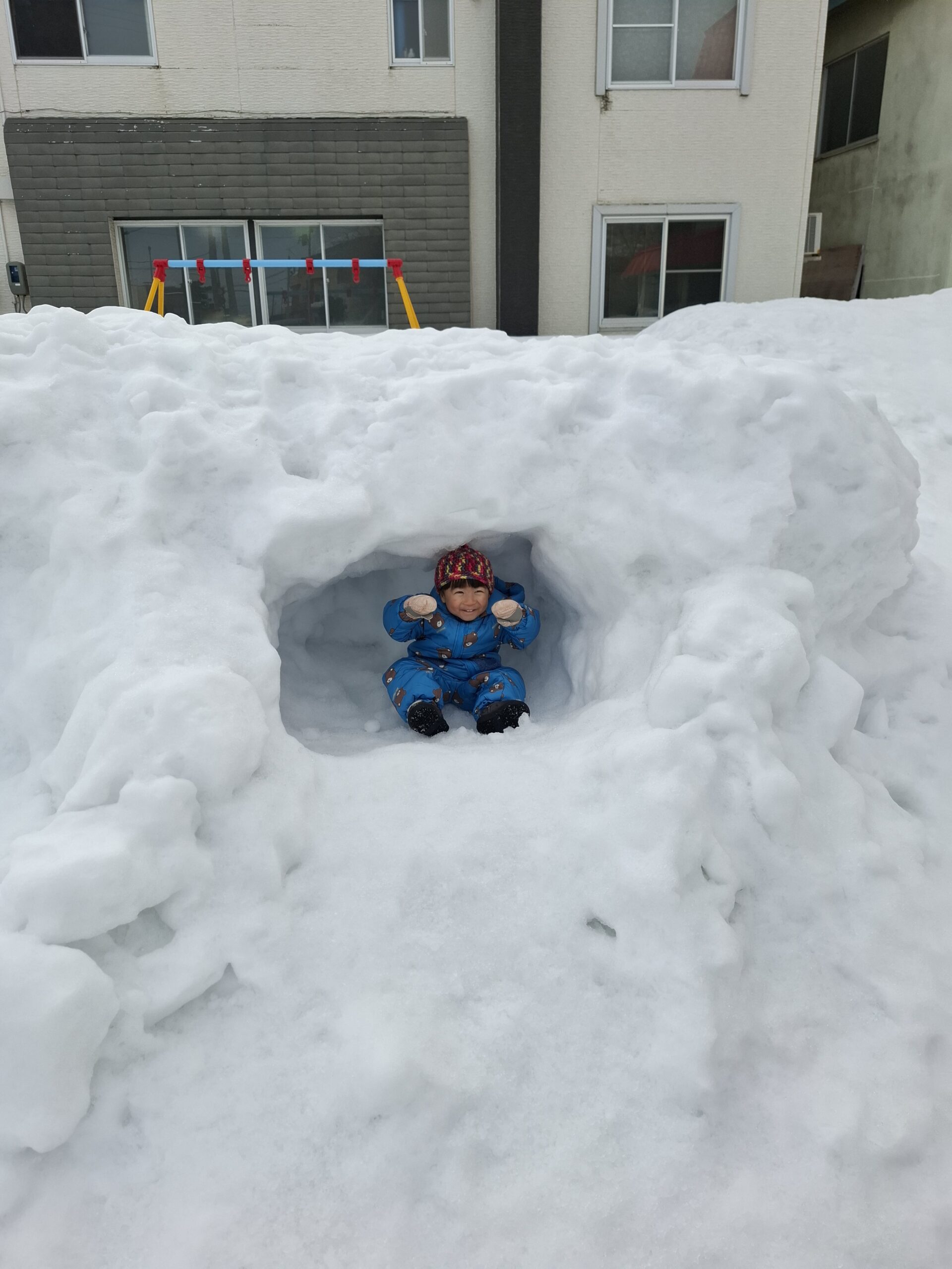 幼稚園のお庭にできた雪の山を登ったり
