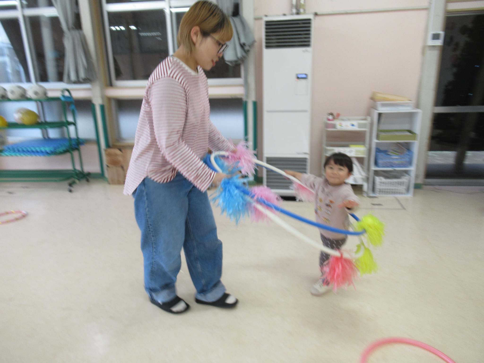 🌻11月28日 運動遊び(フラフープ)🌻 先日、ホールに大きなクリスマスツリーを出しました。 キラキラのオーナメントを子ども達に飾り付けてもらい、 とっても華やかなクリスマスツリーとなりました🎄✨ 子どもたちはサンタさんからのプレゼントを心待ちにしています♡ さて、今回のプチひまわりは、フラフープで運動遊びをしました 奈良先生が持ってきてくれた大きなフリフリがついた フラフープは大人気で、トンネルにしたり、バスごっこをしたりと 楽しみました🚌 次回は、12月19日(木)「楽器で遊ぼう/絵本の読み聞かせ」です! みんなで楽しみましょう♪