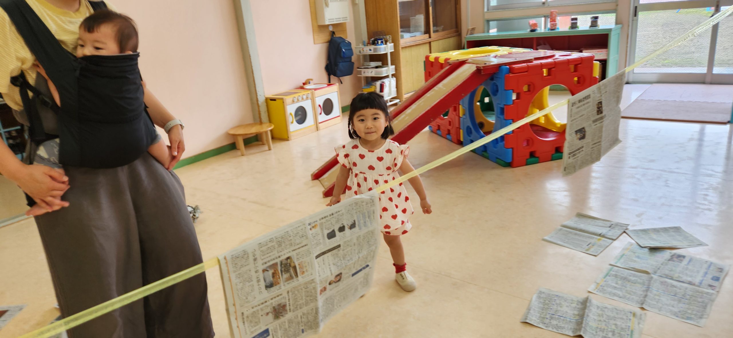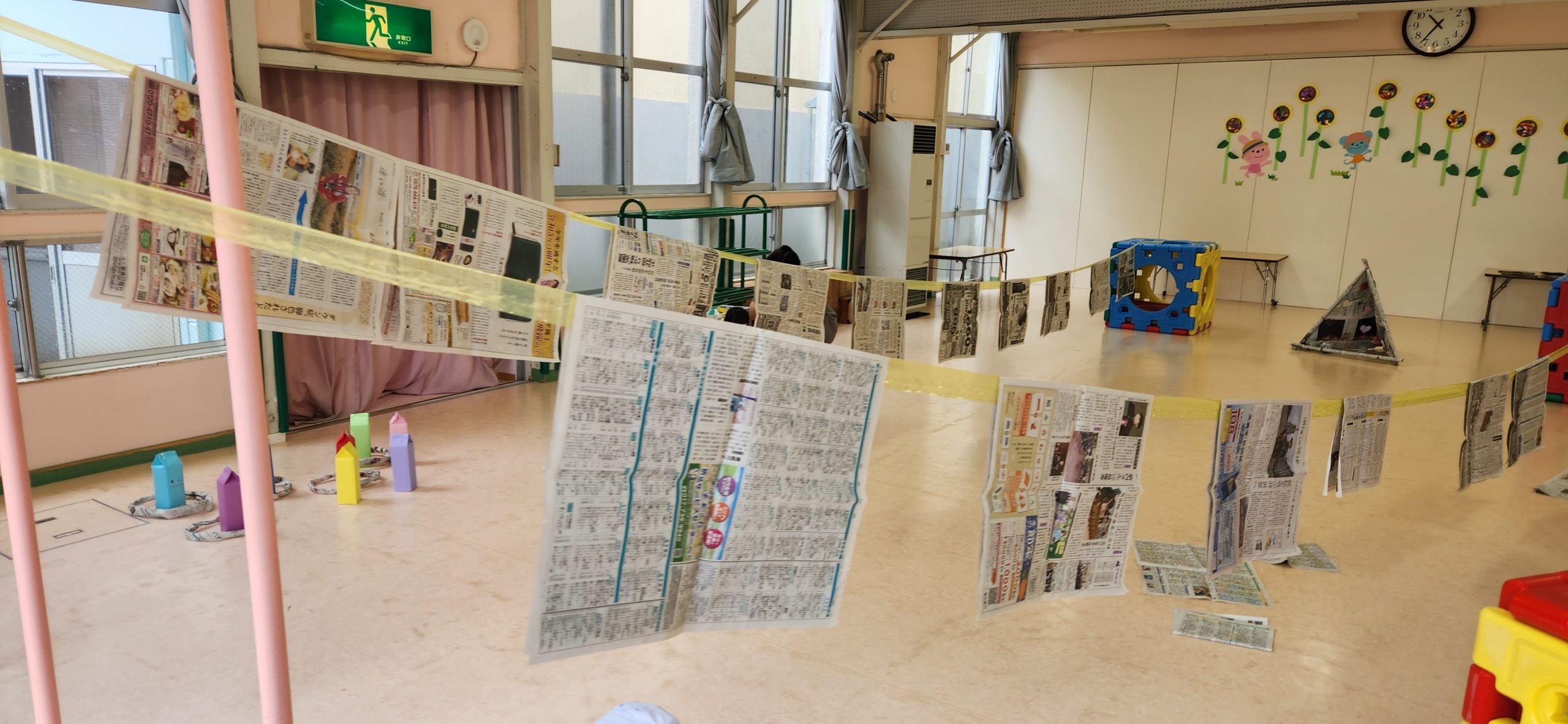 ホールに新聞紙を カーテンみたいにかけたり 床に置いてみたりしました🎵