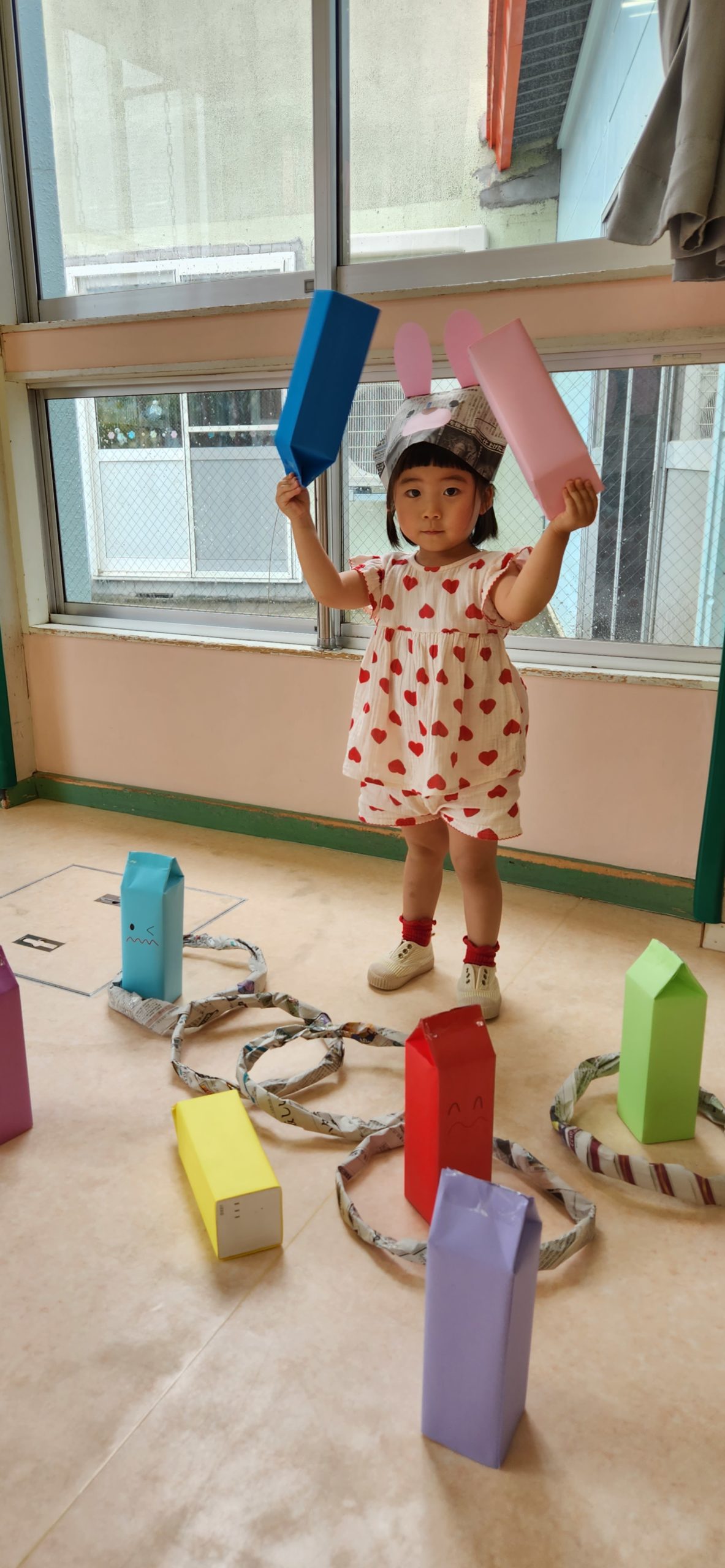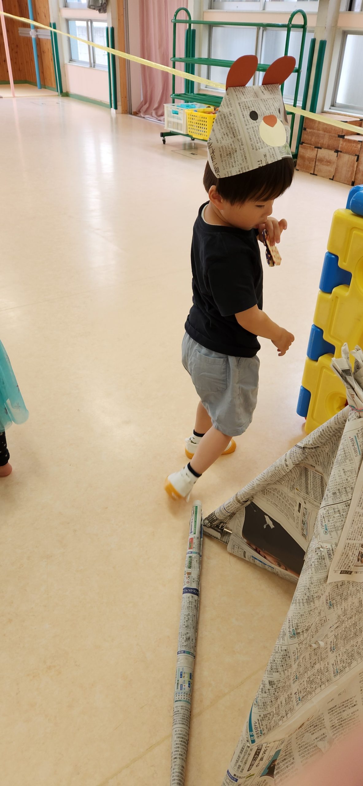 新聞紙で作ったテントに入ってみたり わっかで輪投げをしてみたり~
