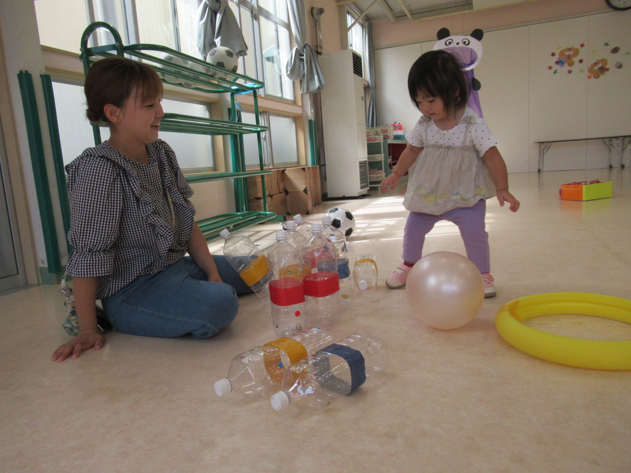 ボールでペットボトルのピンを倒してボーリングをしたり
