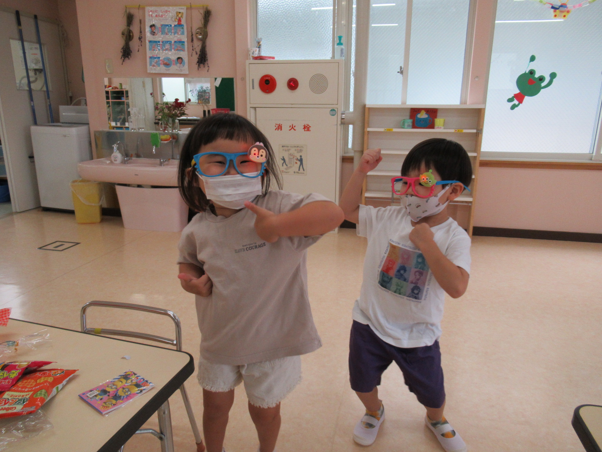 夏祭りでゲットした眼鏡をかけて「yo、yo!」と盛り上がるお友だち!(^^)!