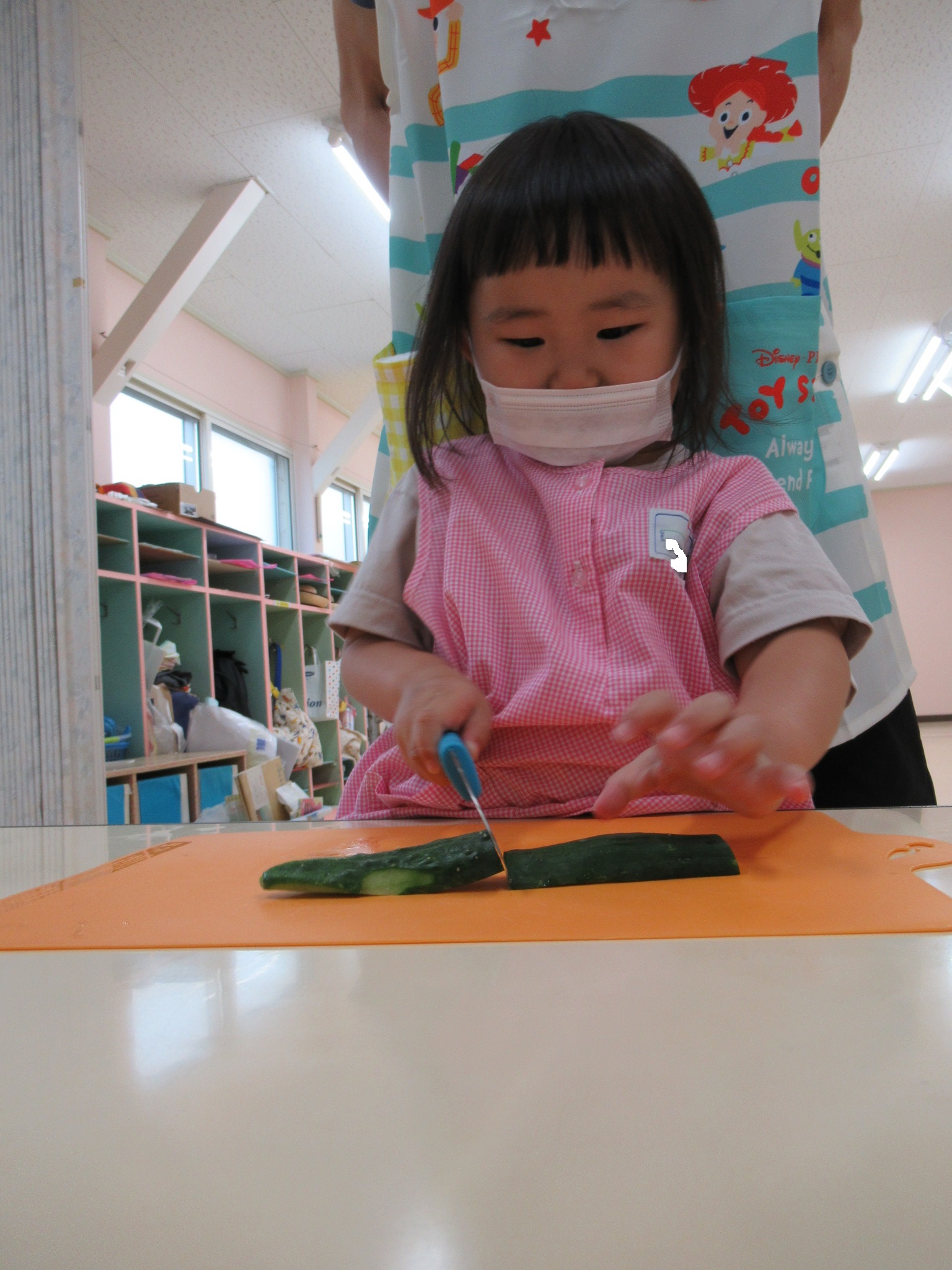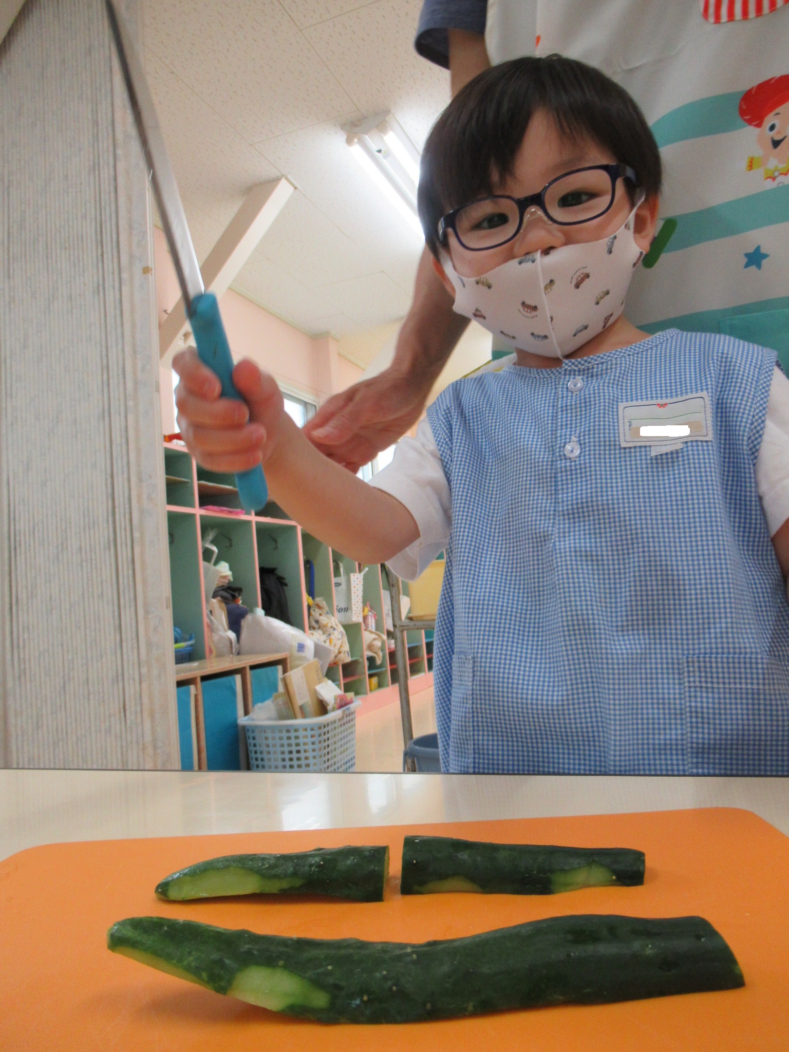 その後、畑でとれたキュウリのカット体験。上手でしょう?