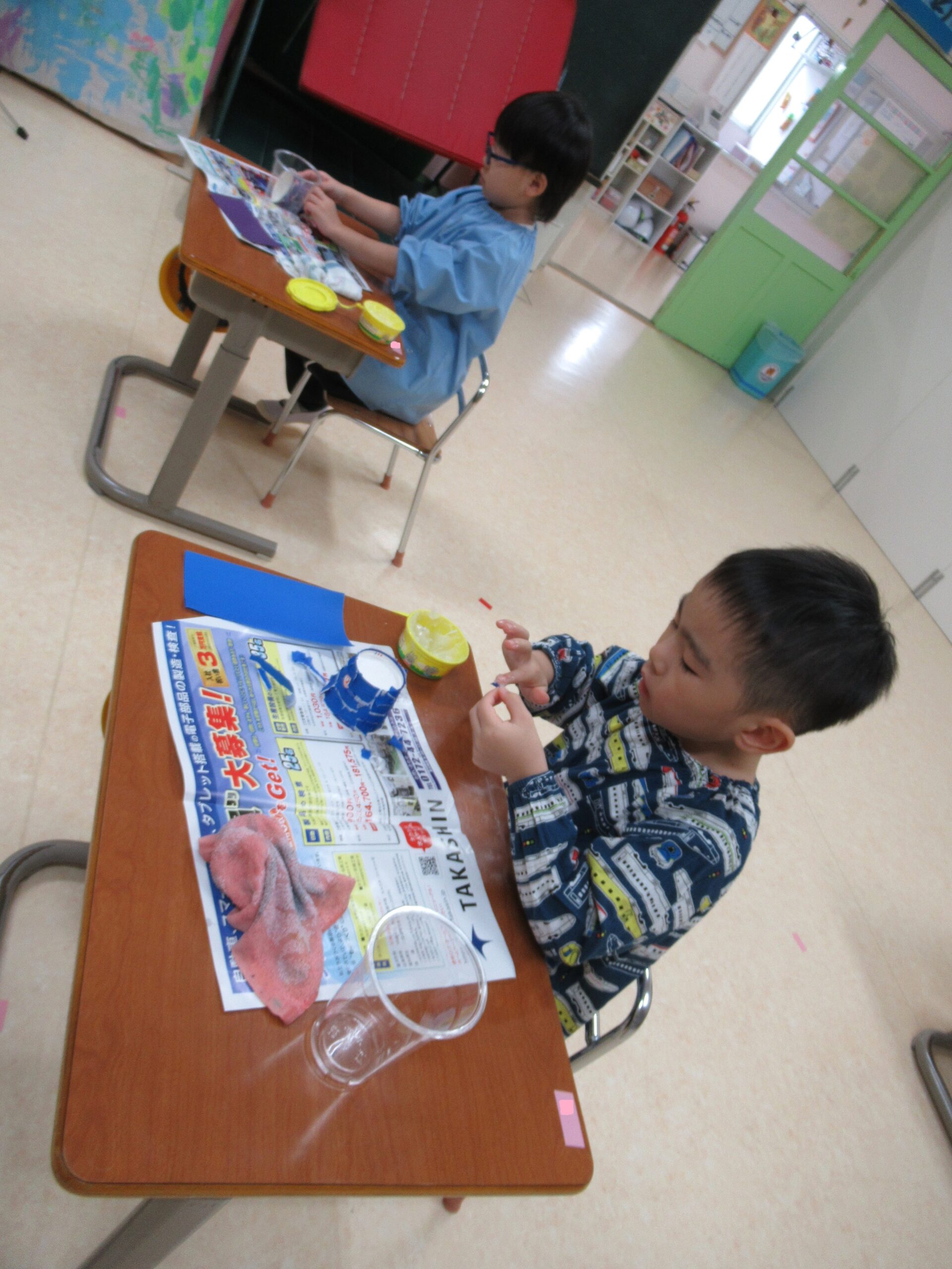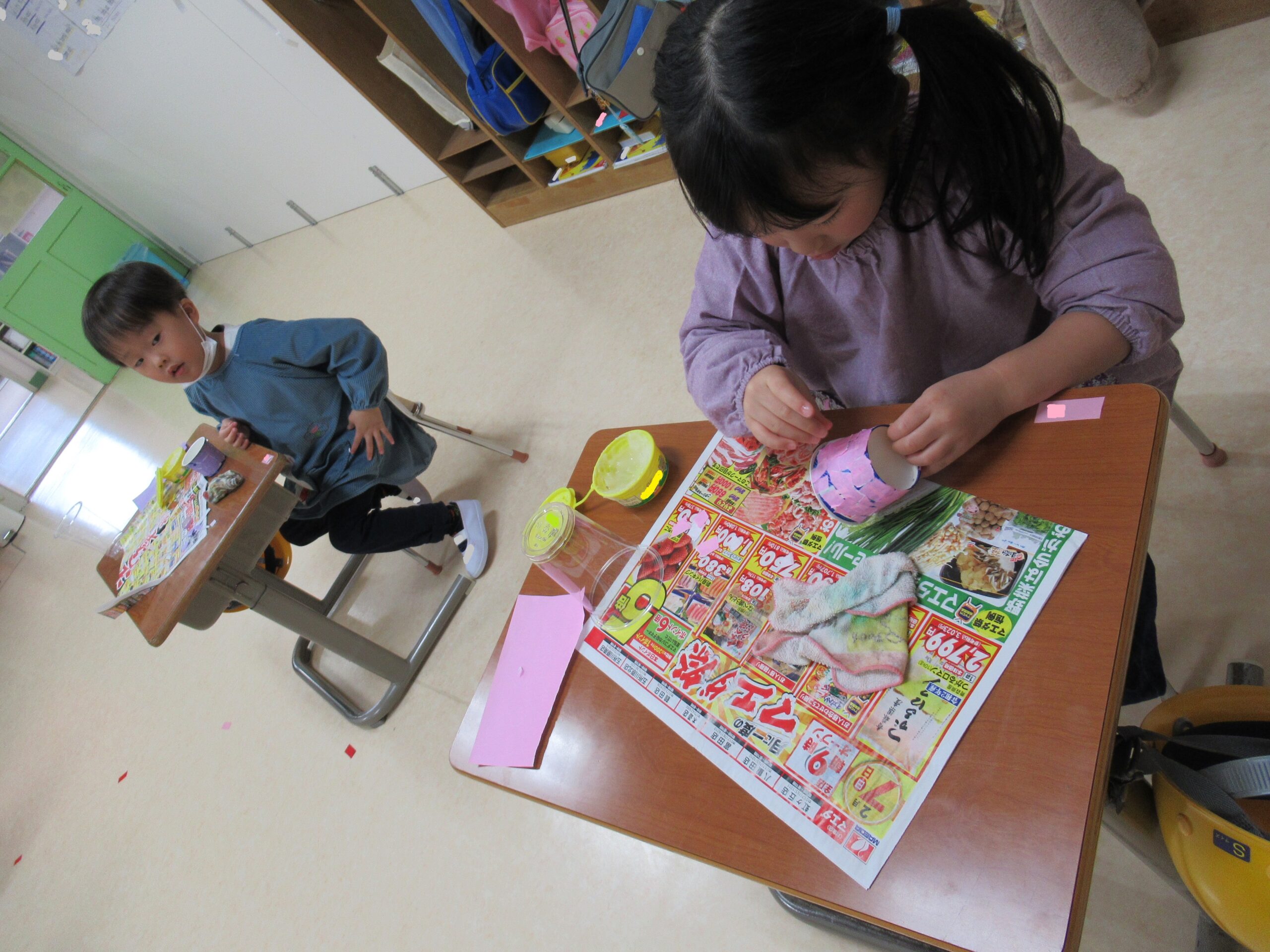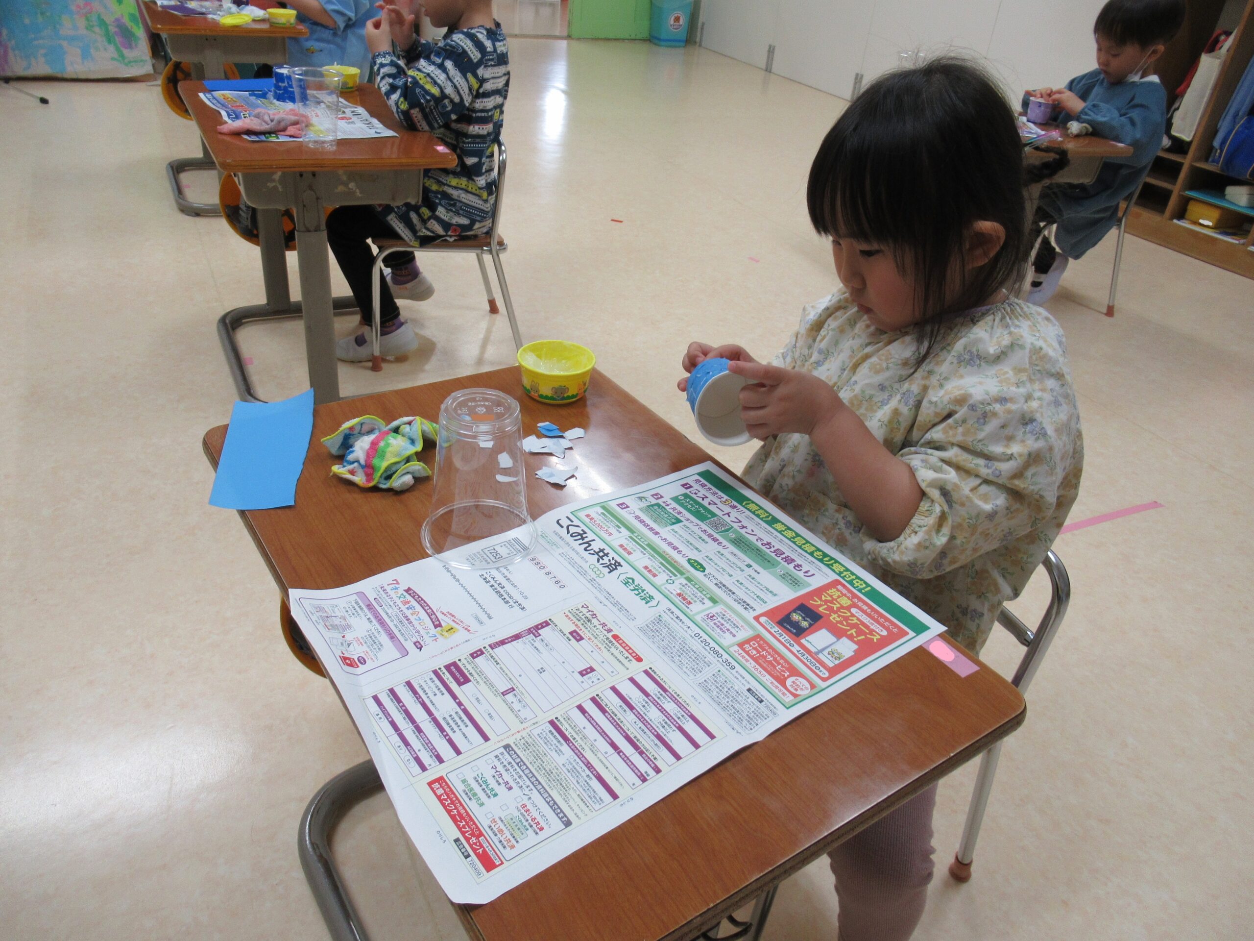また、運動表現で使うチャンピオンカップも自分の好きな色の紙を空き容器に貼って作りました。みんなとっても集中して作業をしていますね!
