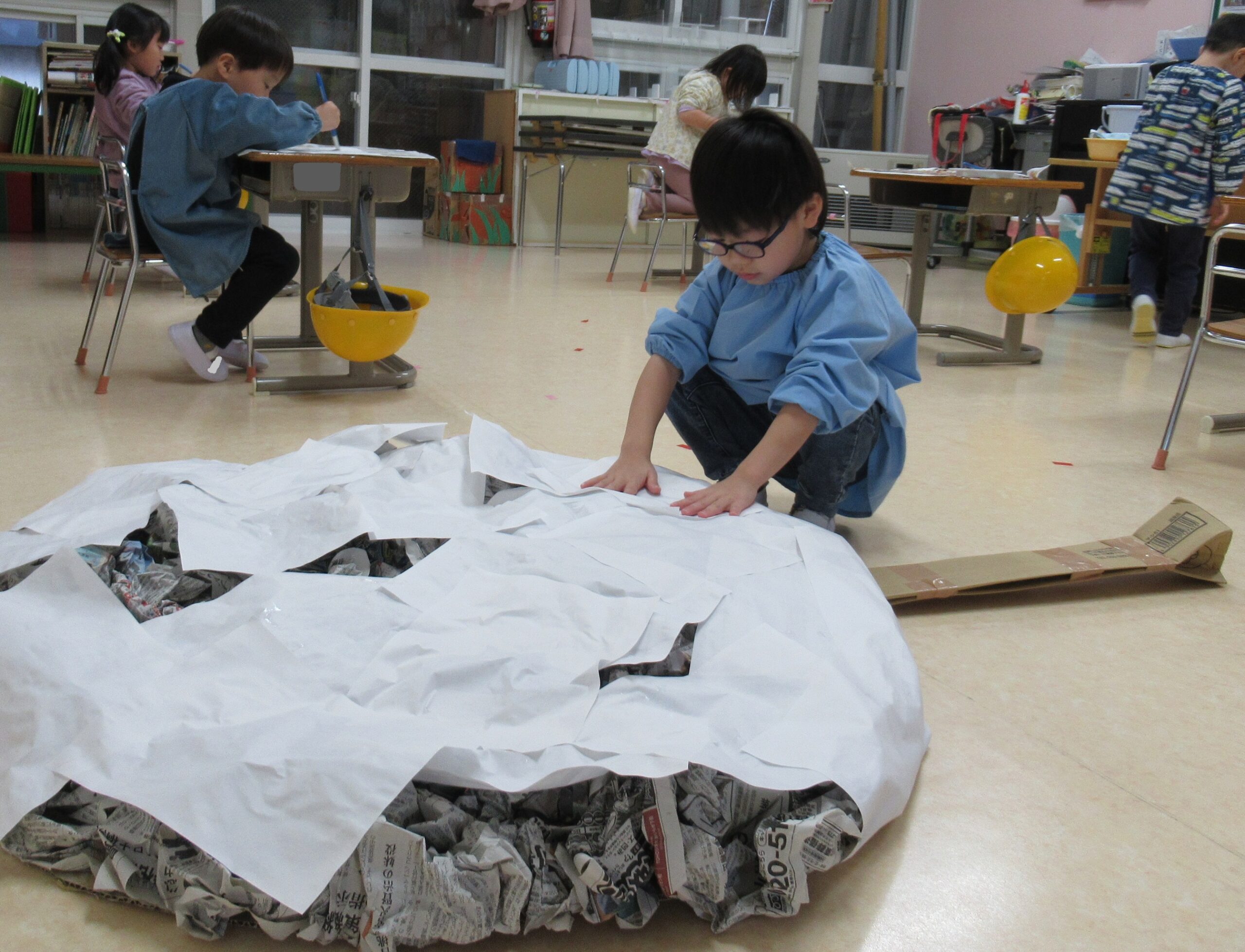 発表会の練習が始まり、英語劇の大道具を自分たちで作っています。